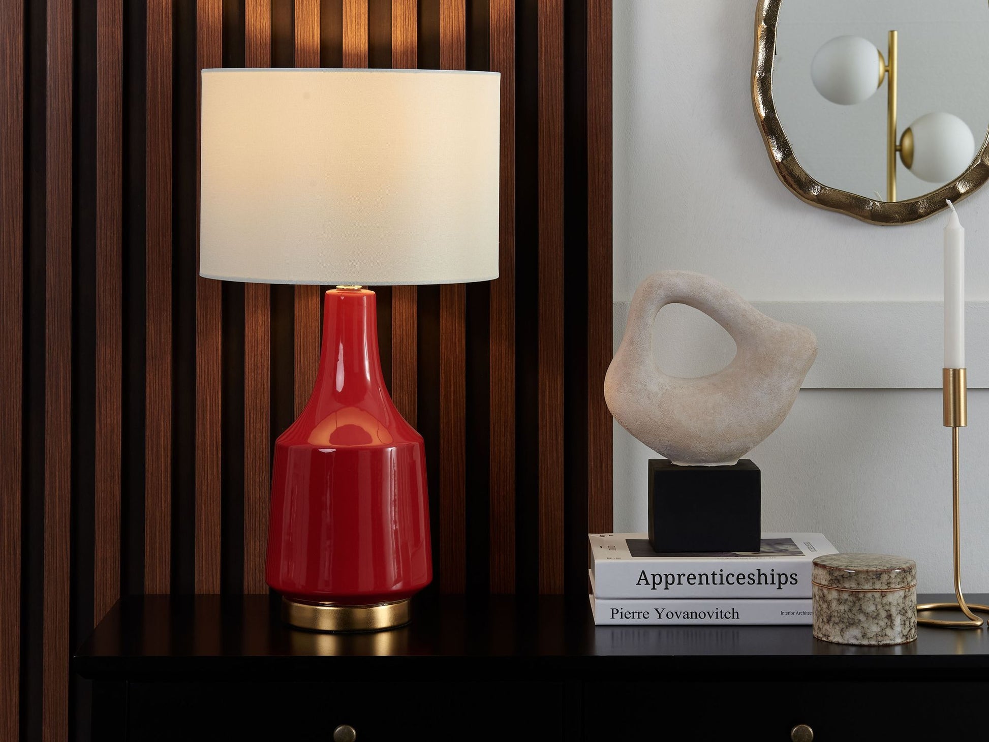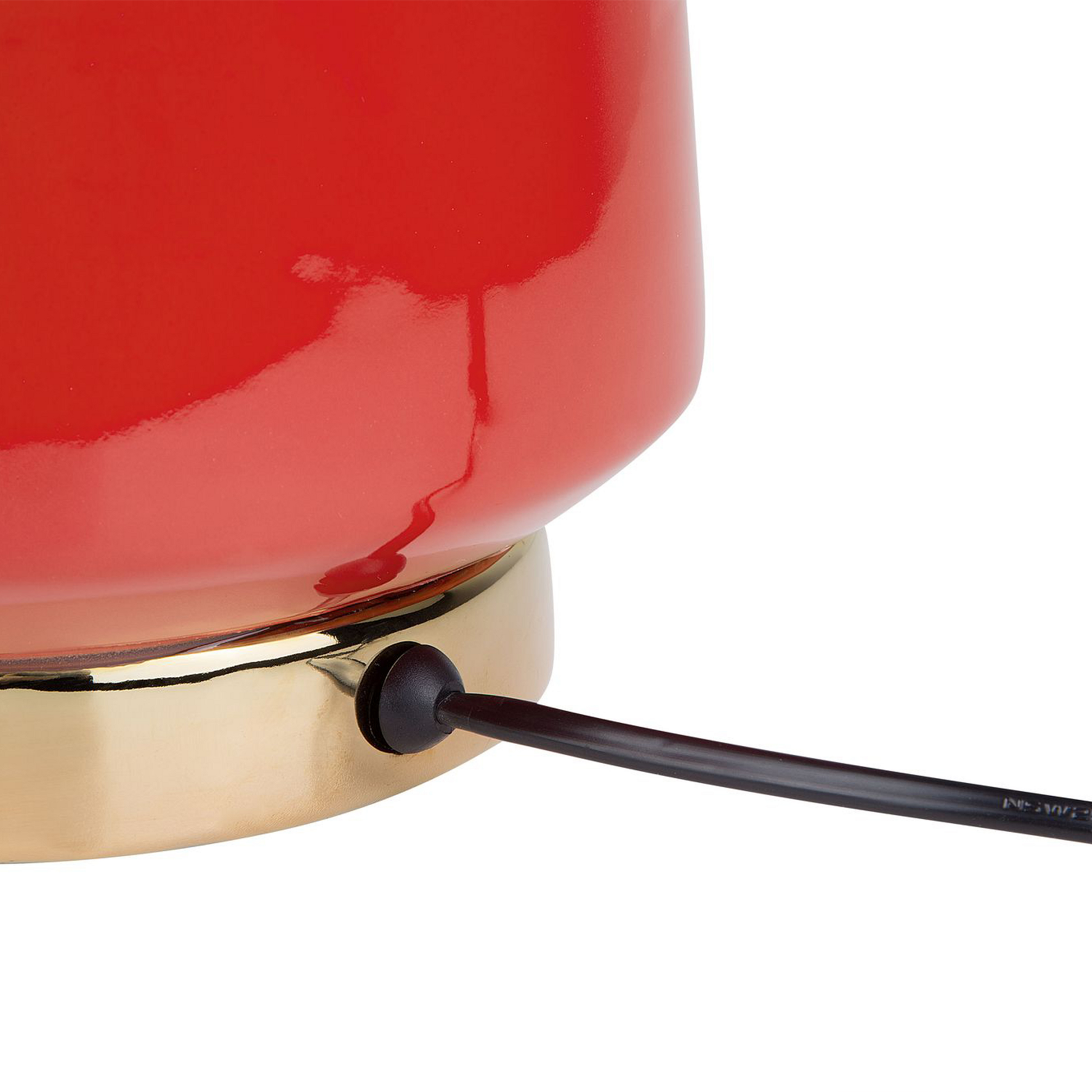 Der leuchtend rote Lampenfuss aus glänzender Keramik, in Kombination mit einem schmalen, goldfarbenen Rand an der Unterseite, verleiht dieser charmanten Tischlampe ihre fröhliche Ausstrahlung. Der runde Lampenschirm aus cremefarbenem Stoff sorgt für helles, warmes Licht. Die Formgebung ist an den beliebten Retro Stil angelehnt und macht diese Lampe zu einem bezaubernden Hingucker. Und da man heutzutage verschiedene Stilrichtungen gerne miteinander mischen darf, passt diese Leuchte zu fast allen Einrichtungsstilen. Das schwarze PVC Kabel ist mit einem Schalter versehen. Material: Keramik. Zusätzliches Material: Poly-Baumwolle. Material Zusammensetzung: 100% Leinen Gewicht: 3.8 Montage: Teilweise montiert Das Angebot beinhaltet: 1 x Tischleuchte, Nicht im Lieferumfang enthalten: Leuchtmittel Höhe: 60 zusätzliche Information: Diese Leuchte ist geeignet für Leuchtmittel der Energieklassen A bis G auf einer Skala von A (sehr effizient) bis G (weniger effizient). Geeignet für: LED Leuchtmittel, Eco-Halogen Leuchtmittel, Energiesparleuchtmittel., Die Stromkabel dürfen nur von einem qualifizierten Elektriker angepasst werden. Breite: 32 Tiefe: 32 Art: Tischleuchte Stil: Modern Allgemeine Farbe: Rot Hauptmaterial: Keramik Fassung: Max. 60 W IP Protection Code: IP 20