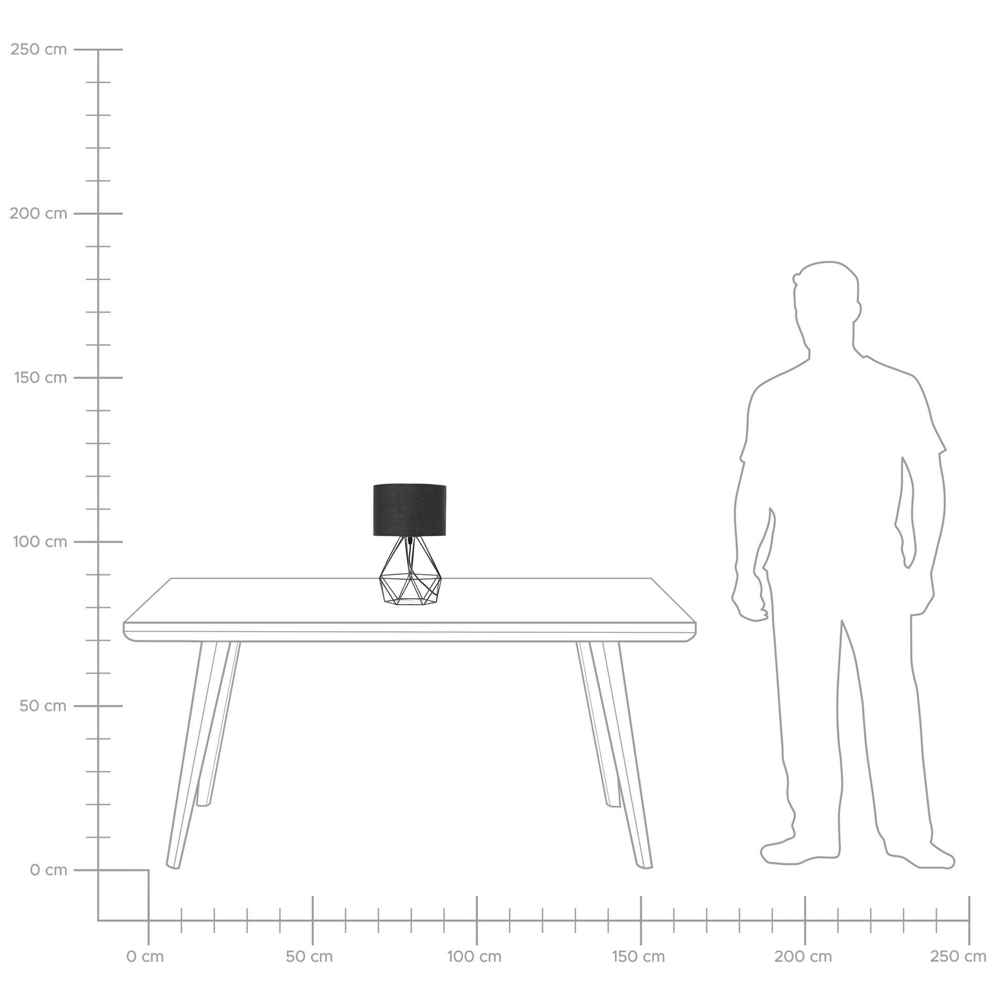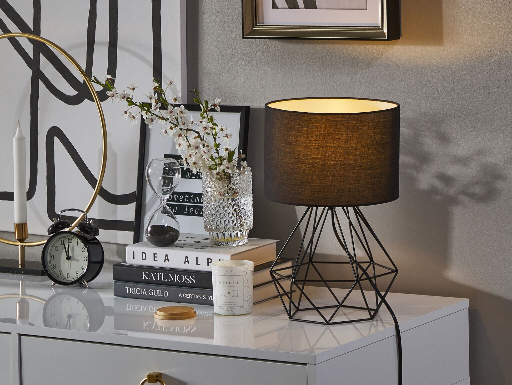 Diese Tischleuchte zieht dank ausgefallenem Design alle Blicke auf sich. Der klassische, runde Lampenschirm aus schwarzem Polyester wird ergänzt durch den Lampenfuss bestehend aus einem schwarzfarbenen, diamantförmigen Metallgitter. Eine moderne Lampe mit zeitloser Eleganz, die in jedes Wohnambiente passt.   Material: Eisen. Zusätzliches Material: Polyester.  Gewicht: 1 Montage: Teilweise montiert Das Angebot beinhaltet: 1 x Tischleuchte, Nicht im Lieferumfang enthalten: Leuchtmittel Höhe: 35 zusätzliche Information: Diese Leuchte ist geeignet für Leuchtmittel der Energieklassen A bis G auf einer Skala von A (sehr effizient) bis G (weniger effizient). Geeignet für: LED Leuchtmittel, Eco-Halogen Leuchtmittel, Energiesparleuchtmittel., Die Stromkabel dürfen nur von einem qualifizierten Elektriker angepasst werden. Breite: 22 Tiefe: 22 Art: Tischleuchte Stil: Modern Allgemeine Farbe: Schwarz Hauptmaterial: Eisen Fassung: Max. 40 W IP Protection Code: IP 20