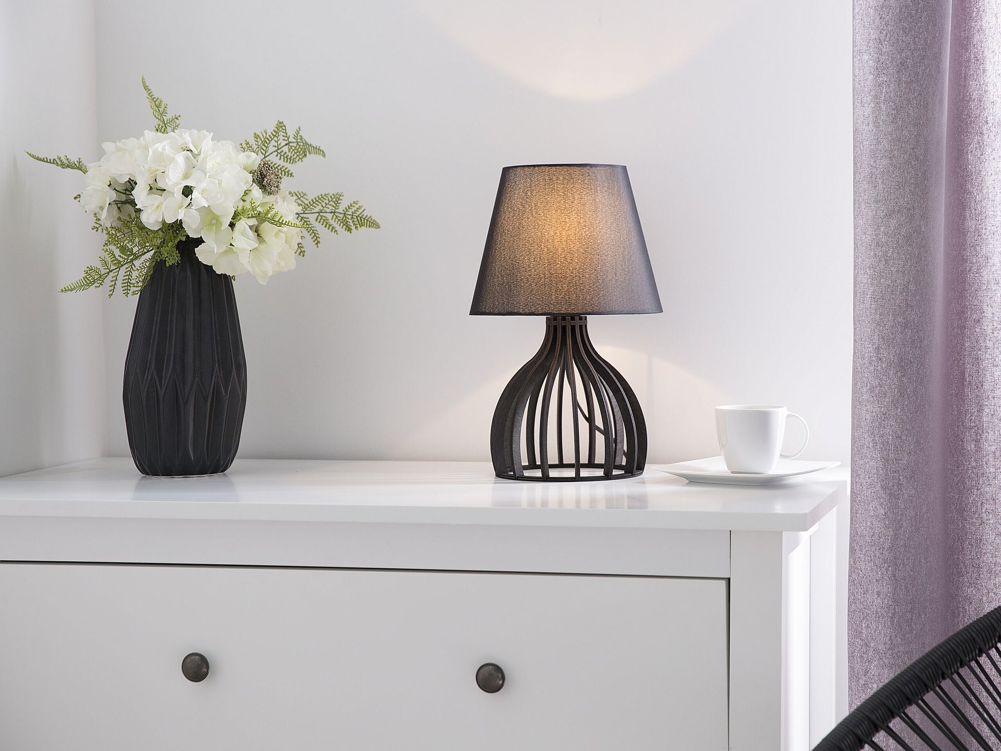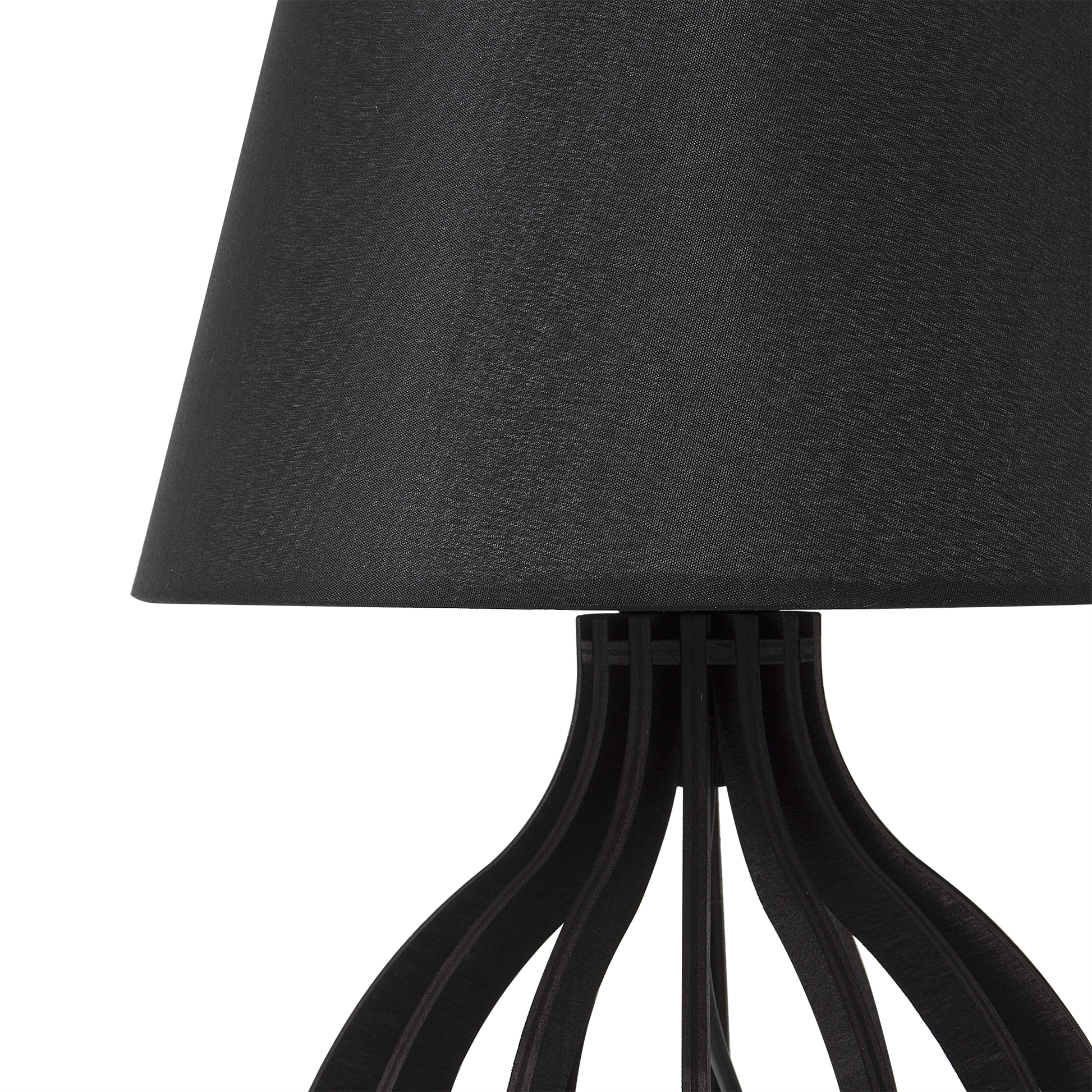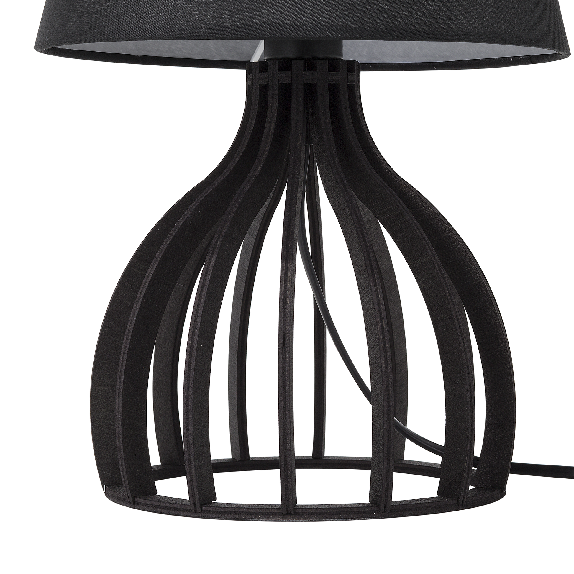 Der runde, klassische Lampenschirm ist aus schwarzer Poly-Baumwolle gefertigt und verbreitet einen angenehmen Lichtschein. Der glockenförmig geschwungene Lampenfuss setzt sich aus schmalen, schwarzen Streben aus Holz zusammen, welche in einer offenen Struktur angeordnet sind. Dadurch hat die funktionale Tischlampe eine leichte Ausstrahlung und passt perfekt platziert als dekoratives Accessoire auf Beistelltischen oder Kommoden in moderne wie auch klassische Wohnbereiche. Die Lampe ist mit einem schwarzen Kabel mit Schalter versehen.  Material: Sperrholz. Zusätzliches Material: Poly-Baumwolle.  Gewicht: 0.5 Montage: Teilweise montiert Das Angebot beinhaltet: 1 x Tischleuchte, Nicht im Lieferumfang enthalten: Leuchtmittel Höhe: 36 zusätzliche Information: Diese Leuchte ist geeignet für Leuchtmittel der Energieklassen A bis G auf einer Skala von A (sehr effizient) bis G (weniger effizient). Geeignet für: LED Leuchtmittel, Eco-Halogen Leuchtmittel, Energiesparleuchtmittel., Die Stromkabel dürfen nur von einem qualifizierten Elektriker angepasst werden. Breite: 22 Tiefe: 22 Art: Tischleuchte Stil: Modern Allgemeine Farbe: Schwarz Hauptmaterial: Sperrholz Fassung: Max. 40 W IP Protection Code: IP 20