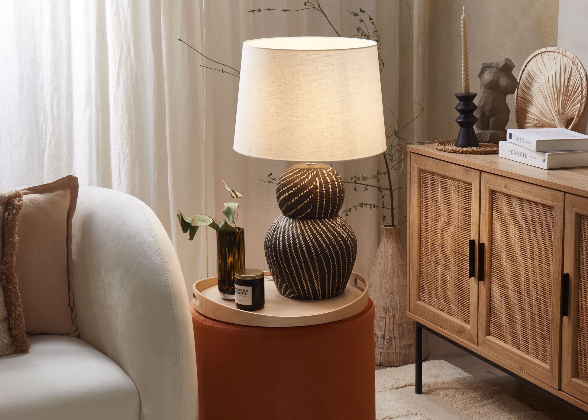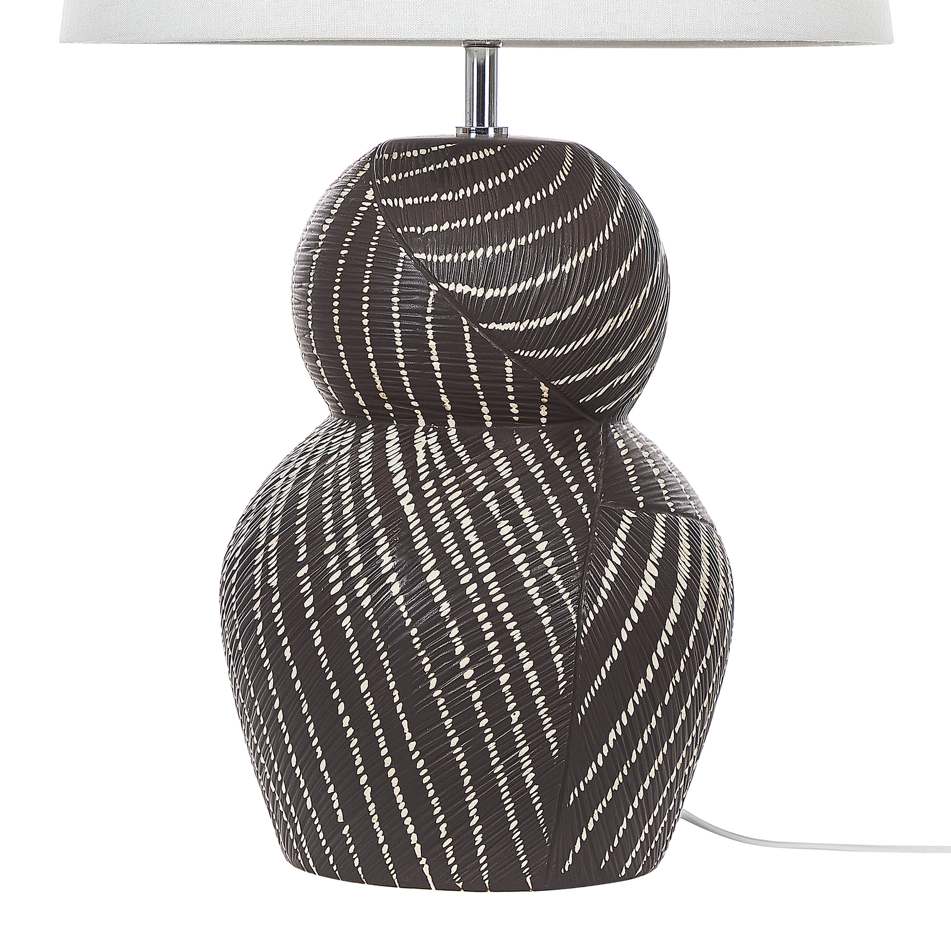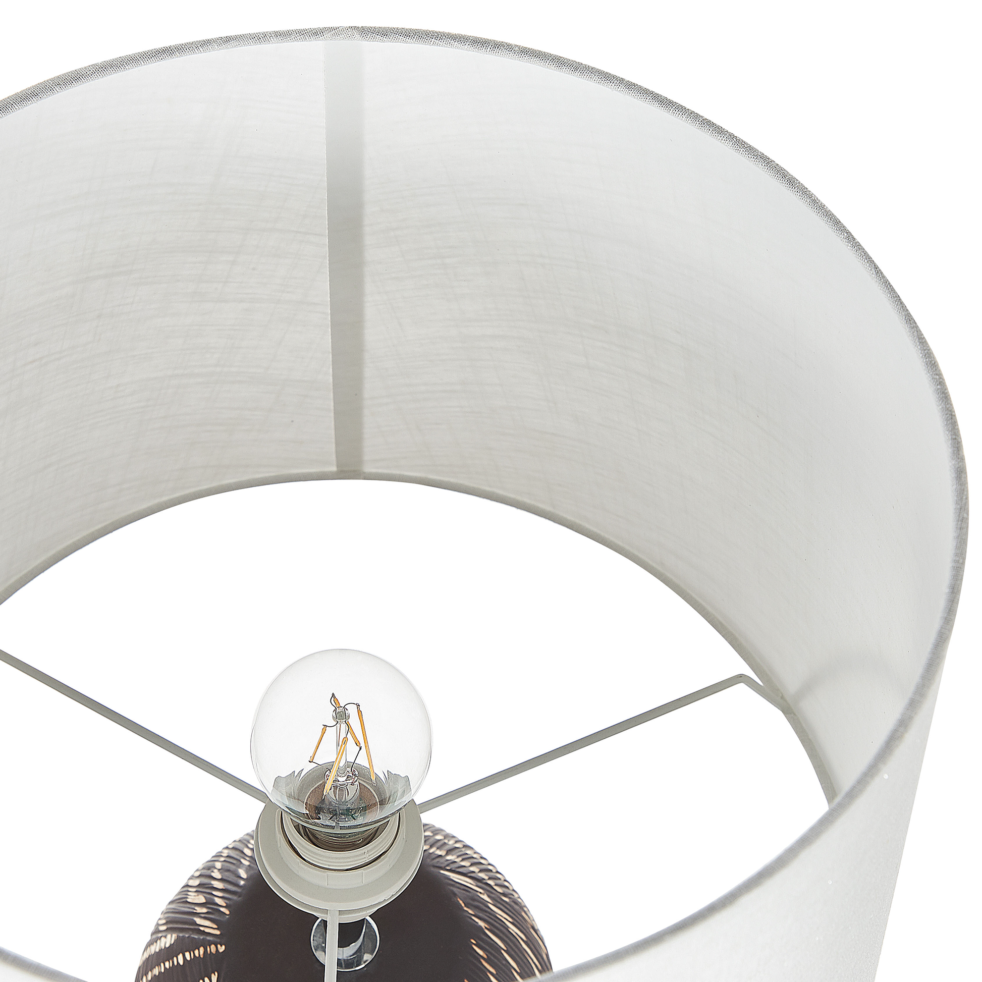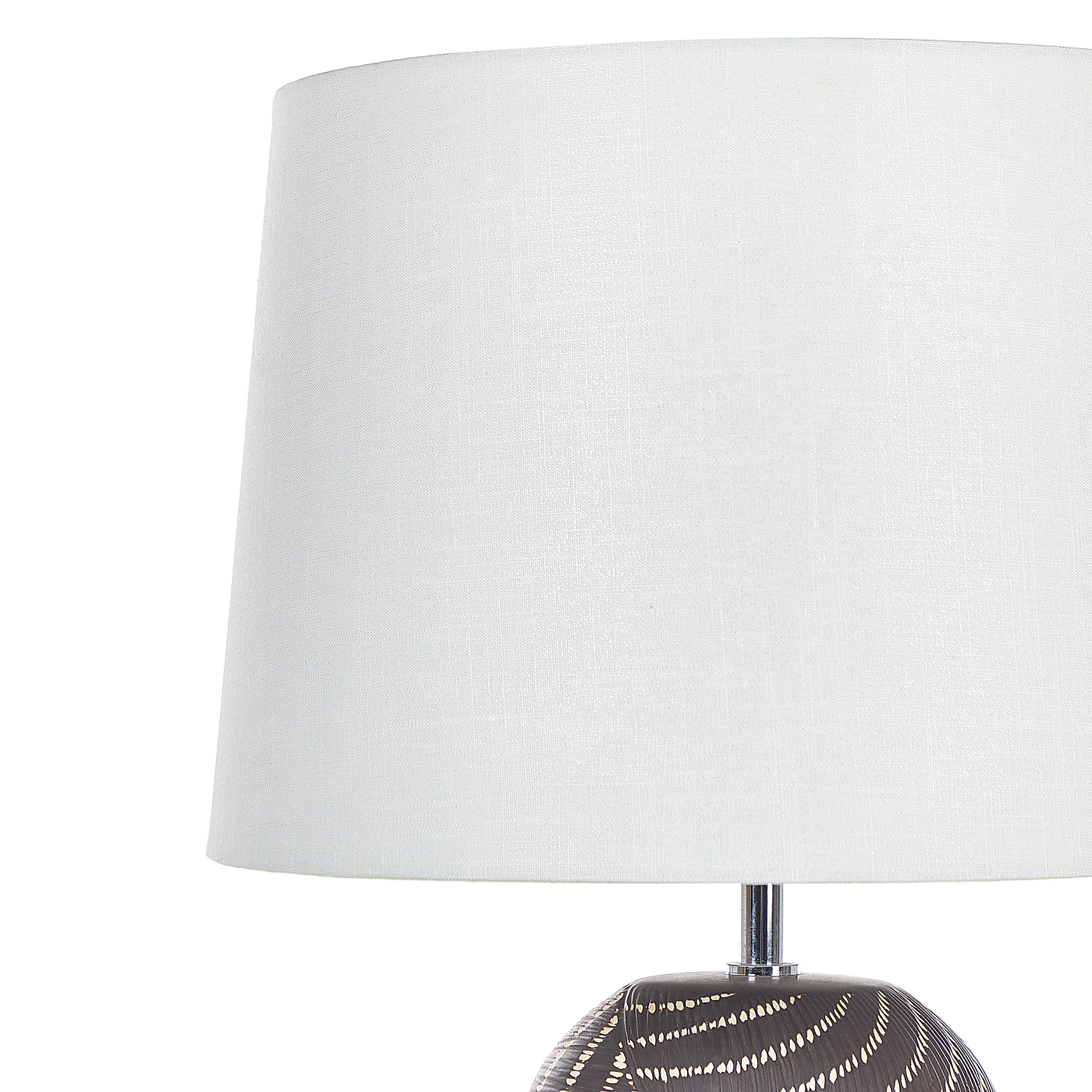 Nehmen Sie diese schöne Lampe mit nach Hause, um Ihrer Inneneinrichtung einen Hauch von Eleganz zu verleihen. Mit ihrem strukturierten Keramikfuss wird sie zum Blickfang, egal ob sie auf einem Couchtisch oder einem Sideboard platziert wird. Dank ihres Stoffschirms spendet sie dem Raum ein angenehmes Licht, das perfekt für die abendliche Erholung ist. Material: Keramik. Zusätzliches Material: Baumwolle, Jute. Material Zusammensetzung: 65% Jute, 35% Baumwolle Gewicht: 3 Montage: Teilweise montiert Das Angebot beinhaltet: 1 x Tischleuchte, Nicht im Lieferumfang enthalten: Leuchtmittel Höhe: 63 zusätzliche Information: Diese Leuchte ist geeignet für Leuchtmittel der Energieklassen A bis G auf einer Skala von A (sehr effizient) bis G (weniger effizient). Geeignet für: LED Leuchtmittel, Eco-Halogen Leuchtmittel, Energiesparleuchtmittel., Die Stromkabel dürfen nur von einem qualifizierten Elektriker angepasst werden., Da jedes Produkt handgefertigt wird, kann es zu kleineren Abweichungen in der Farbe und der äusseren Struktur kommen. Diese Abweichungen stellen keinen Qualitätsmangel dar, sondern sind eine warentypische Eigenschaft. Breite: 38 Tiefe: 38 Art: Tischleuchte Stil: Modern Allgemeine Farbe: Schwarz Schatten: Cremeweiss Hauptmaterial: Keramik Fassung: 40 W IP Protection Code: IP 20