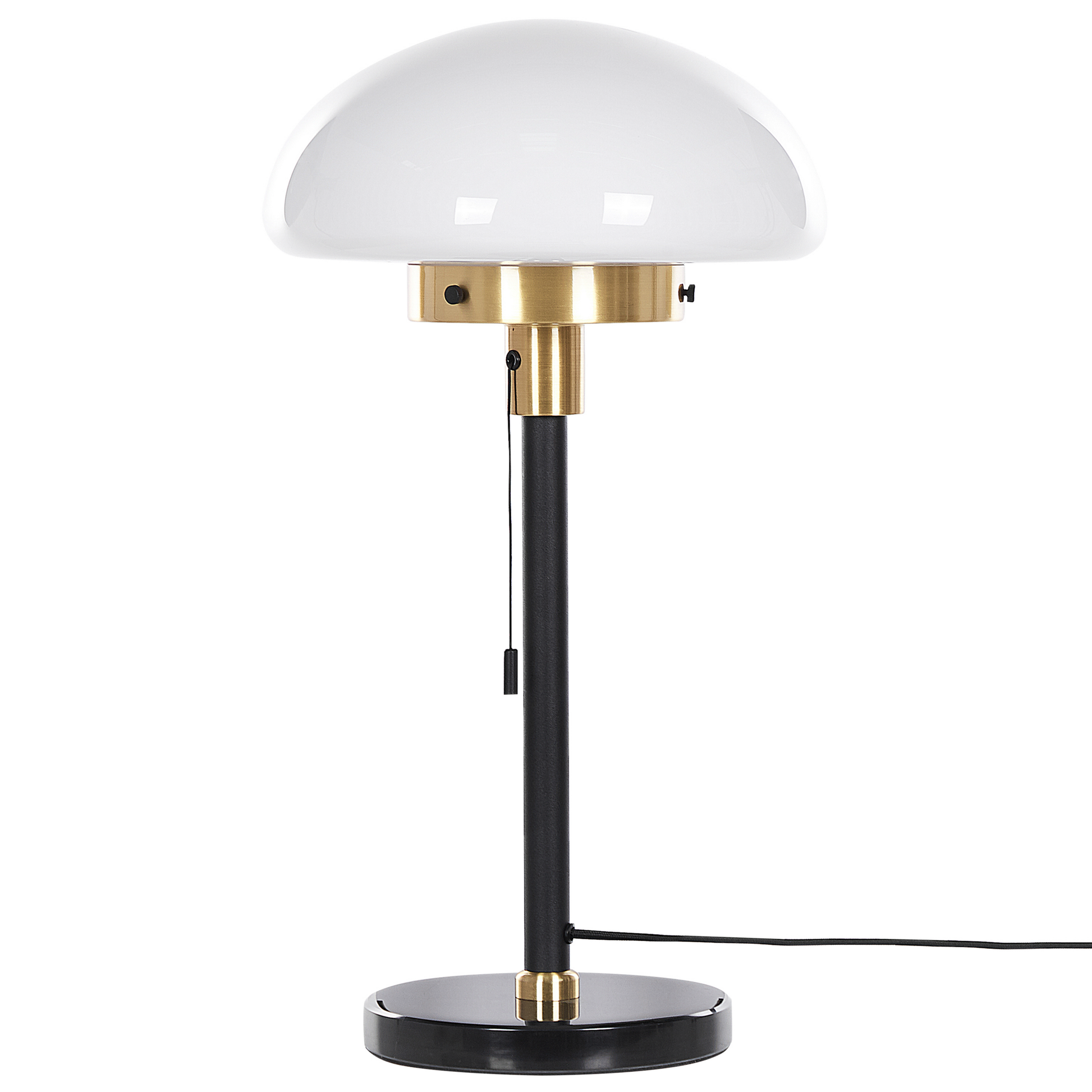 Schmücken Sie Ihr Zuhause mit einer dekorativen Tischleuchte, die dank ihres klassischen, retro-inspirierten Designs Räume in verschiedenen Stilen gut ergänzt. Die goldfarbenen Elemente und der Zugschalter sorgen für einen edlen Touch, der in Kombination mit dem Halbkugel-Glasschirm eine Vintage-Atmosphäre erzeugt. Stellen Sie diese Lampe auf einen Beistelltisch oder neben Ihr Bett und geniessen Sie das angenehme Licht, wenn es draussen dunkel wird.  Material: Eisen. Zusätzliches Material: Glas, Marmor.  Gewicht: 4 Montage: Teilweise montiert Das Angebot beinhaltet: 1 x Tischleuchte, Nicht im Lieferumfang enthalten: Leuchtmittel Höhe: 66 zusätzliche Information: Diese Leuchte ist geeignet für Leuchtmittel der Energieklassen A bis G auf einer Skala von A (sehr effizient) bis G (weniger effizient). Geeignet für: LED Leuchtmittel, Eco-Halogen Leuchtmittel, Energiesparleuchtmittel., Die Stromkabel dürfen nur von einem qualifizierten Elektriker angepasst werden. Breite: 28 Tiefe: 28 Art: Tischleuchte Stil: Retro Allgemeine Farbe: Schwarz Hauptmaterial: Eisen Fassung: 40 W IP Protection Code: IP 20