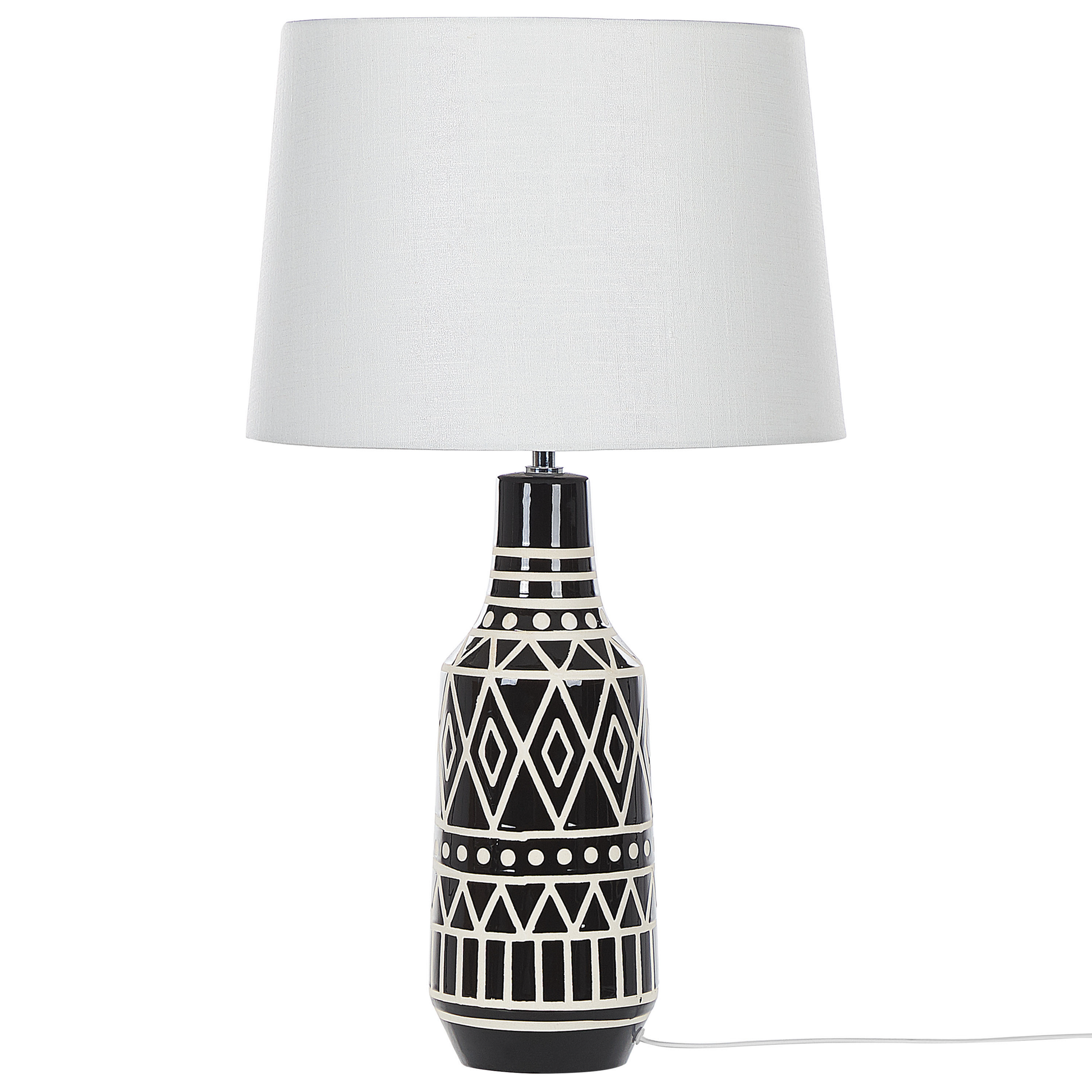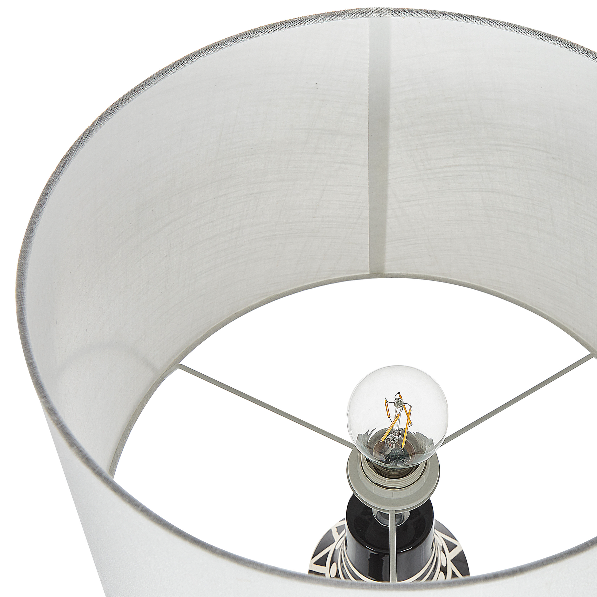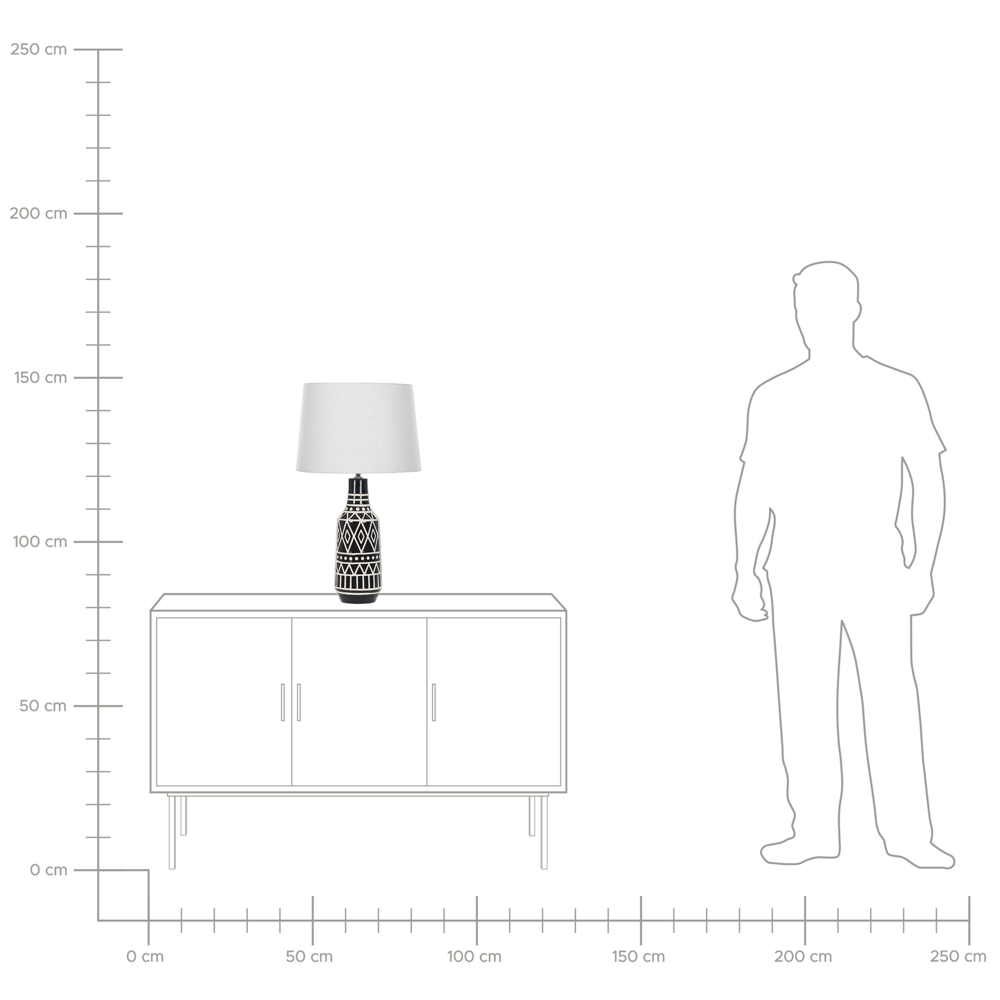 Diese hübsche Tischlampe bringt ethnischen Stil in Ihr Zuhause. Der Keramikfuss zeigt ein schönes Muster aus geometrischen Formen auf schwarzem Hintergrund. In Kombination mit dem Textilschirm eignet sie sich perfekt als dekorativer Akzent auf einem Nachttisch oder einer Konsole. Mit dem cremeweissen Stoffschirm schafft sie ein warmes, angenehmes Licht. Material: Keramik. Zusätzliches Material: Baumwolle, Jute. Material Zusammensetzung: 65% Jute, 35% Baumwolle Gewicht: 2 Montage: Teilweise montiert Das Angebot beinhaltet: 1 x Tischleuchte, Nicht im Lieferumfang enthalten: Leuchtmittel Höhe: 68 zusätzliche Information: Diese Leuchte ist geeignet für Leuchtmittel der Energieklassen A bis G auf einer Skala von A (sehr effizient) bis G (weniger effizient). Geeignet für: LED Leuchtmittel, Eco-Halogen Leuchtmittel, Energiesparleuchtmittel., Die Stromkabel dürfen nur von einem qualifizierten Elektriker angepasst werden., Da jedes Produkt handgefertigt wird, kann es zu kleineren Abweichungen in der Farbe und der äusseren Struktur kommen. Diese Abweichungen stellen keinen Qualitätsmangel dar, sondern sind eine warentypische Eigenschaft. Breite: 38 Tiefe: 38 Art: Tischleuchte Stil: Modern Allgemeine Farbe: Schwarz Schatten: Cremeweiss Hauptmaterial: Keramik Fassung: 40 W IP Protection Code: IP 20