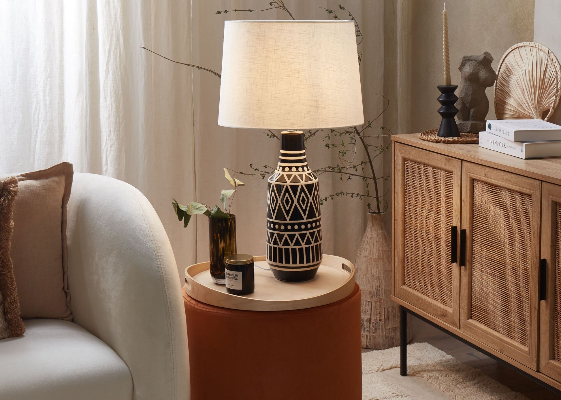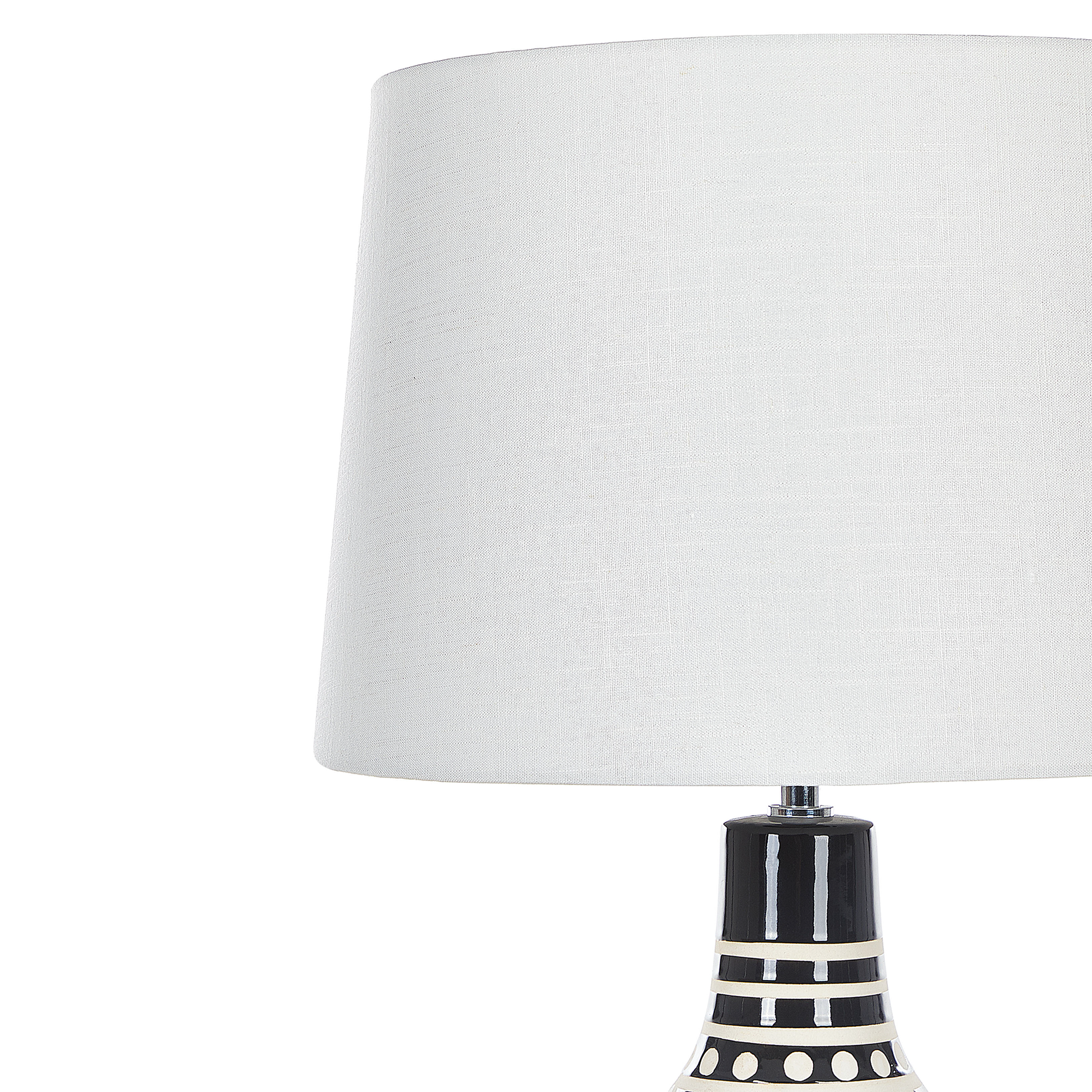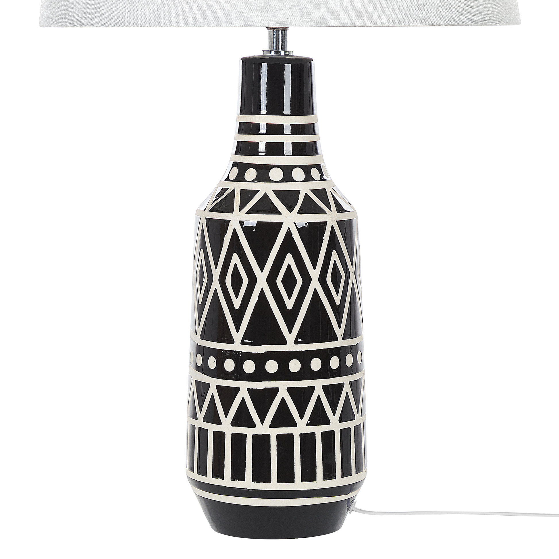 Diese hübsche Tischlampe bringt ethnischen Stil in Ihr Zuhause. Der Keramikfuss zeigt ein schönes Muster aus geometrischen Formen auf schwarzem Hintergrund. In Kombination mit dem Textilschirm eignet sie sich perfekt als dekorativer Akzent auf einem Nachttisch oder einer Konsole. Mit dem cremeweissen Stoffschirm schafft sie ein warmes, angenehmes Licht. Material: Keramik. Zusätzliches Material: Baumwolle, Jute. Material Zusammensetzung: 65% Jute, 35% Baumwolle Gewicht: 2 Montage: Teilweise montiert Das Angebot beinhaltet: 1 x Tischleuchte, Nicht im Lieferumfang enthalten: Leuchtmittel Höhe: 68 zusätzliche Information: Diese Leuchte ist geeignet für Leuchtmittel der Energieklassen A bis G auf einer Skala von A (sehr effizient) bis G (weniger effizient). Geeignet für: LED Leuchtmittel, Eco-Halogen Leuchtmittel, Energiesparleuchtmittel., Die Stromkabel dürfen nur von einem qualifizierten Elektriker angepasst werden., Da jedes Produkt handgefertigt wird, kann es zu kleineren Abweichungen in der Farbe und der äusseren Struktur kommen. Diese Abweichungen stellen keinen Qualitätsmangel dar, sondern sind eine warentypische Eigenschaft. Breite: 38 Tiefe: 38 Art: Tischleuchte Stil: Modern Allgemeine Farbe: Schwarz Schatten: Cremeweiss Hauptmaterial: Keramik Fassung: 40 W IP Protection Code: IP 20