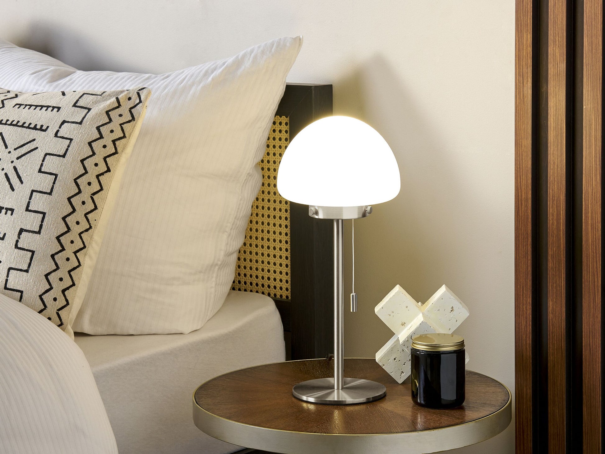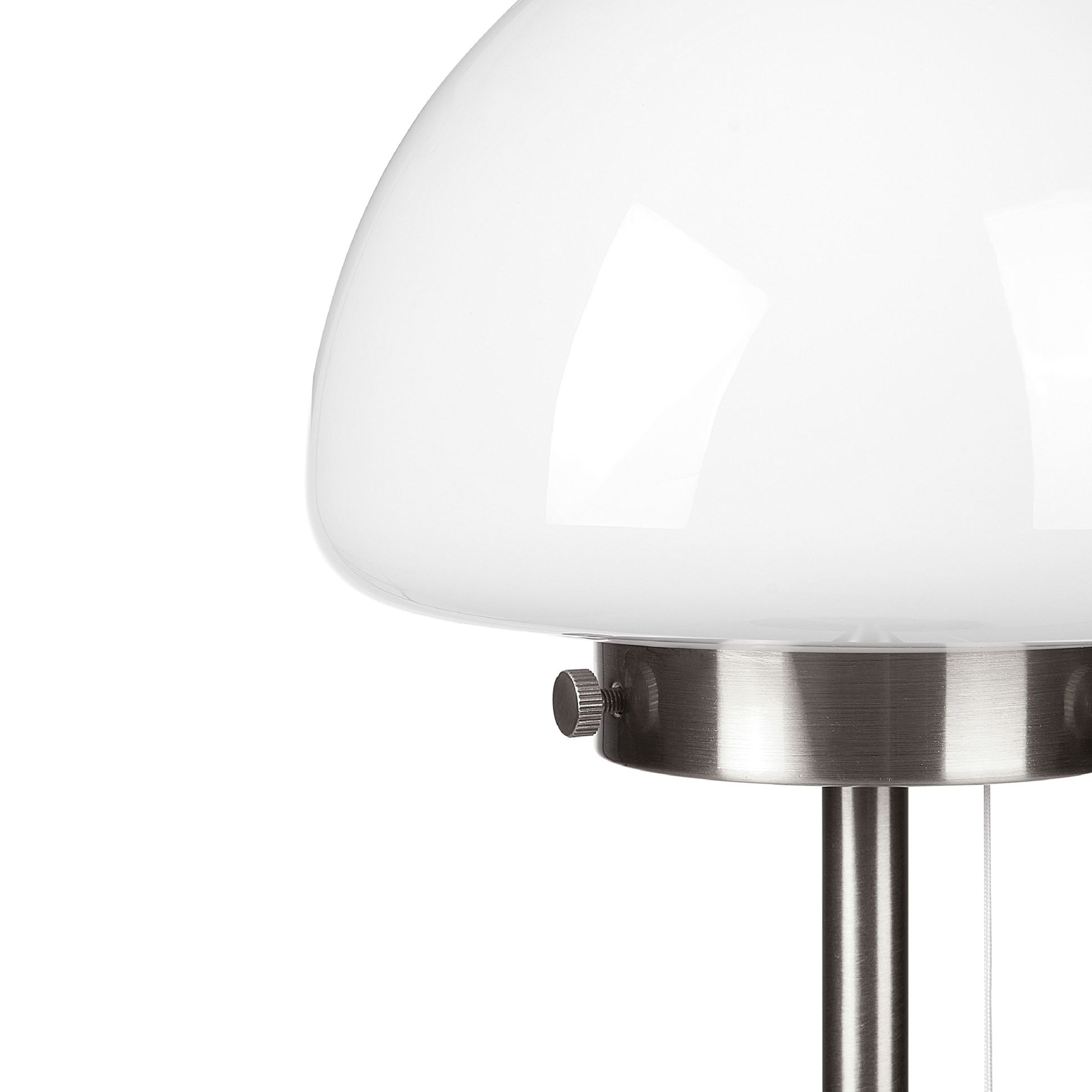 Verleihen Sie Ihrer Einrichtung mit dieser wunderschönen Tischleuchte einen ganz besonderen Touch. Das Stück verfügt über einen halbkugelförmigen Glasschirm in weisser Farbe, der in Kombination mit einem Silberner Sockel definitiv einen Blickfang darstellt und in jedes Schlafzimmer und Wohnzimmer passt, von Retro bis zu modern. Die Leuchte lässt sich dank des Zugschalters leicht ein- und ausschalten.  Material: Glas. Zusätzliches Material: Eisen.  Gewicht: 1 Montage: Teilweise montiert Das Angebot beinhaltet: 1 x Tischleuchte, Nicht im Lieferumfang enthalten: Leuchtmittel Höhe: 39 zusätzliche Information: Diese Leuchte ist geeignet für Leuchtmittel der Energieklassen A bis G auf einer Skala von A (sehr effizient) bis G (weniger effizient). Geeignet für: LED Leuchtmittel, Eco-Halogen Leuchtmittel, Energiesparleuchtmittel., Die Stromkabel dürfen nur von einem qualifizierten Elektriker angepasst werden. Breite: 17 Tiefe: 17 Art: Tischleuchte Stil: Modern Allgemeine Farbe: Silber Hauptmaterial: Glas Fassung: 25 W IP Protection Code: IP 20
