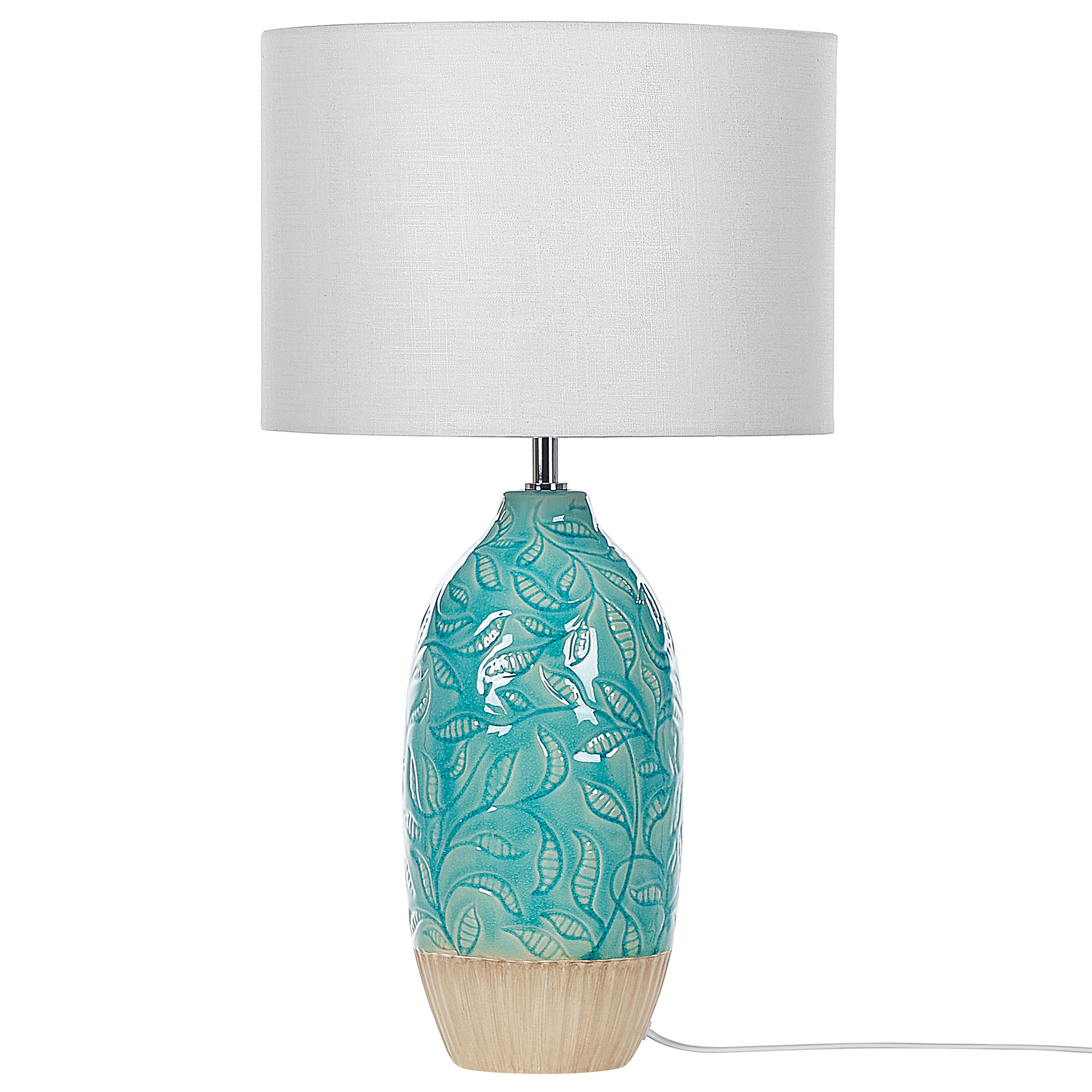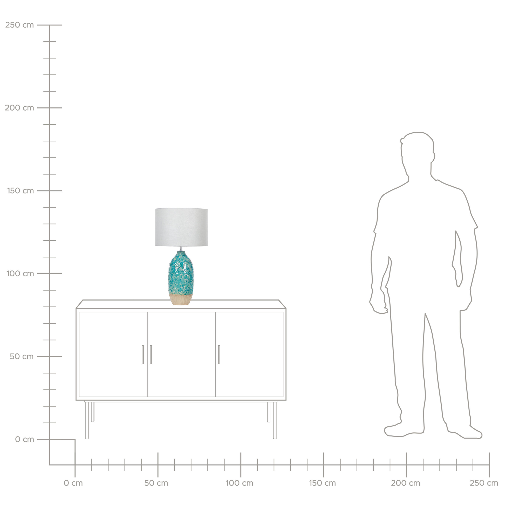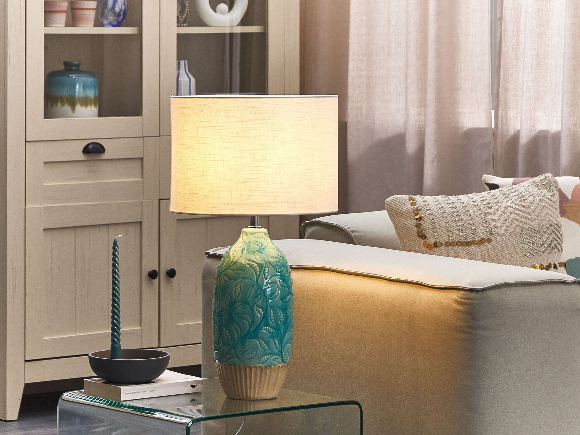 Beschreibung: Diese Dekolampe wird mit Sicherheit die Aufmerksamkeit Ihrer Gäste auf sich ziehen und sie in Entzücken versetzen. Dies wird vor allem durch den dekorativen Fuss mit dem floralen Muster erreicht. Die Leuchte zeichnet sich auch durch die interessante Farbkombination aus, die das Produkt in jedem Raum gut wirken lässt. Das Stück ist aus pflegeleichter, langlebiger Keramik hergestellt. Der handgefertigte Lampenschirm macht diese Lampe zu einem Unikat. Material: Keramik. Zusätzliches Material: Baumwolle, Jute. Material Zusammensetzung: 65% Jute, 35% Baumwolle Gewicht: 2 Montage: Teilweise montiert Das Angebot beinhaltet: 1 x Tischleuchte, Nicht im Lieferumfang enthalten: Leuchtmittel Höhe: 58 zusätzliche Information: Diese Leuchte ist geeignet für Leuchtmittel der Energieklassen A bis G auf einer Skala von A (sehr effizient) bis G (weniger effizient). Geeignet für: LED Leuchtmittel, Eco-Halogen Leuchtmittel, Energiesparleuchtmittel., Die Stromkabel dürfen nur von einem qualifizierten Elektriker angepasst werden. Breite: 32 Tiefe: 32 Art: Tischleuchte Stil: Boho Allgemeine Farbe: Blau Hauptmaterial: Keramik Fassung: 40 W IP Protection Code: IP 20