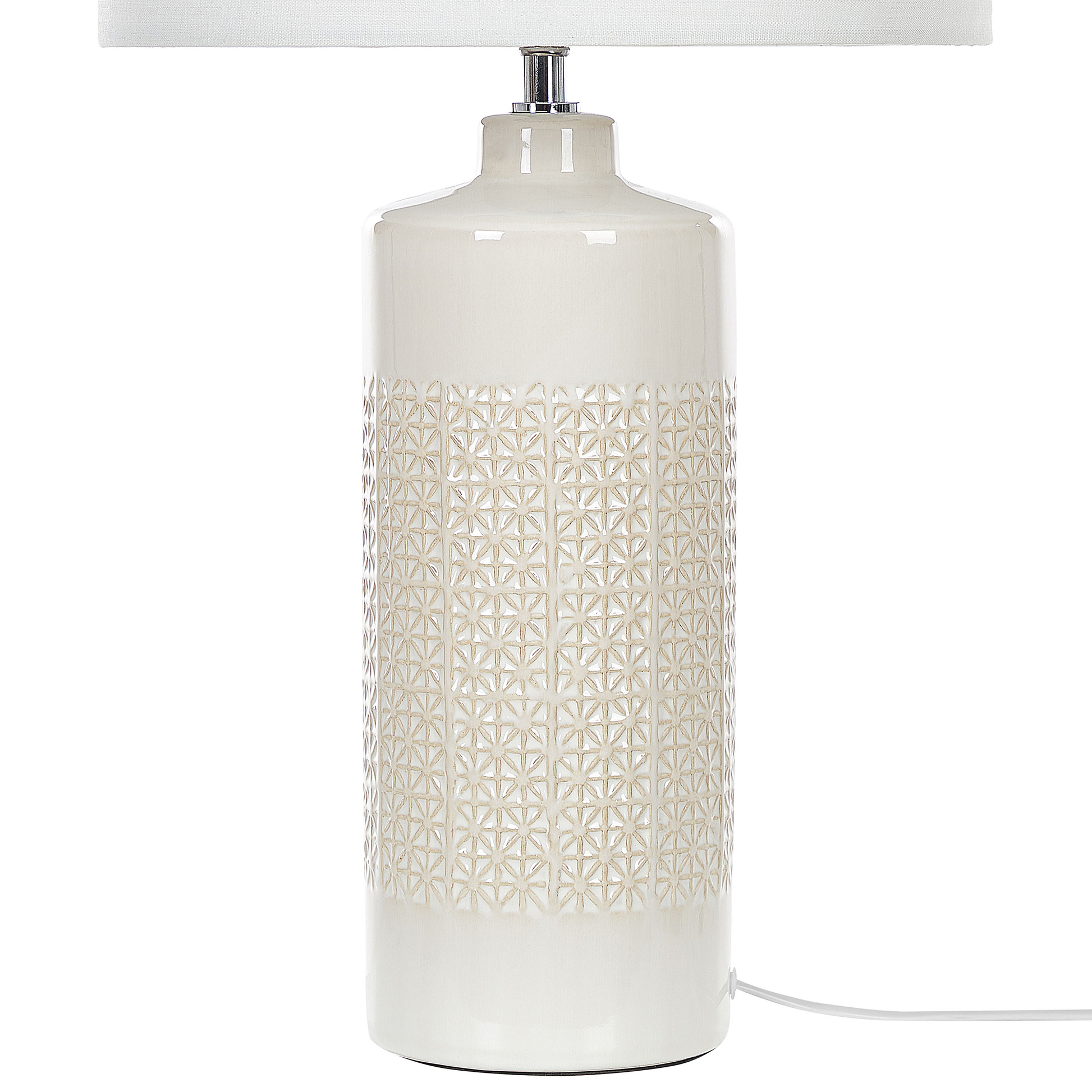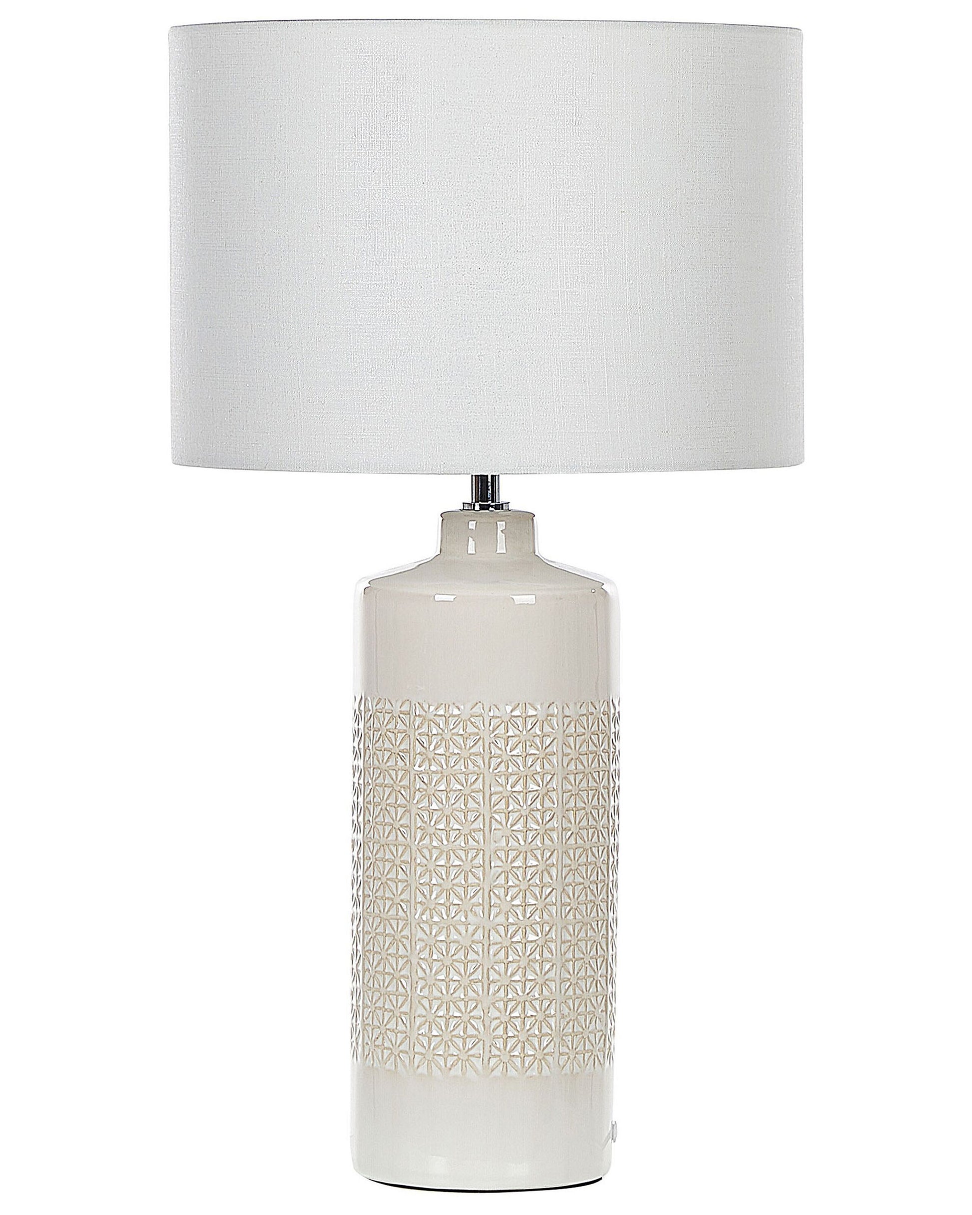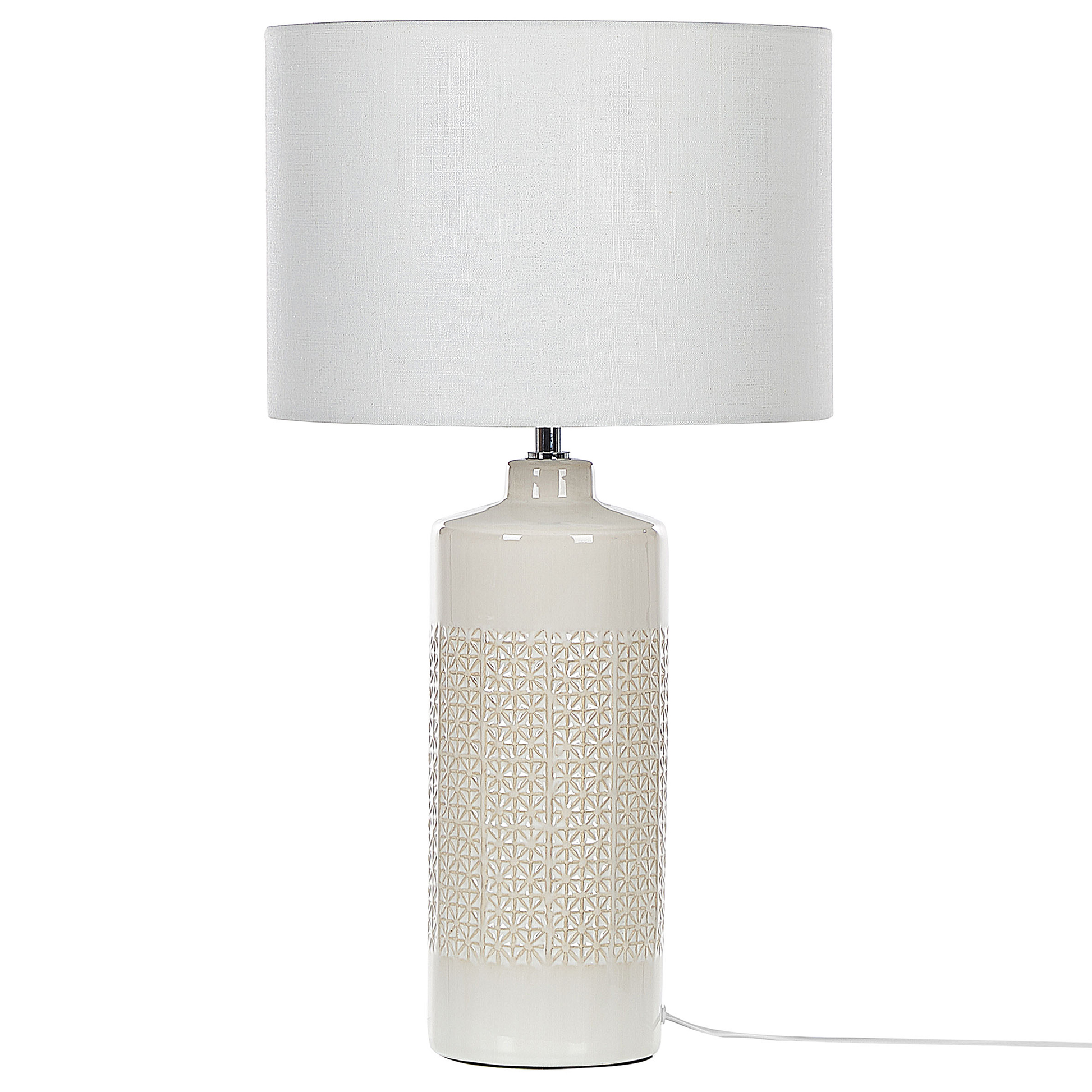 Diese skandinavische Tischleuchte eignet sich perfekt für Wohnräume oder Flure. Ihr hoher Keramiksockel ist glänzend und hat ein Prägemuster, das an kleine Sterne erinnert. Mit ihrem Schirm spendet die Lampe ein weiches Licht, das eine stimmungsvolle Atmosphäre schafft. Verwenden Sie diese Leuchte als stimmungsvolle Beleuchtung neben Ihrem Sofa oder als Lesehilfe neben dem Bett.  Material: Keramik. Zusätzliches Material: Baumwolle, Jute.  Material Zusammensetzung: 65% Jute, 35% Baumwolle Gewicht: 2 Montage: Benötigt keine Montage Das Angebot beinhaltet: 1 x Tischleuchte, Nicht im Lieferumfang enthalten: Leuchtmittel Höhe: 58 zusätzliche Information: Diese Leuchte ist geeignet für Leuchtmittel der Energieklassen A bis G auf einer Skala von A (sehr effizient) bis G (weniger effizient). Geeignet für: LED Leuchtmittel, Eco-Halogen Leuchtmittel, Energiesparleuchtmittel., Die Stromkabel dürfen nur von einem qualifizierten Elektriker angepasst werden. Breite: 32 Tiefe: 32 Art: Tischleuchte Stil: Skandinavisch Allgemeine Farbe: Weiss Schatten: Cremeweiss Hauptmaterial: Keramik Fassung: 40 W IP Protection Code: IP 20