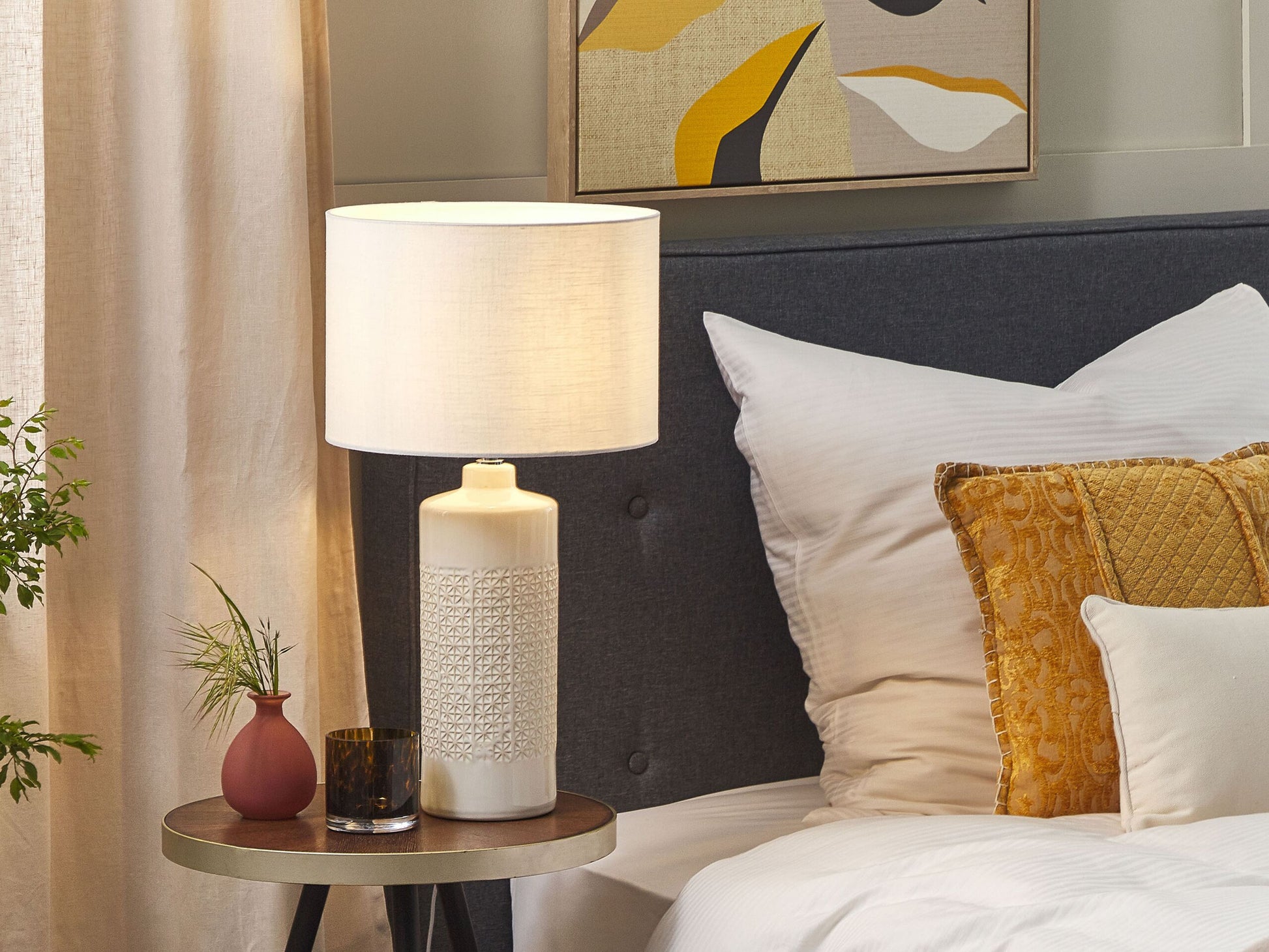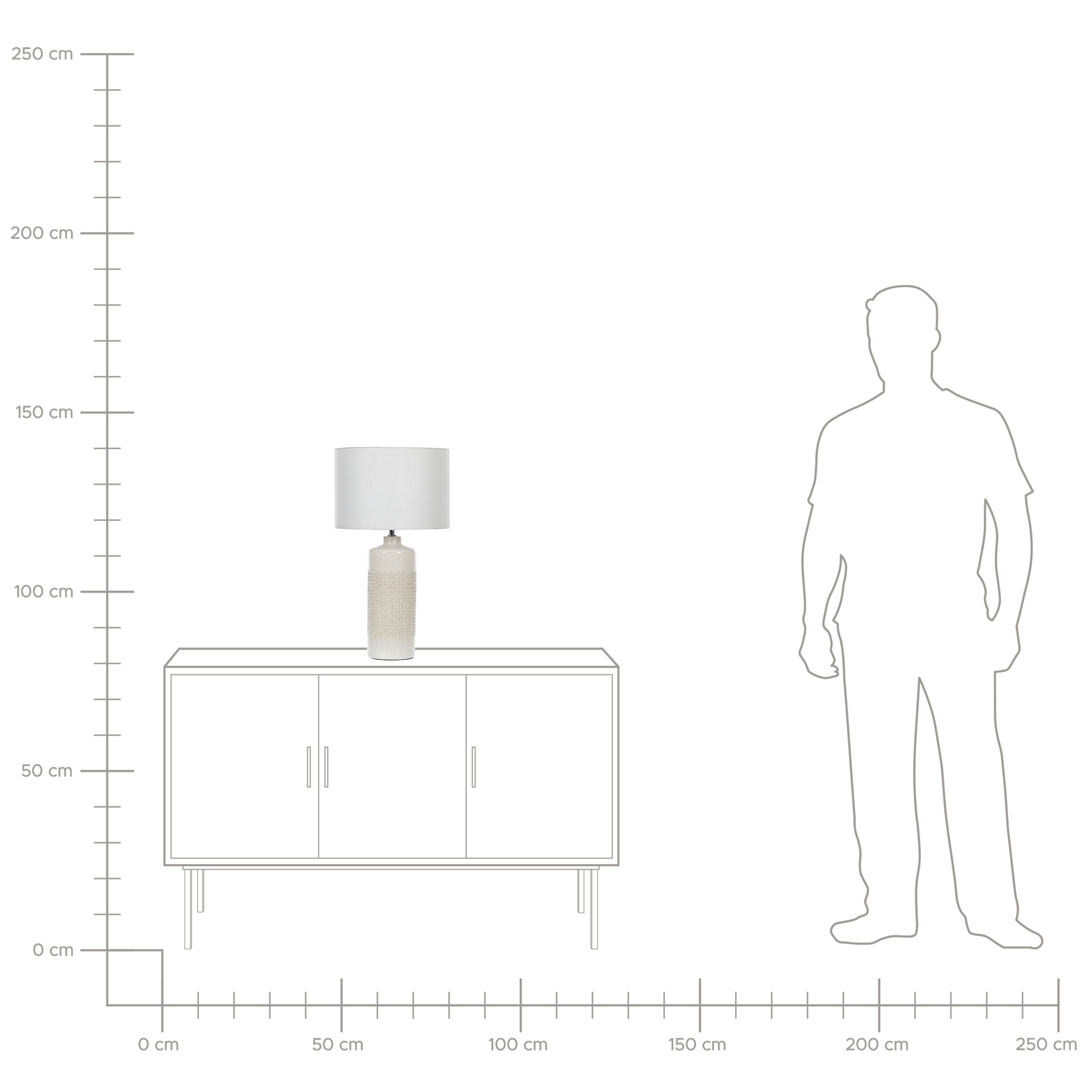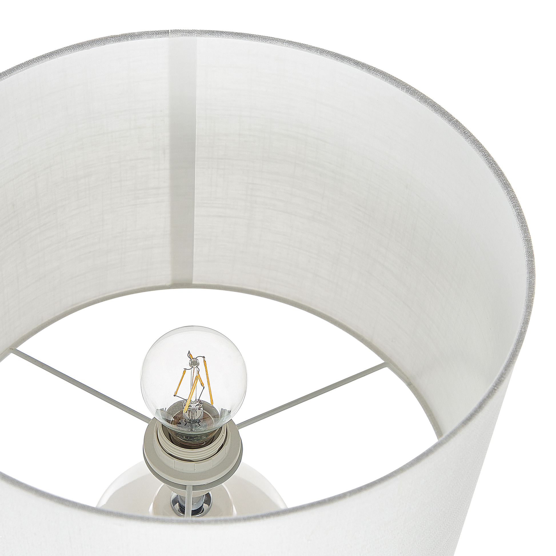 Diese skandinavische Tischleuchte eignet sich perfekt für Wohnräume oder Flure. Ihr hoher Keramiksockel ist glänzend und hat ein Prägemuster, das an kleine Sterne erinnert. Mit ihrem Schirm spendet die Lampe ein weiches Licht, das eine stimmungsvolle Atmosphäre schafft. Verwenden Sie diese Leuchte als stimmungsvolle Beleuchtung neben Ihrem Sofa oder als Lesehilfe neben dem Bett.  Material: Keramik. Zusätzliches Material: Baumwolle, Jute.  Material Zusammensetzung: 65% Jute, 35% Baumwolle Gewicht: 2 Montage: Benötigt keine Montage Das Angebot beinhaltet: 1 x Tischleuchte, Nicht im Lieferumfang enthalten: Leuchtmittel Höhe: 58 zusätzliche Information: Diese Leuchte ist geeignet für Leuchtmittel der Energieklassen A bis G auf einer Skala von A (sehr effizient) bis G (weniger effizient). Geeignet für: LED Leuchtmittel, Eco-Halogen Leuchtmittel, Energiesparleuchtmittel., Die Stromkabel dürfen nur von einem qualifizierten Elektriker angepasst werden. Breite: 32 Tiefe: 32 Art: Tischleuchte Stil: Skandinavisch Allgemeine Farbe: Weiss Schatten: Cremeweiss Hauptmaterial: Keramik Fassung: 40 W IP Protection Code: IP 20