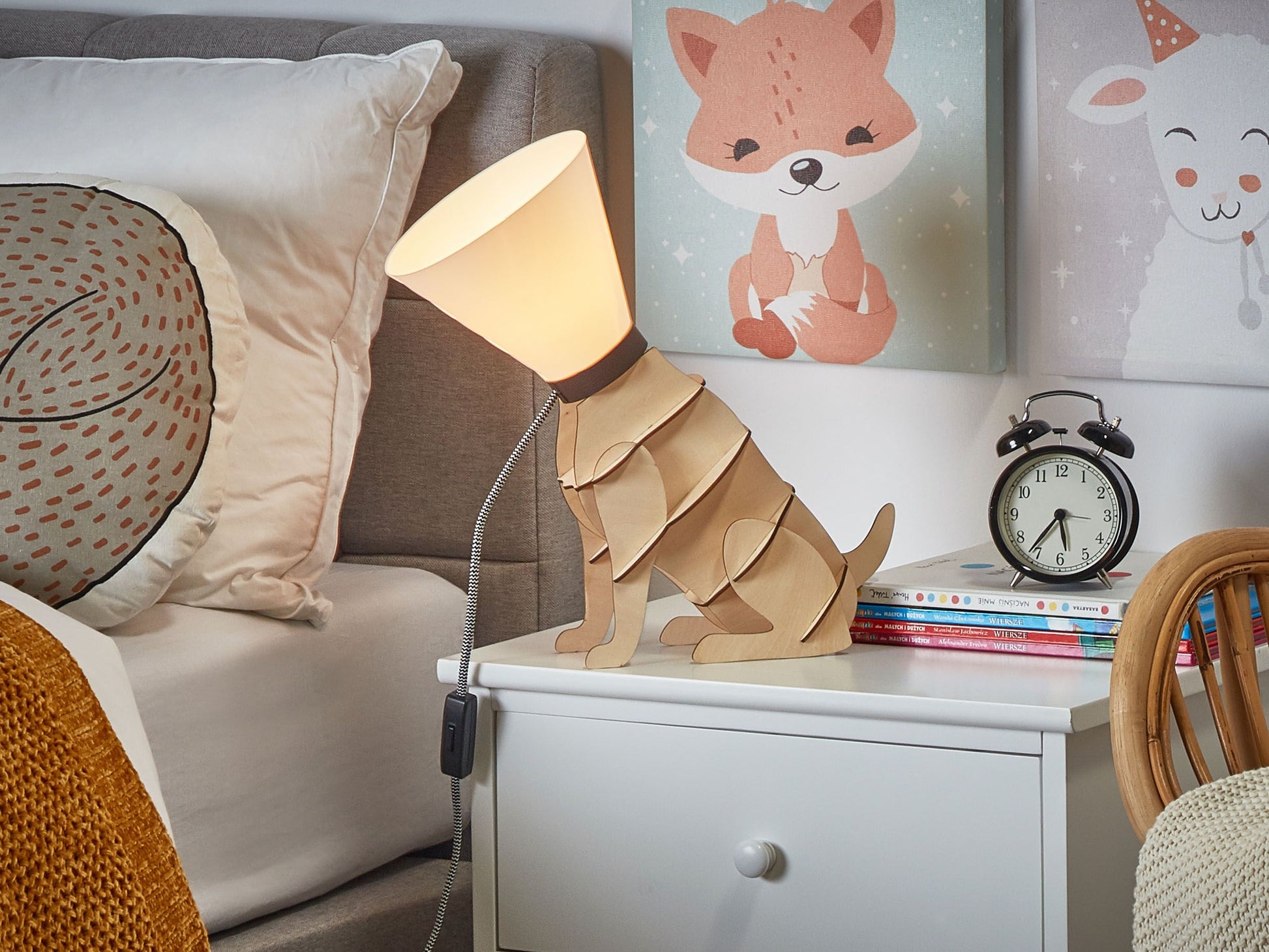 Wie ein kleiner Hund, der brav darauf wartet, dass man abends das Licht anmacht, schmückt diese fröhliche Leuchte Ihre Leseecke, Kommode, Fensterbank oder einen Nachttisch. Gefertigt aus Sperrholz und weissem Kunststoff setzt die Tisch- oder Nachttischlampe fröhliche Akzente.  Material: Sperrholz. Zusätzliches Material: Kunststoff.  Gewicht: 1 Montage: Nicht montiert Das Angebot beinhaltet: 1 x Tischleuchte, Nicht im Lieferumfang enthalten: Leuchtmittel Höhe: 38 zusätzliche Information: Diese Leuchte ist geeignet für Leuchtmittel der Energieklassen A bis G auf einer Skala von A (sehr effizient) bis G (weniger effizient). Geeignet für: LED Leuchtmittel, Eco-Halogen Leuchtmittel, Energiesparleuchtmittel., Die Stromkabel dürfen nur von einem qualifizierten Elektriker angepasst werden. Breite: 17 Tiefe: 21 Art: Tischleuchte Stil: Modern Allgemeine Farbe: Heller Holzfarbton Hauptmaterial: Sperrholz Fassung: Max. 40 W IP Protection Code: IP 20