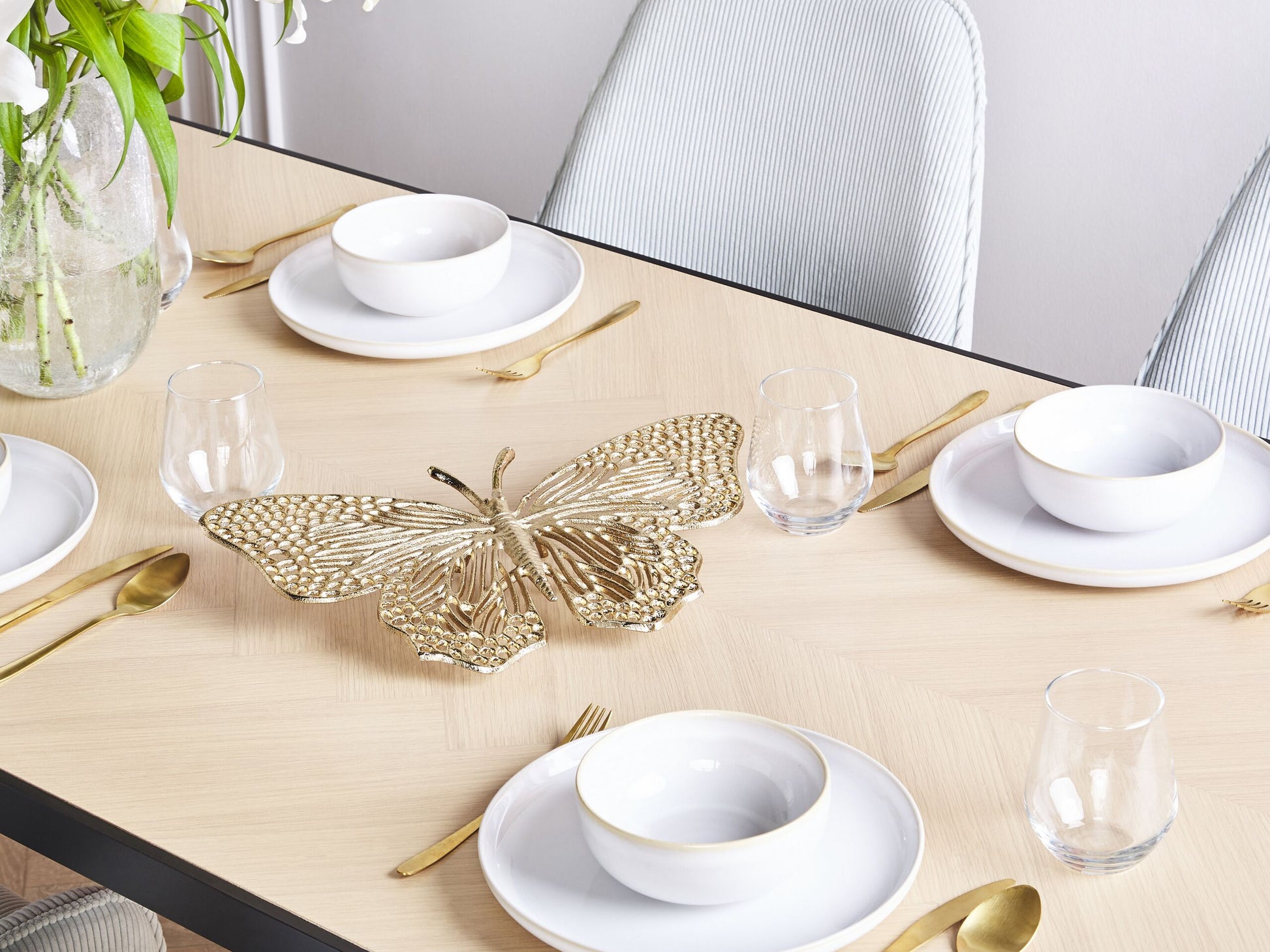 Mit dieser Figur werden Sie Ihrer Tischdeko ein frisches und frühlingshaftes Flair verleihen. Die Dekoration ähnelt einem Schmetterling in einer stilvollen, leicht abgenutzten goldenen Farbe. Sie wurde in Handarbeit aus hochwertigem Aluminium gefertigt, sodass sie pflegeleicht ist. Aufgrund des Designs passt der Schmetterling am besten in moderne und glamouröse Räume, wenn er auf einem Esstisch oder einem Sideboard platziert wird. Material: Aluminium. Gewicht: 0.4 Montage: Benötigt keine Montage Das Angebot beinhaltet: 1 x Dekofigur Höhe: 6 zusätzliche Information: Der sichtbare Alterungseffekt, sowie jede Art von Verfärbung oder Abnutzung sind absichtlich und stellen keinen Qualitätsmangel des Produkts dar., Bitte beachten Sie, dass jedes Produkt handgefertigt ist. Deshalb kann der Farbton und die Grösse leicht von dem Bild abweichen. Breite: 40 Tiefe: 24 Art: Dekofigur Stil: Glamourös Allgemeine Farbe: Gold Hauptmaterial: Aluminium