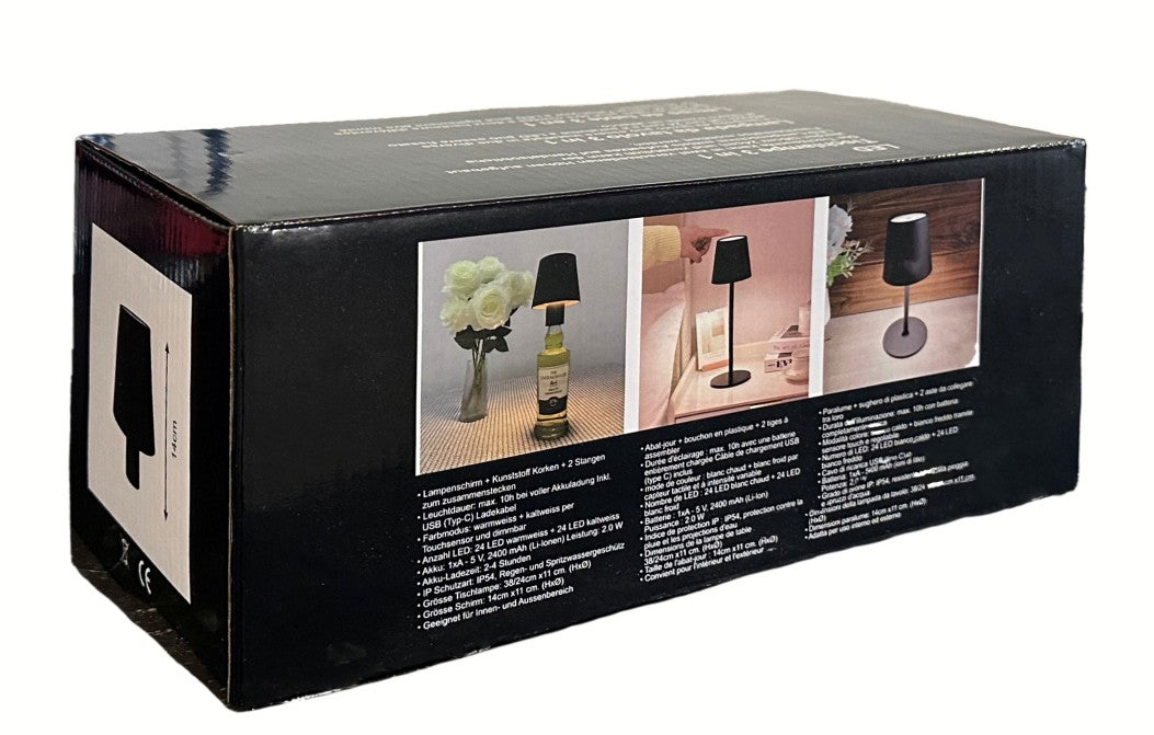 mit Touch Funktion 24 warm weisse +24 kaltweisse LED dimmbar Akku: 5V-2400 mAh (Li-Ionen) Aufladung: USB IP54 (Leistungsaufnahme: 1 Watt) zum Aufstecken auf Flaschen oder zum Stellen (2 Höhen) Materialien: Metall, Kunststoff L:11cm B:11cm H:38cm inklusive Micro-USB Kabel Typ C Licht hält 6-60 Stunden bei voller Aufladung (4h) witterungsbeständig inklusive VRB / CHF 00.25