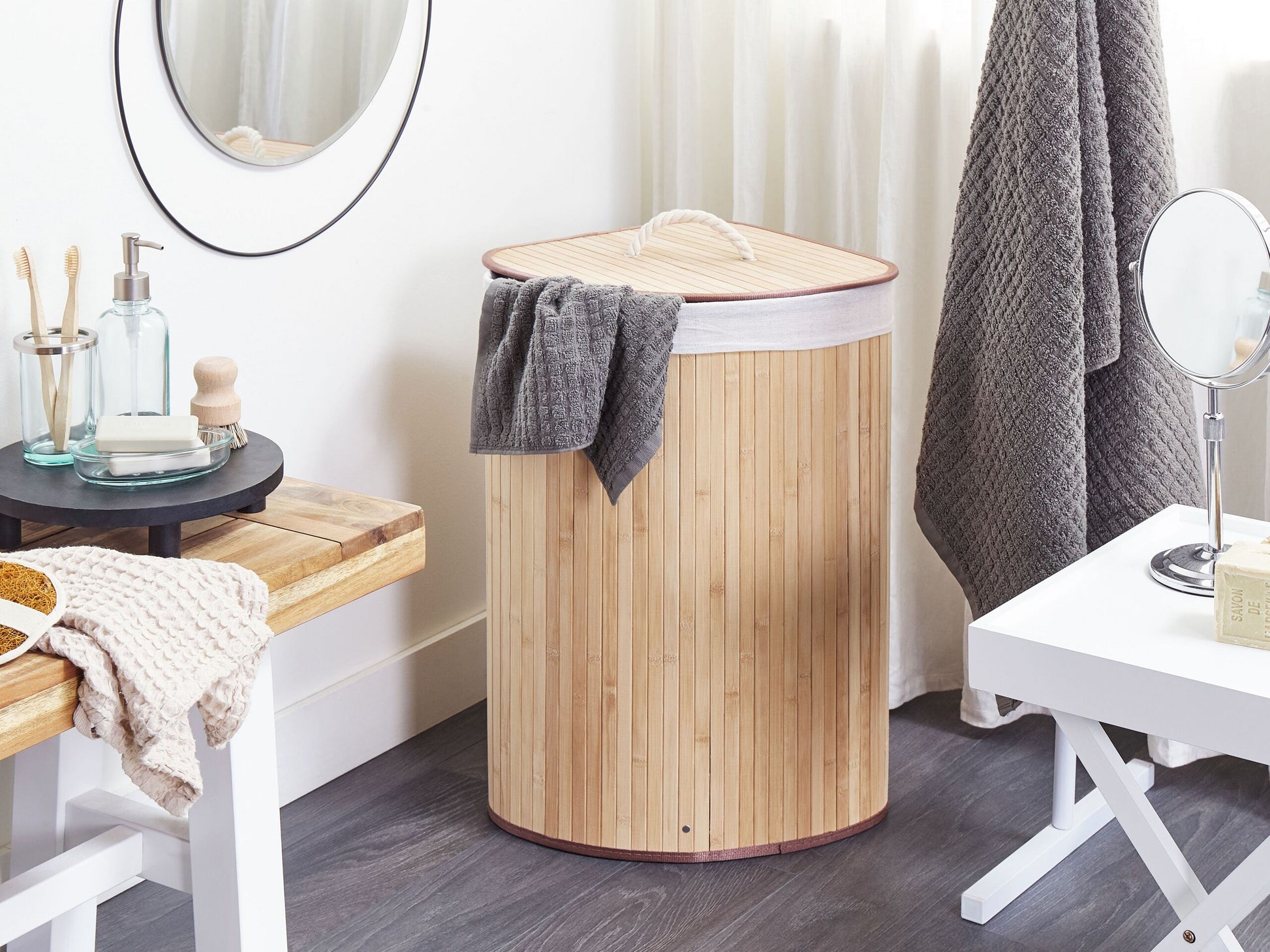 Ein absolutes Must-have für Ihr Zuhause. Diese eckige Wäschetonne aus robustem Bambusholz ist eine praktische Ergänzung für jeden Raum des Hauses – sei es ein Bad, Schlafzimmer oder ein anderer Wohnbereich. Der Wäschekorbsammler ist handgefertigt und verfügt über einen herausnehmbaren Stoffeinsatz sowie einen passenden Deckel. Der Korb eignet sich hervorragend zur diskreten und geruchsfreien Aufbewahrung Ihrer Wäsche sowie für viele andere Dinge wie z. B. Kleider, Tagesdecken oder Kinderspielzeug. Der Wäschesack ist herausnehmbar und lässt sich angenehm bis hin zur Waschmaschine transportieren. Material: Bambusholz. Zusätzliches Material: Polyester, Baumwolle, Viskose. Material Zusammensetzung: 60% Polyester, 30% Baumwolle, 10% Viskose Gewicht: 2 Montage: Benötigt keine Montage Holzart: Bambusoideae Holzursprung: China Das Angebot beinhaltet: 1 x Korb Höhe: 60 zusätzliche Information: Holz ist ein Naturprodukt. Farb- und Strukturunterschiede, Narben, Falten und sonstige Naturmerkmale sind Echtheitsbeweise und keine zur Reklamation berechtigende Fehler., Da bei der Herstellung natürliche Materialien verwendet werden, können kleine Farb-, Form-, bzw. Grössendifferenzen auftreten. Diese Unterschiede stellen jedoch keinen Produktfehler dar. Gestalten: Dreieckig Breite: 60 Tiefe: 35 Art: Aufbewahrungskorb Stil: Klassisch Allgemeine Farbe: Heller Holzfarbton Hauptmaterial: Bambusholz