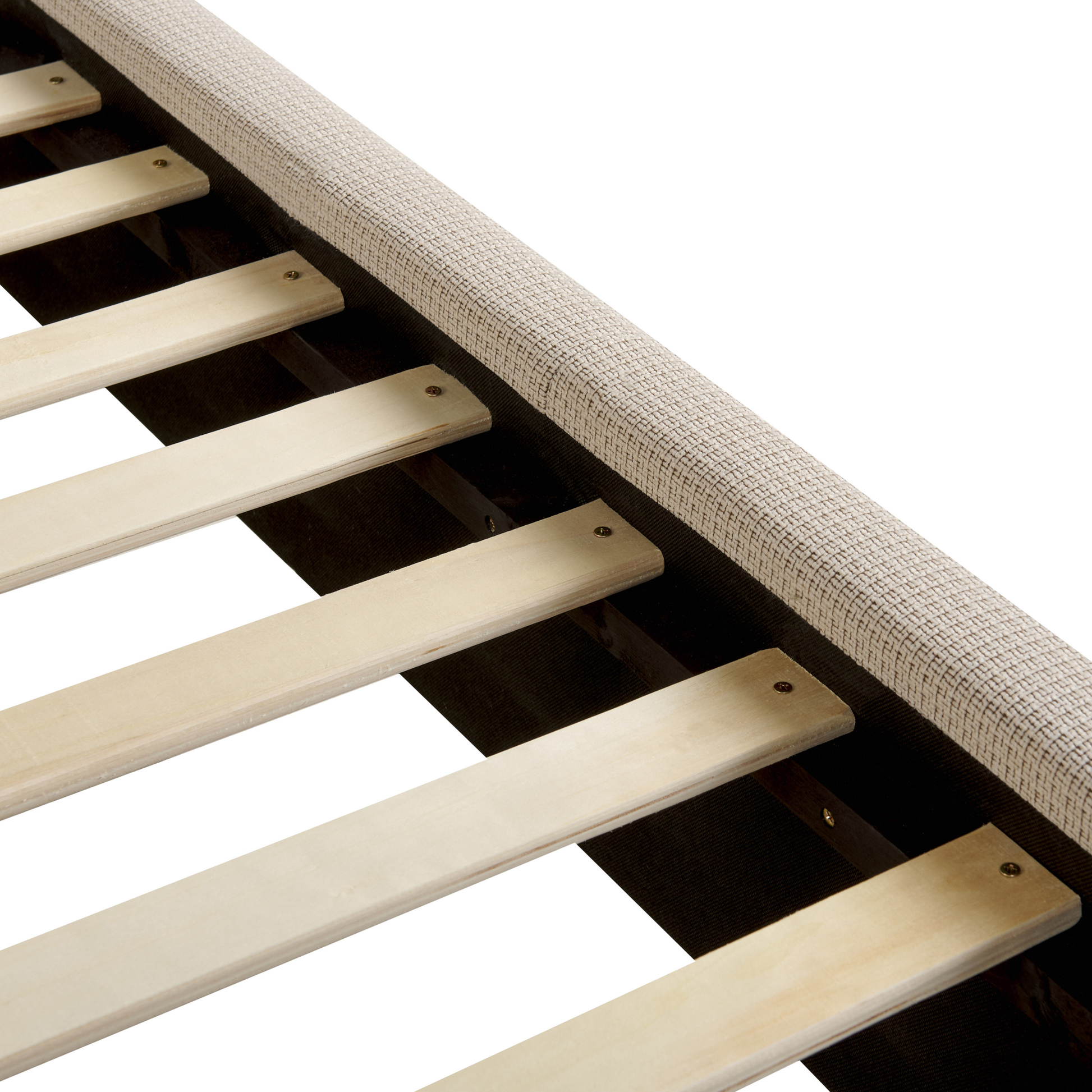 Description: Verleihen Sie Ihrem Schlafzimmer mit diesem eleganten und klassischen Bett neuen Glanz. Es ist mit strapazierfähigem und langlebigem Stoff gepolstert und fühlt sich sehr angenehm an. Mit seinem vielseitigen Design lässt sich dieses Stoffbett leicht in verschiedene Einrichtungsstile einfügen. Die dick gepolsterten Kopfteil-Kissen sorgen für den ultimativen Komfort, während die stabilen Holzlatten die richtige Gewichtsverteilung und damit einen erholsamen Schlaf ermöglichen. Material: Polyester. Zusätzliches Material: MDF-Platte, Sperrholz, Eukalyptus. Material Zusammensetzung: 100% Polyester Gewicht: 55 Montage: Nicht montiert Holzart: Eucalyptus grandis Holzursprung: China Gewichtskapazität: 350 Beine Höhe: 2 Schlafende Oberfläche: 180x200 Das Angebot beinhaltet: 1 x Bettrahmen, 1 x einfacher Lattenrost (Anzahl der Latten: 14), Nicht im Lieferumfang enthalten: Matratze, Bettwäsche und Kissen Höhe: 90 zusätzliche Information: Die auf den Fotos dargestellte Matratze ist 20 cm hoch, daher ist eine ähnlich hohe Matratze empfehlenswert. Breite: 196 Länge: 233 Art: Bett mit Lattenrost Stil: Modern Allgemeine Farbe: Beige Schatten: Sandbeige Hauptmaterial: Polyester Stoff gepolstert zurück: Nein