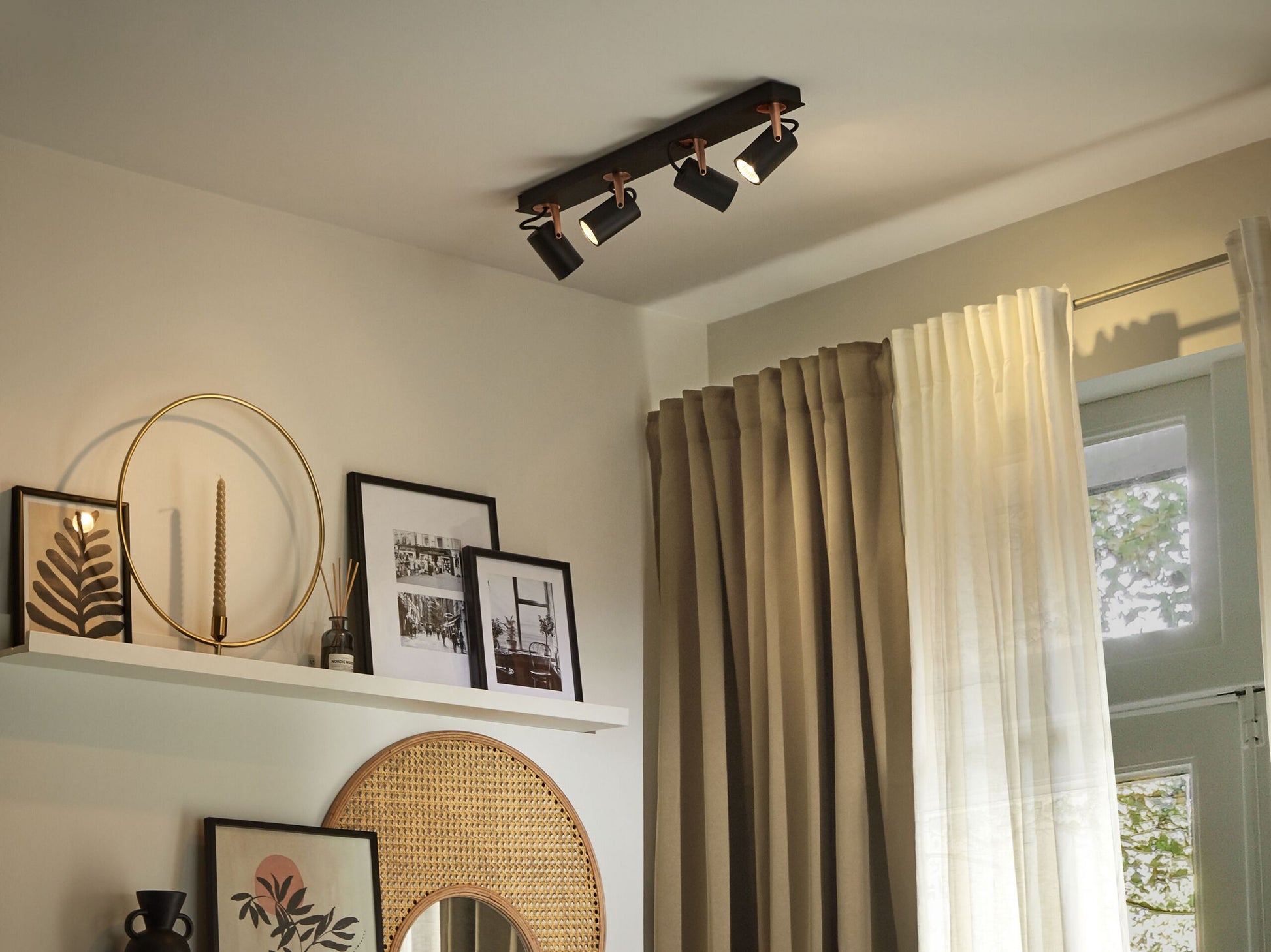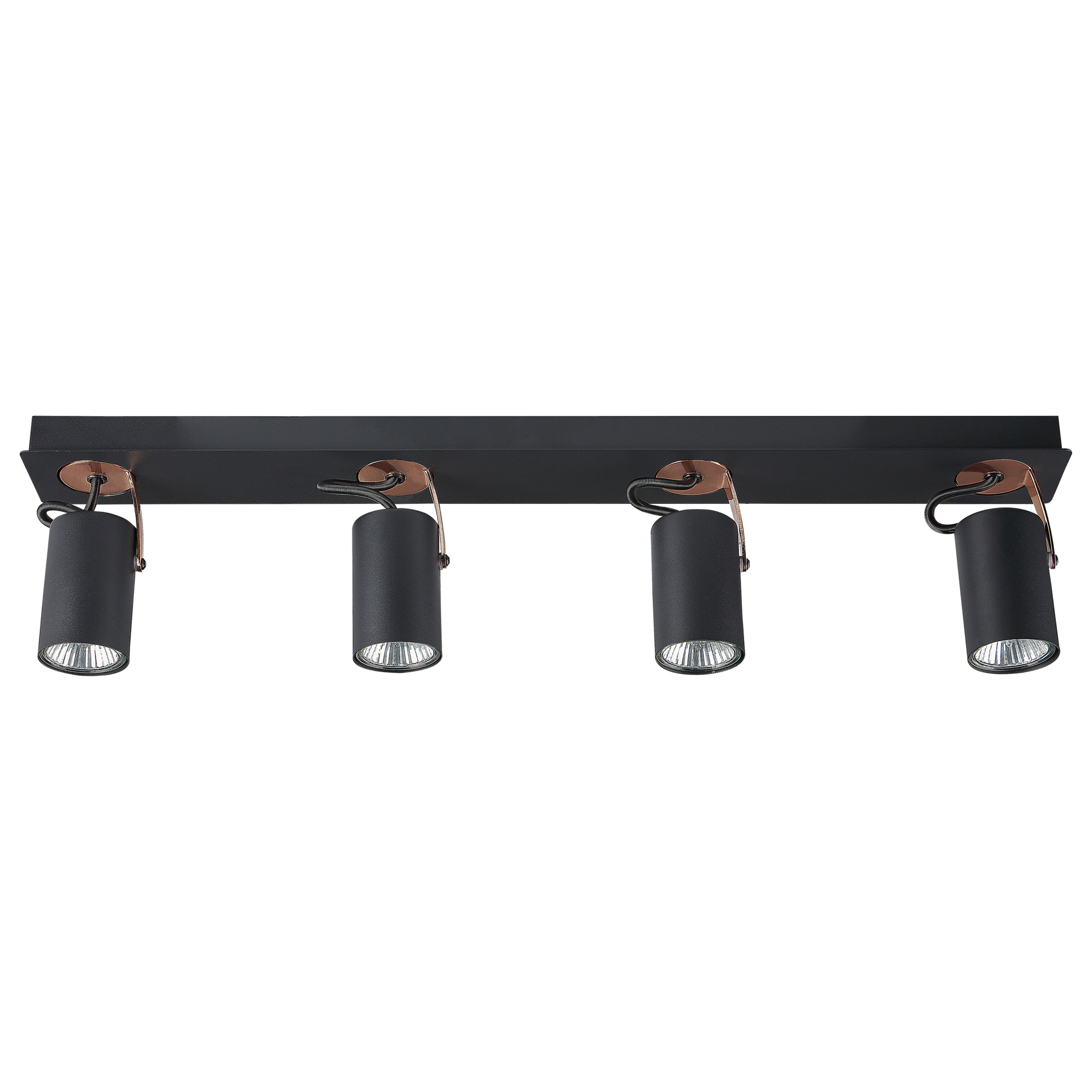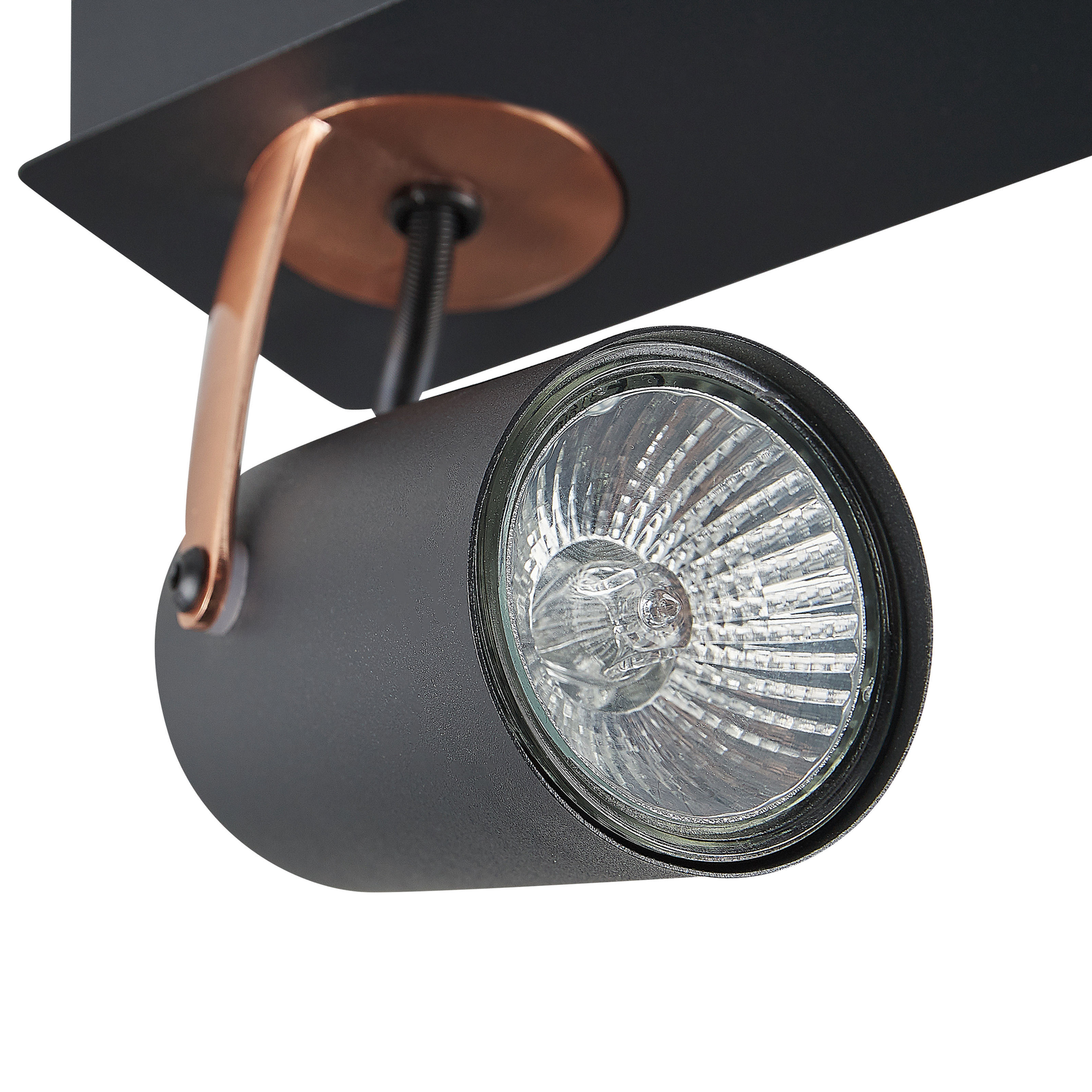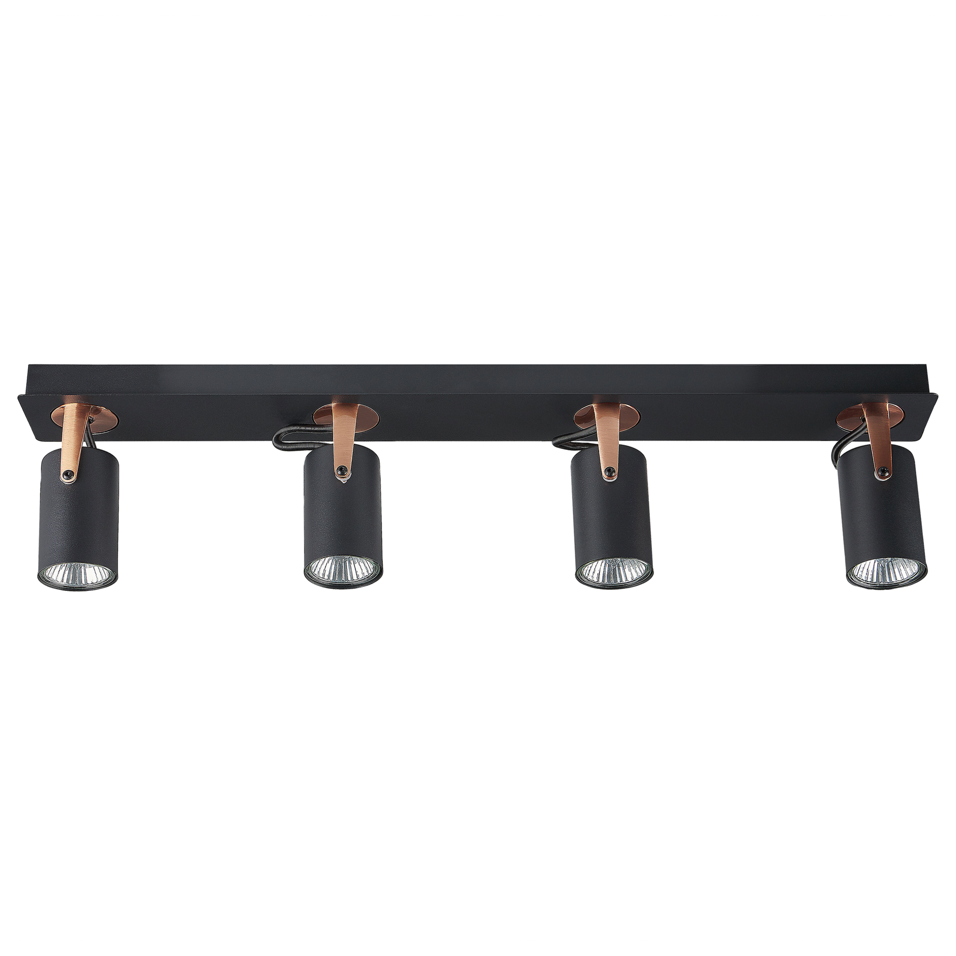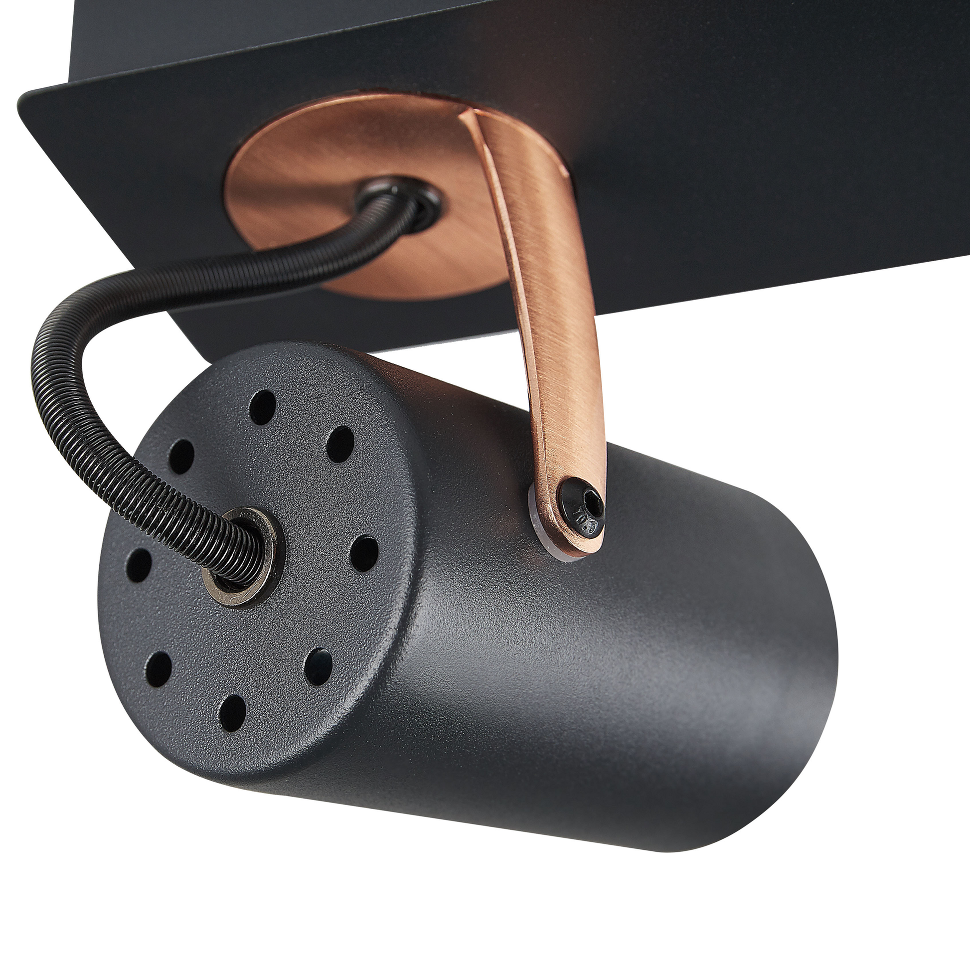 Diese Leuchte wird sich vor allem als Deckenstrahler oder Wandspot im Bad, Ess-, Wohn- oder Schlafzimmer beweisen. Die schwenkbaren, runden Lampenschirme lassen sich in jede Richtung verstellen. So können Sie eine ausgesuchte Stelle ausleuchten und für eine gleichmässige Lichtverteilung am Arbeitsplatz oder beim Lesen sorgen. Diese 4-flammige Lampe besteht aus robustem Eisen und wird Ihnen dank der zusätzlichen Pulverbeschichtung viele Jahre dienen können. Der schwarze Farbton und die kupferfarbenen Elemente des Deckenspots kreieren einen Look, der sich in jeder industriellen sowie klassischen Einrichtung wiederfinden wird. Material: Metall. Gewicht: 1.2 Montage: Installation benötigt Das Angebot beinhaltet: 1 x Hängeleuchte, Nicht im Lieferumfang enthalten: Leuchtmittel Höhe: 12 zusätzliche Information: Diese Leuchte ist geeignet für Leuchtmittel der Energieklassen A bis G auf einer Skala von A (sehr effizient) bis G (weniger effizient). Geeignet für: LED Leuchtmittel, Eco-Halogen Leuchtmittel, Energiesparleuchtmittel., Die Lampe besitzt keinen eigenen Ein/Ausschalter und benötigt daher einen separaten Schalter an der Wand Breite: 63 Tiefe: 7 Art: Deckenlampen Stil: Industriell Allgemeine Farbe: Schwarz Hauptmaterial: Metall Fassung: 50 W IP Protection Code: IP 20