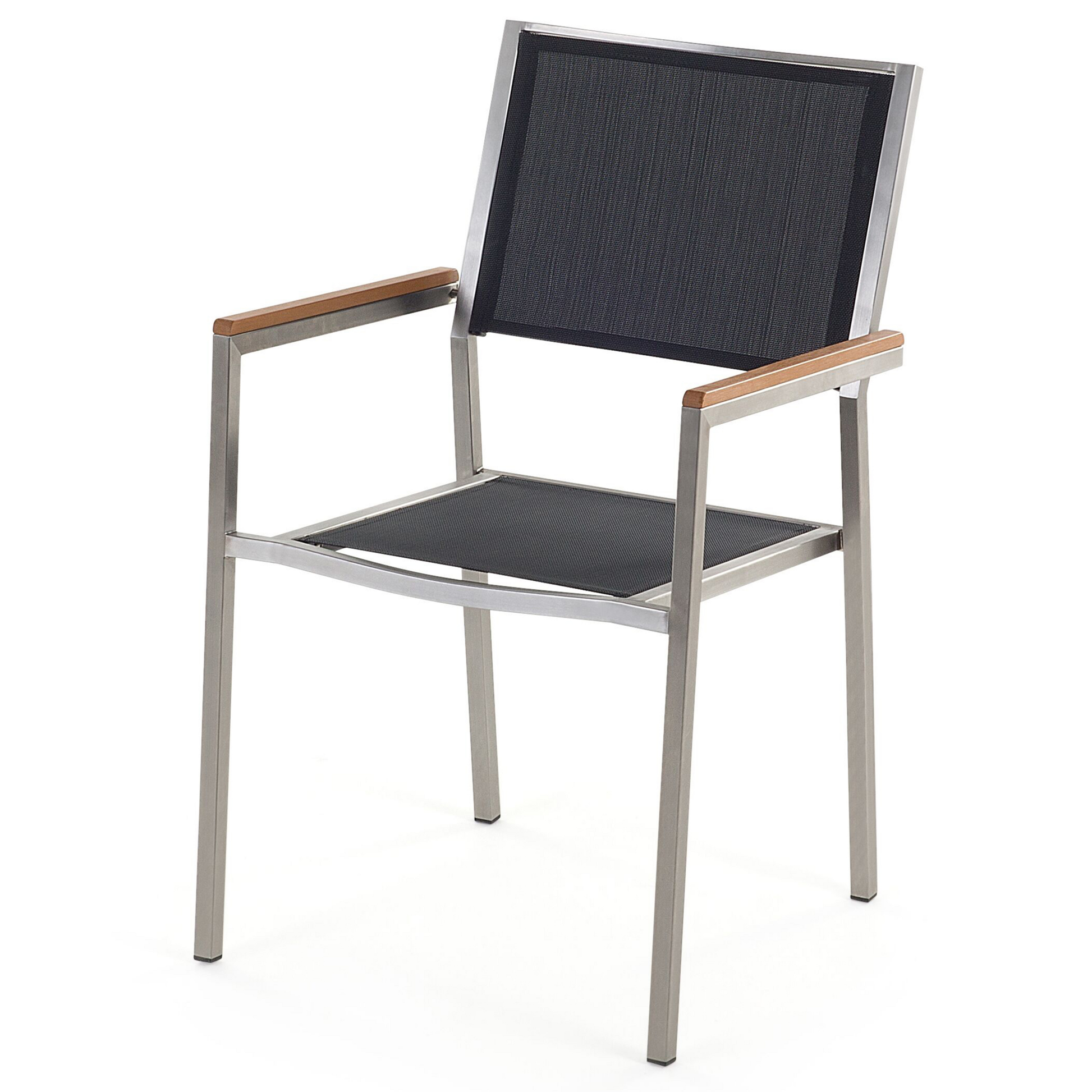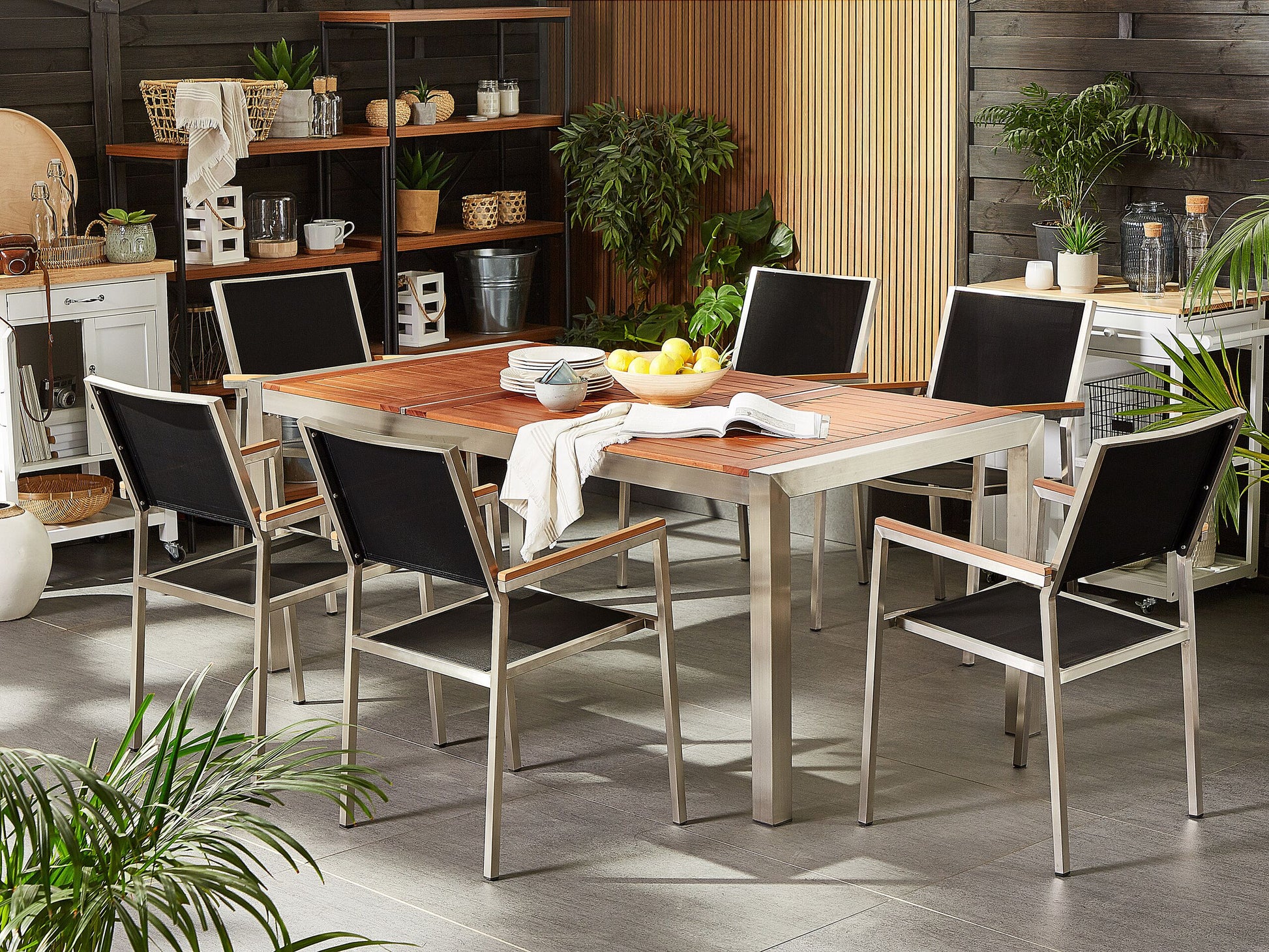 Dieses traumhaft schöne Gartenset für 6 Personen wird das absolute Highlight auf Ihrer Terrasse sein! Der moderne Materialmix aus gebürstetem Edelstahl und geöltem Eukalyptusholz ist perfekt auf das gradlinige Design abgestimmt. Der grosse Gartentisch hat eine luxuriöse Ausstrahlung und bietet viel Platz für Gartenpartys und gemütliche Treffen mit Freunden und Familie. Die Tischplatte in Lattenoptik aus Eukalyptus ist äusserst witterungsbeständig, widerstandsfähig und langlebig. Die 6 komfortablen Gartenstühle verfügen über bequeme Armlehnen sowie eine schwarze, strapazierfähige, UV-beständige Textillbespannung und sorgen für optimalen Sitzkomfort. Mit diesem exklusiven Tischset werden Sommerabende im Garten zu einem unvergesslichen Erlebnis! Material: Edelstahl. Zusätzliches Material: Polyester, Kunstholz. Material Zusammensetzung: 90% PVC, 10% Polyester Gewicht: 74 Kapazität: 6 Personen Montage: Nicht montiert Holzart: Eucalyptus grandis Holzursprung: Vietnam Gesamtabmessungen: 180x90x74 Tischabmessungen: 180x90x74 Stuhl Abmessungen: 55x58x87 Sitzhöhe: 44 Das Angebot beinhaltet: 1 x Tisch, 6 x Stühle zusätzliche Information: Damit das folgende Produkt jahrelang seine Schönheit beibehält, stellen wir Ihnen ein ausführliches Pflegehandbuch zur Verfügung. Die Pflegeanleitung und Tipps zur richtigen Wartung Ihres neuen Produkts finden Sie finden Sie unten im Abschnitt „Verpackung und Montage“., Holz ist ein Naturprodukt. Farb- und Strukturunterschiede, Narben, Falten und sonstige Naturmerkmale sind Echtheitsbeweise und keine zur Reklamation berechtigende Fehler. Art: Garten-Essgruppe für 6 Personen Stil: Modern Allgemeine Farbe: Heller Holzfarbton Schatten: Graphitgrau Hauptmaterial: Edelstahl