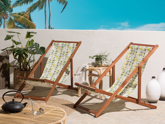 Liegestuhl Akazienholz hellbraun Textil weiss / grün Blattmuster 2er Set ANZIO
