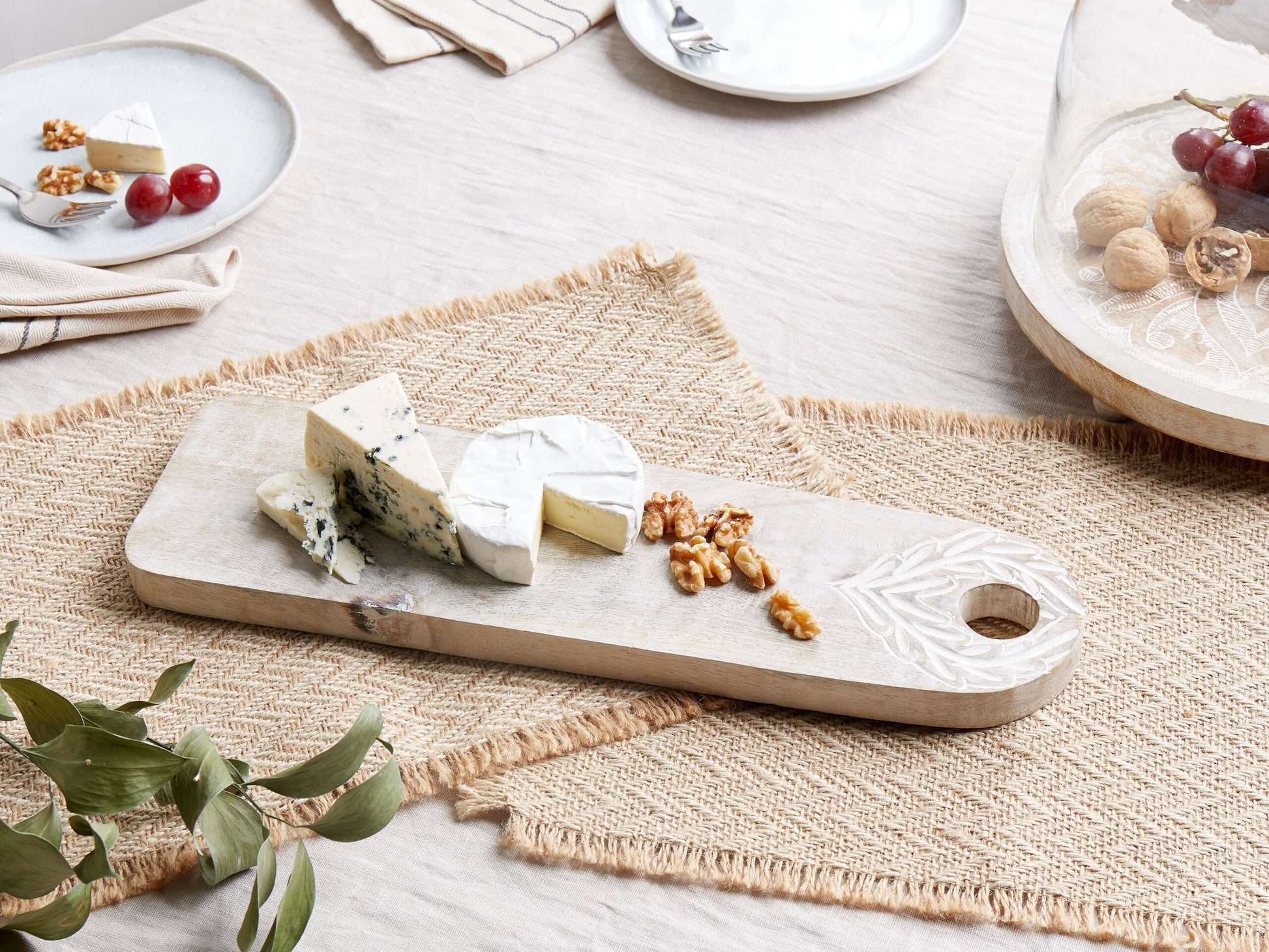 Nutzen Sie diese rechteckige Servierplatte, um Ihre Backwaren, Würstchen, Käsesorten oder andere köstliche Speisen zu servieren. Das Holztablett erinnert mit seiner Form an ein Schneidebrett und besticht mit seinem dezenten, weissen Finish, das dem Ganzen eine charmante Antik-Optik verleiht und die feine Holzmaserung zu Geltung bringt. Dank des Lochs lässt sich das Serviertablett auch einfach in die Hand nehmen und an den gewünschten Ort befördern. Material: Mango Holz. Gewicht: 1 Montage: Benötigt keine Montage Holzart: Mangifera indica Holzursprung: China Gesamtabmessungen: 41x12x2 Das Angebot beinhaltet: 1 x Tablett Höhe: 2 zusätzliche Information: Holz ist ein natürliches Material, daher bleibt die feine, natürliche Struktur und die ganz besondere Optik der Holzoberfläche trotz der Farbschicht erhalten., Da jedes Produkt handgefertigt wird, kann es zu kleineren Abweichungen in der Farbe und der äusseren Struktur kommen. Diese Abweichungen stellen keinen Qualitätsmangel dar, sondern sind eine warentypische Eigenschaft., Der sichtbare Alterungseffekt, sowie jede Art von Verfärbung oder Abnutzung sind absichtlich und stellen keinen Qualitätsmangel des Produkts dar. Breite: 41 Tiefe: 12 Art: Servierbrett Stil: Rustikal Allgemeine Farbe: Heller Holzfarbton Hauptmaterial: Mango Holz