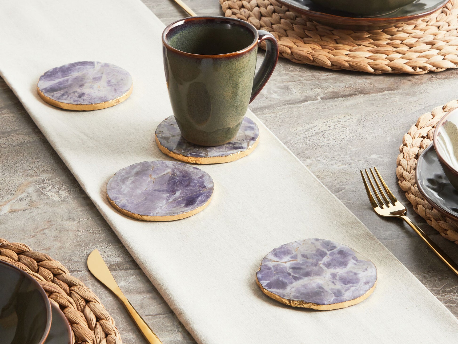 Verschönern Sie Ihren Esstisch mit diesen Untersetzern - sie sind nicht nur äusserst stilvoll, sondern auch funktional. Aus elegantem Achatstein gefertigt und mit goldenen Akzenten an den Seiten verziert, werden diese Wohnaccessoires zum Eyecatcher in jedem Essbereich. Die Untersetzer sind stapelbar und verleihen dem Tisch eine elegante Note. Material: Achat. Gewicht: 0.4 Montage: Benötigt keine Montage Das Angebot beinhaltet: 4 x Untersetzer Höhe: 1 zusätzliche Information: Da jedes Produkt handgefertigt wird, kann es zu kleineren Abweichungen in der Farbe und der äusseren Struktur kommen. Diese Abweichungen stellen keinen Qualitätsmangel dar, sondern sind eine warentypische Eigenschaft. Breite: 10 Tiefe: 10 Art: Untersetzer 4er Set Stil: Glamourös Allgemeine Farbe: Violett Hauptmaterial: Achat