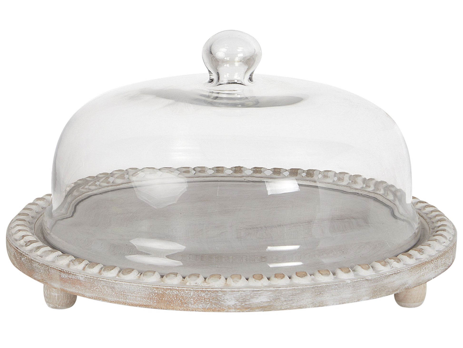 Diese Servierplatte ist die perfekte Wahl für jeden, der seine Speisen in Szene setzen möchte. Das Servierbrett besticht nicht nur mit seiner natürlichen Holzmaserung, sondern auch mit seinem weiss lackierten Finish, das die natürliche Holzmaserung besonders gut zur Geltung bringt und für eine reizende Antik-Optik sorgt. Die Tortenplatte ist mit einer passenden Glashaube ausgestattet, die Ihre Desserts oder andere Köstlichkeiten schützt sowie einen optischen Blickfang auf dem Esstisch bildet. Die Glockenhaube lässt sich dank des Griffs leicht in die Hand nehmen und auf der Gebäckplatte platzieren. Natürlich eignet sich die Kuchenplatte auch als Käse-, Fisch- oder Fleischplatte. Material: Mango Holz. Zusätzliches Material: Glas. Gewicht: 2 Montage: Benötigt keine Montage Holzart: Mangifera indica Holzursprung: China Gesamtabmessungen: 29x29x16 Das Angebot beinhaltet: 1 x Tortenplatte Höhe: 16 zusätzliche Information: Holz ist ein natürliches Material, daher bleibt die feine, natürliche Struktur und die ganz besondere Optik der Holzoberfläche trotz der Farbschicht erhalten., Da jedes Produkt handgefertigt wird, kann es zu kleineren Abweichungen in der Farbe und der äusseren Struktur kommen. Diese Abweichungen stellen keinen Qualitätsmangel dar, sondern sind eine warentypische Eigenschaft., Der sichtbare Alterungseffekt, sowie jede Art von Verfärbung oder Abnutzung sind absichtlich und stellen keinen Qualitätsmangel des Produkts dar. Breite: 29 Tiefe: 29 Art: Tortenplatte Stil: Rustikal Allgemeine Farbe: Heller Holzfarbton Hauptmaterial: Mango Holz