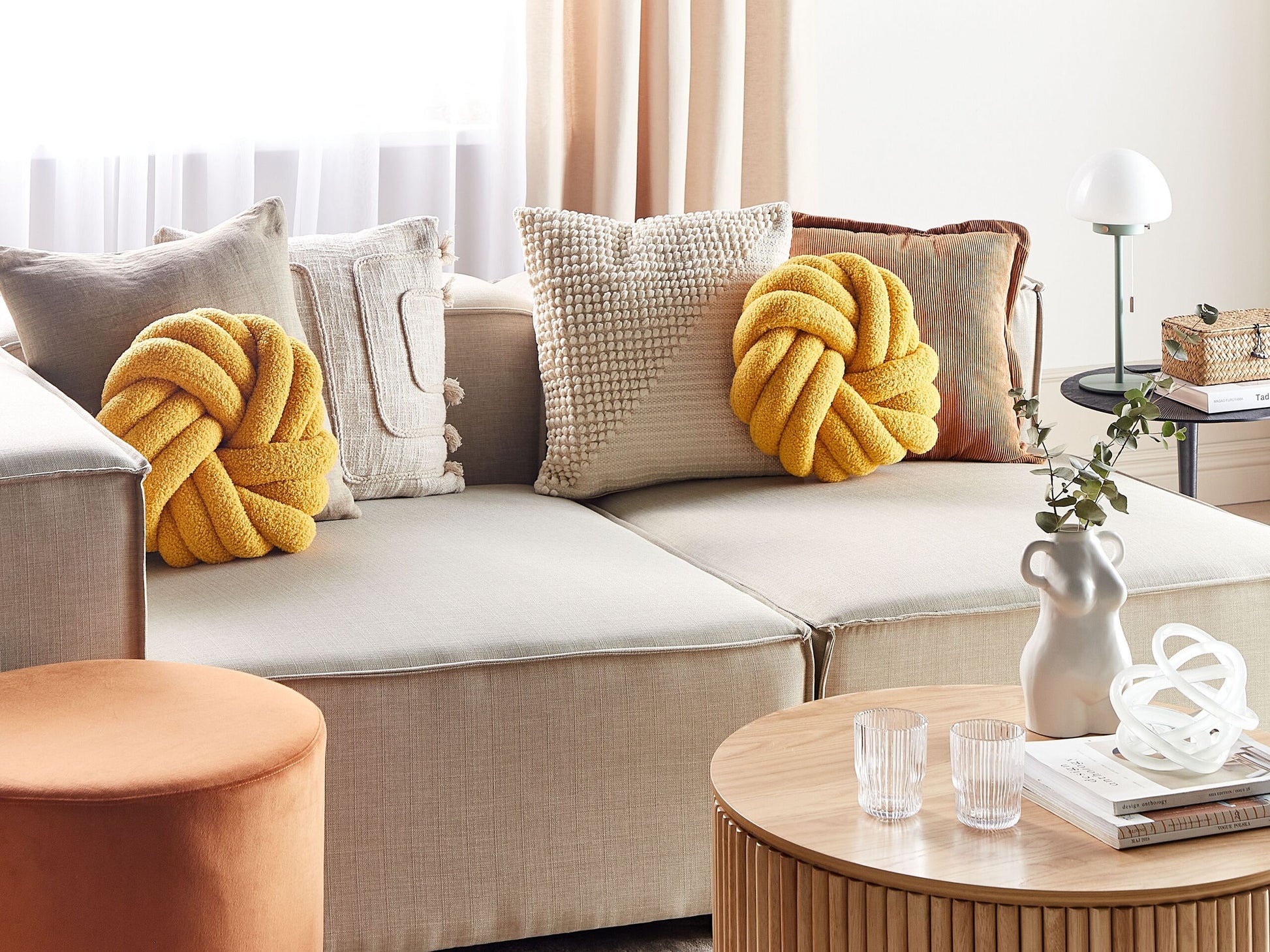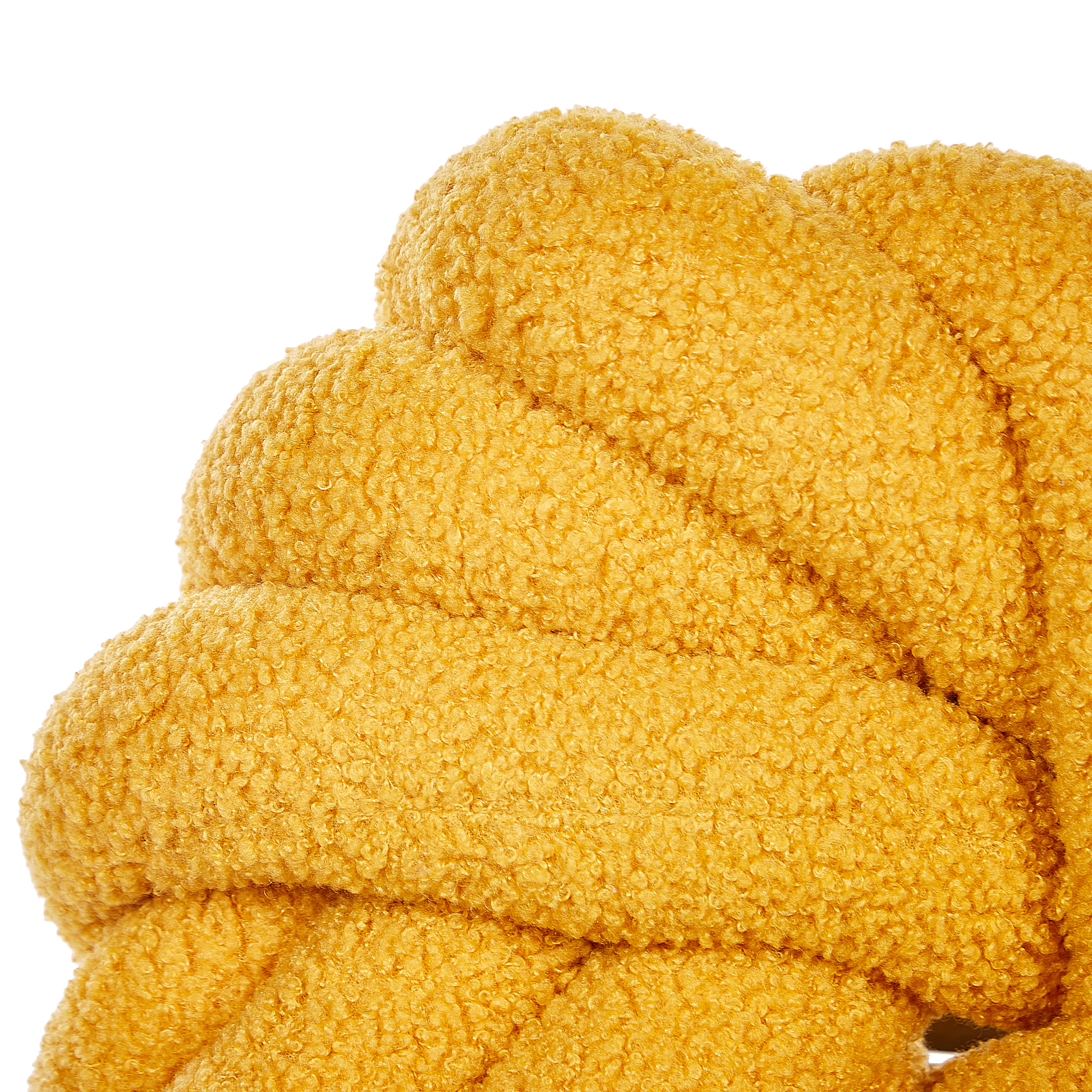 Das von DIY-Trends inspirierte Knotenkissen ist das Nonplusultra unter den Zierkissen für Ihr Wohnzimmer oder Schlafzimmer. Der plüschige Bouclé-Stoff verleiht dem Kissen eine warme Ausstrahlung mit einem eleganten Touch. Ideal für glamouröse und moderne Interieurs, da es den bestehenden Look unterstreicht und sich nahtlos einfügt. Material: Bouclé. Material Zusammensetzung: 100% Polyester Montage: Benötigt keine Montage Das Angebot beinhaltet: 1 x Zierkissen Höhe: 11 zusätzliche Information: Der Kissenbezug ist ein wesentlicher Bestandteil des Kissens., Das Kissen ist vakuumverpackt. Nehmen Sie Ihr Kissen aus der Verpackung heraus und lassen Sie es 24 Stunden lang liegen, bis es seine volle Dichte erreicht., Da jedes Produkt handgefertigt wird, kann es zu kleineren Abweichungen in der Farbe und der äusseren Struktur kommen. Diese Abweichungen stellen keinen Qualitätsmangel dar, sondern sind eine warentypische Eigenschaft. Gestalten: Rund Breite: 31 Tiefe: 31 Art: Dekokissen Stil: Boho Allgemeine Farbe: Gelb Schatten: Senfgelb Muster: Ohne Muster Hauptmaterial: Bouclé Füllmaterial: Schaumstoff