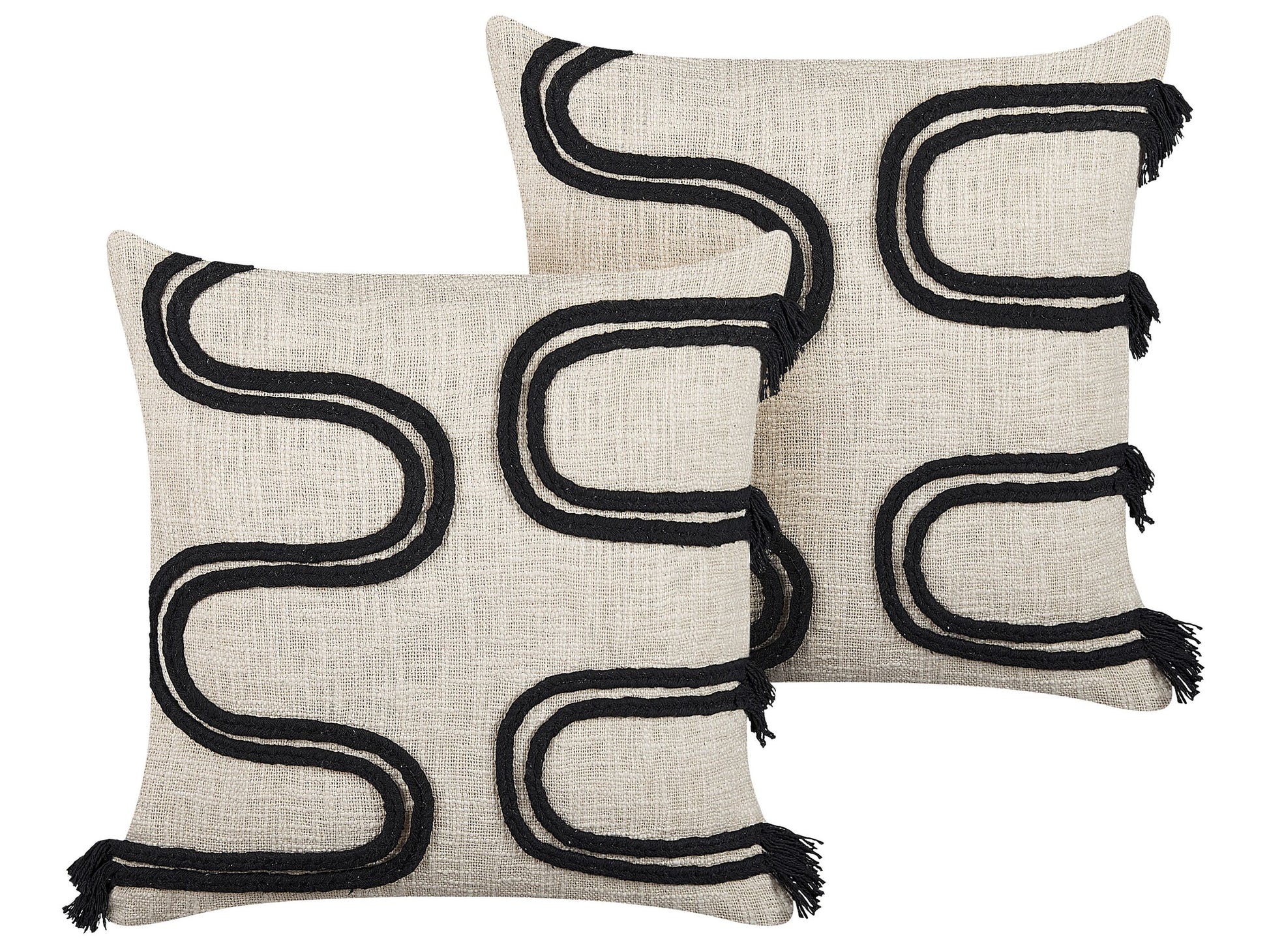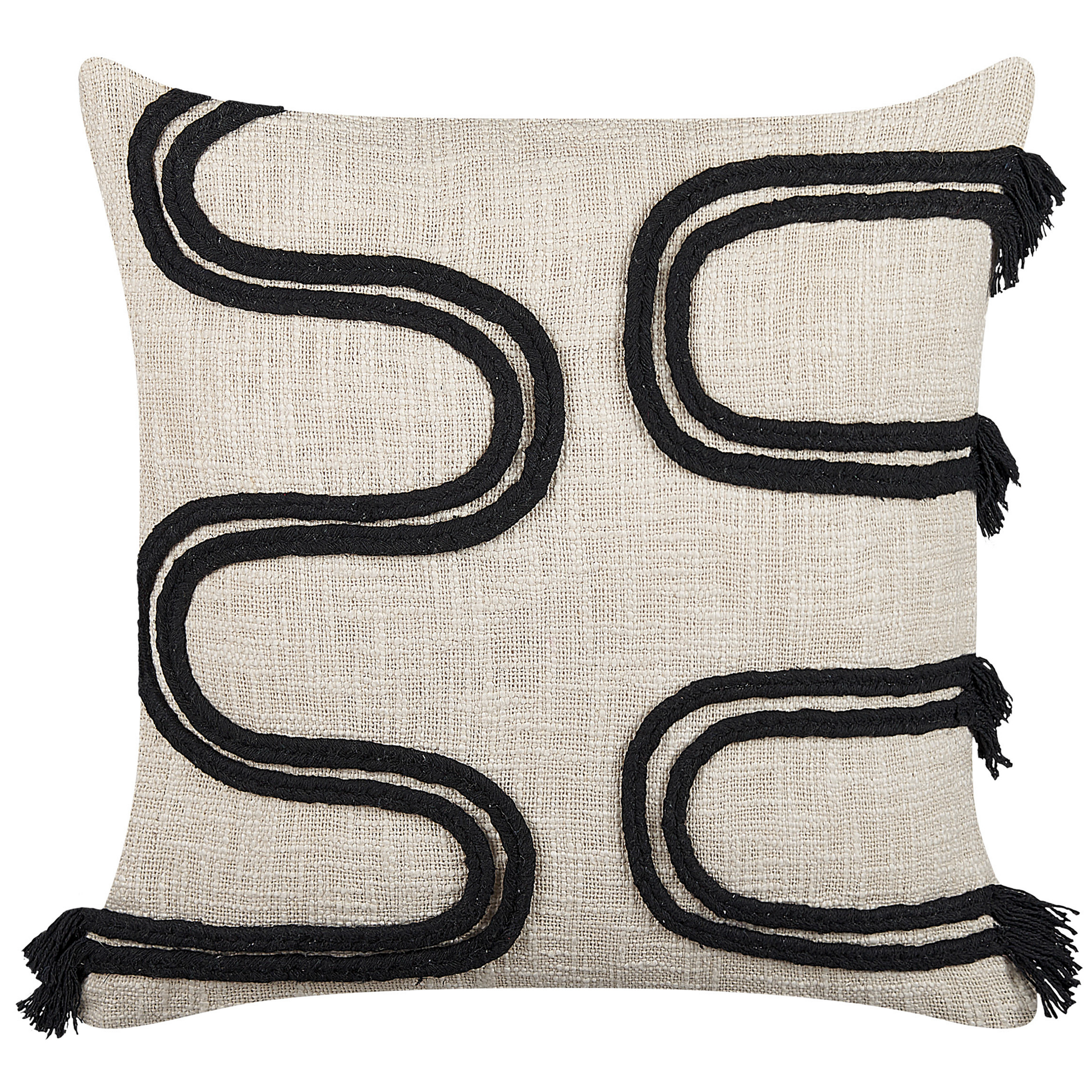 Description: Mit diesem Kissen setzen Sie einen modernen Akzent in Ihrem Interieur. Das von handgefertigte, kurvenförmige Muster mit dekorativen Fransen macht es zu einem perfekten Accessoire im abstrakten Stil für Ihr Sofa oder Bett. Durch die Kombination der Farben Hellbeige und Schwarz passt es zu einer Vielzahl von Einrichtungsstilen. Ausserdem ist das Kissen aus Baumwolle gefertigt und dick gepolstert, was einen angenehmen Komfort bei der Benutzung garantiert.   Material: Baumwolle. Material Zusammensetzung: 100% Baumwolle Montage: Benötigt keine Montage Das Angebot beinhaltet: 2 x Zierkissen Höhe: 14 zusätzliche Information: Das Kissen ist vakuumverpackt. Nehmen Sie Ihr Kissen aus der Verpackung heraus und lassen Sie es 24 Stunden lang liegen, bis es seine volle Dichte erreicht. Gestalten: Quadratisch Breite: 45 Tiefe: 45 Art: Dekokissen 2er Set Stil: Boho Allgemeine Farbe: Beige Schatten: Hellbeige Muster: Geometrisches Muster Hauptmaterial: Baumwolle Füllmaterial: Polyester