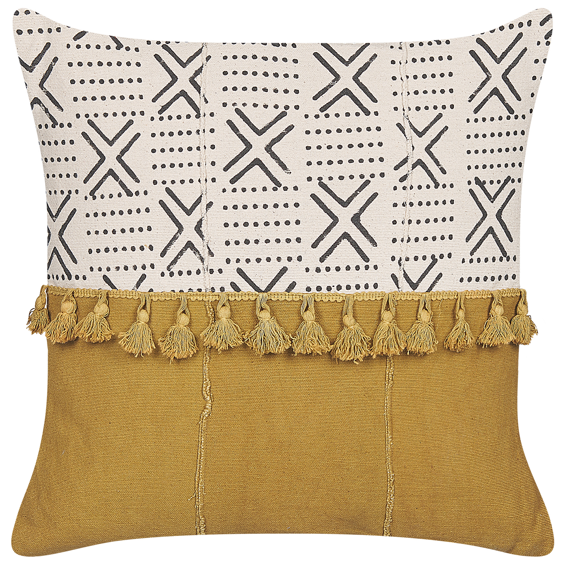 Diese auffälligen Zierkissen sind die ideale Ergänzung für Ihr Sofa oder Bett. Die Kombination aus senfgelbem Stoff mit handgefertigten Quasten und geometrischem Muster machen sie zu auffälligen Wohnaccessoires. Das Besondere an ihnen ist das Motiv, das im Blockdruckverfahren hergestellt wurde. Wenn Sie auf der Suche nach einzigartigen und zugleich schönen Kissen sind, dann ist dieses Set die perfekte Wahl. Material: Baumwolle. Material Zusammensetzung: 100% Baumwolle Montage: Benötigt keine Montage Das Angebot beinhaltet: 2 x Zierkissen Höhe: 10 zusätzliche Information: Das Kissen ist vakuumverpackt. Nehmen Sie Ihr Kissen aus der Verpackung heraus und lassen Sie es 24 Stunden lang liegen, bis es seine volle Dichte erreicht., Bitte beachten Sie, dass jedes Modell leicht von dem im Bild dargestellten abweichen kann. Die Anordnung der Farben und Muster kann unterschiedlich ausfallen und wird nicht als Produktfehler, sondern als Merkmal betrachtet Gestalten: Quadratisch Breite: 45 Tiefe: 45 Art: Dekokissen 2er Set Stil: Boho Allgemeine Farbe: Weiss Schatten: Cremeweiss Muster: Geometrisches Muster Hauptmaterial: Baumwolle Füllmaterial: Polyester