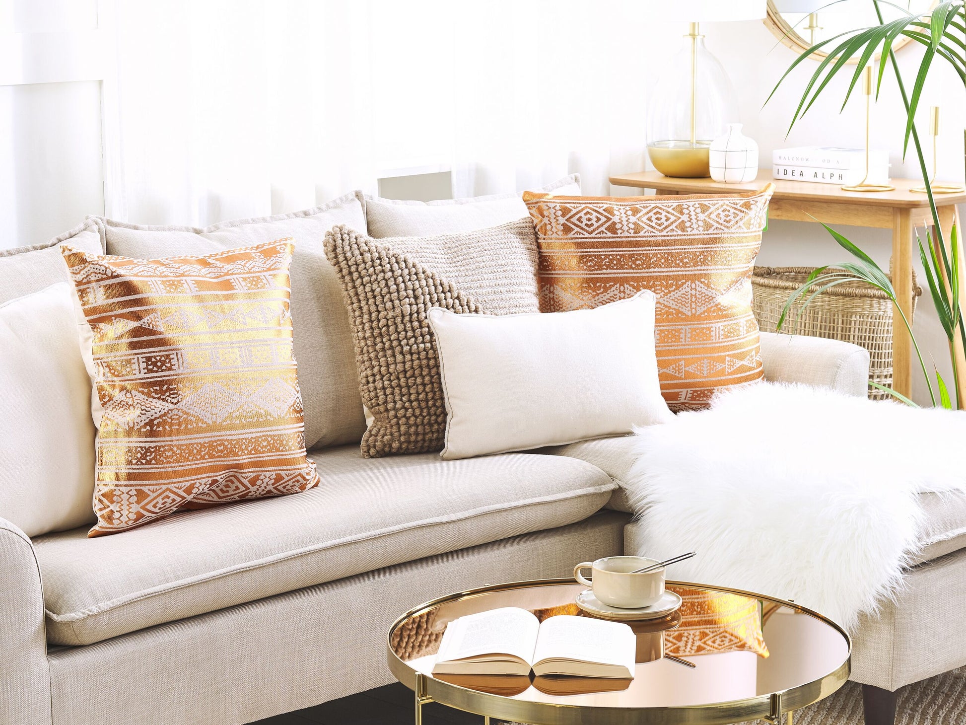 Setzen Sie auf ein ausgefallenes Zierkissen Set mit luxurösem Metallic-Effekt, welches Sie sofort ins Herz schliessen werden. Der bezaubernde, kupferfarbene Folien-Aufdruck befindet sich auf der Vorderseite der Baumwollbezüge. So schimmern die Kissenhüllen effektvoll bei jedem Licht. Die Rückseiten der Wohnzimmer-Kissen sind in einem dezenten beigen Farbton gehalten. Bei Bedarf lassen sich die Kissenbezüge dank der versteckten Reissverschlüsse leicht abnehmen und reinigen. Die dicken Polyesterfüllungen sind Allergiker-gerecht und machen das Kissen Set angenehm weich. Ob Wohn-, Kinder- oder Schlafzimmer – die exclusiven Zierpolster werden Ihr Sofa, Bett, Ihren Hängesessel oder Wohnzimmersessel bestimmt verschönern. Material: Baumwolle. Material Zusammensetzung: 100% Baumwolle Montage: Benötigt keine Montage Das Angebot beinhaltet: 2 x Zierkissen Höhe: 15 zusätzliche Information: Das Kissen ist vakuumverpackt. Nehmen Sie Ihr Kissen aus der Verpackung heraus und lassen Sie es 24 Stunden lang liegen, bis es seine volle Dichte erreicht. Gestalten: Quadratisch Breite: 50 Tiefe: 50 Art: Dekokissen 2er Set Stil: Modern Allgemeine Farbe: Kupfer Muster: Geometrisches Muster Hauptmaterial: Baumwolle Füllmaterial: Polyester