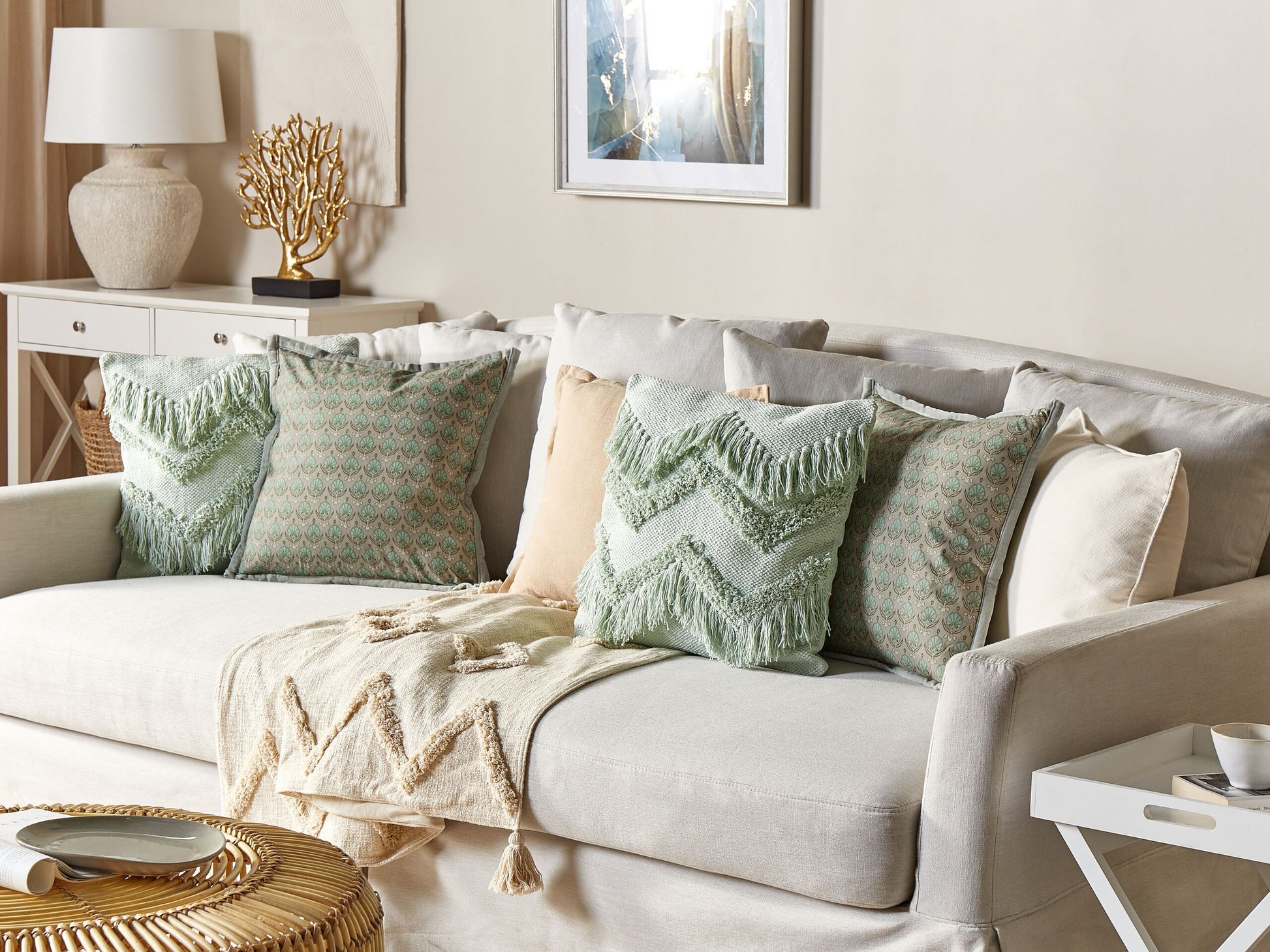 Dieses quadratische Sofakissen bezaubert mit einem dezenten Muster und beruhigendem Grünton, die zusammen Ihrem Wohnraum einen gemütlichen Look verpassen werden. Der weiche Kissenbezug besteht aus hochwertiger Baumwolle und ist mit einer dicken Füllung versehen, so dass Sie das Kissen nicht nur als Dekoration, sondern auch zum Ausruhen verwenden können. Dank dem handgefertigten Motiv, welches in einem Blockdruckverfahren entsteht, ist jedes Modell einzigartig. Der versteckte Reissverschluss erlaubt es die Kissenhülle schnell abzunehmen, auszutauschen und zu waschen. Der Baumwollbezug ist zusätzlich mit einer dekorativen Samtpaspel verschönert sowie beidseitig und vollflächig bedruckt. Material: Samtstoff. Zusätzliches Material: Baumwolle. Material Zusammensetzung: 100% Baumwolle Montage: Benötigt keine Montage Das Angebot beinhaltet: 1 x Zierkissen Höhe: 10 zusätzliche Information: Das Kissen ist vakuumverpackt. Nehmen Sie Ihr Kissen aus der Verpackung heraus und lassen Sie es 24 Stunden lang liegen, bis es seine volle Dichte erreicht., Da jedes Produkt handgefertigt wird, kann es zu kleineren Abweichungen in der Farbe und der äusseren Struktur kommen. Diese Abweichungen stellen keinen Qualitätsmangel dar, sondern sind eine warentypische Eigenschaft. Gestalten: Quadratisch Breite: 45 Tiefe: 45 Art: Dekokissen Stil: Klassisch Allgemeine Farbe: Grün Schatten: Olivgrün Muster: Pflanzenmuster Hauptmaterial: Samtstoff Füllmaterial: Polyester