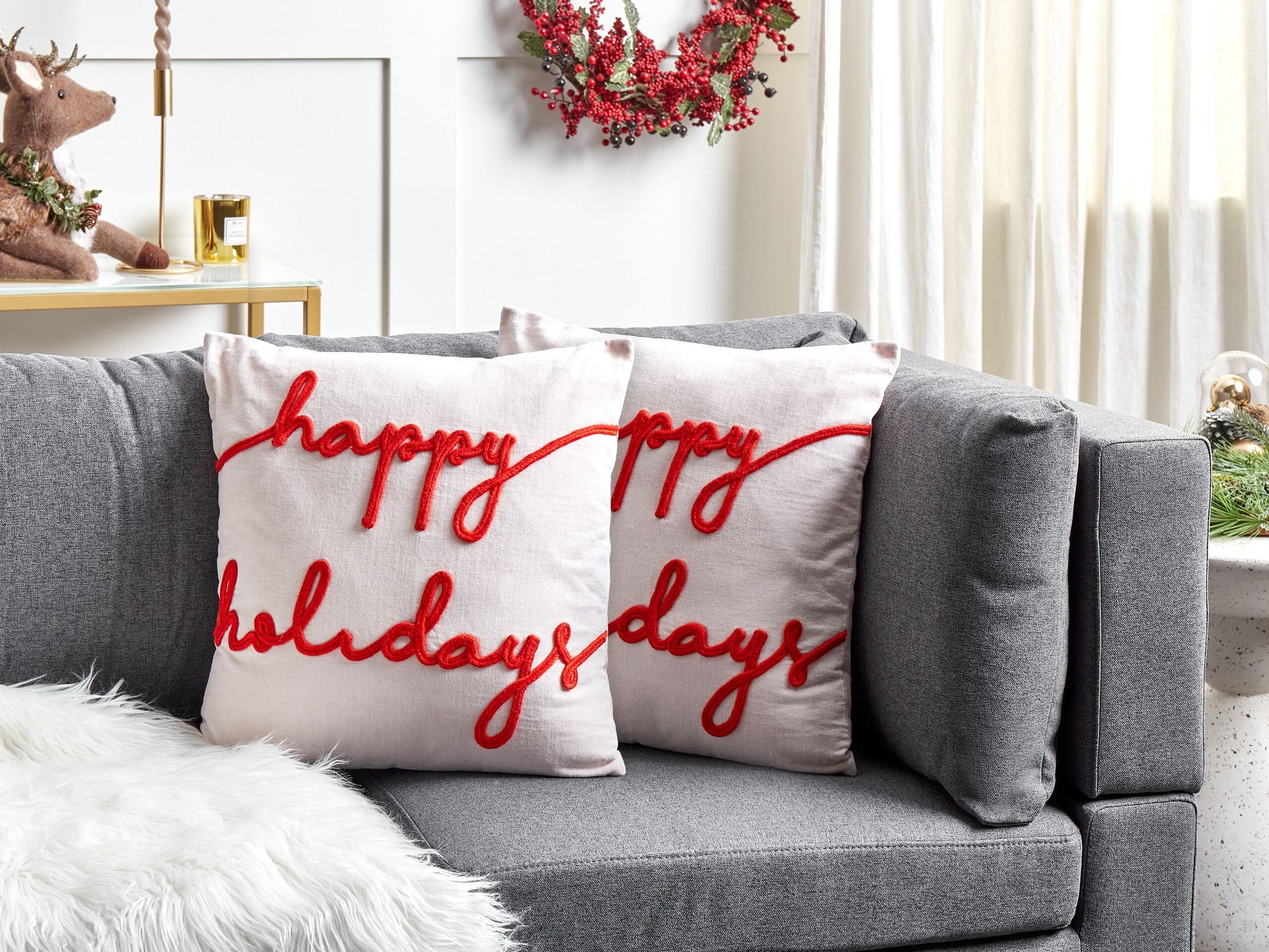 Description: Dieses moderne Zierkissen-Set bildet eine ideale Ergänzung für jeden gemütlichen Weihnachtslook. Die Vorderseiten der Kissenhüllen bestehen aus geschmeidigem Baumwollsamt und sind mit roten, weihnachtlichen Schriftzügen versehen, während die Rückseiten der Bezüge sich aus weichen Baumwollfasern zusammensetzen. Zudem sind die Sofakissen mit weichen Füllmaterialien aus Polyester, praktischen Reissverschlüssen und passenden Biesen verschönert. Material: Samtstoff. Material Zusammensetzung: 100% Baumwolle Montage: Benötigt keine Montage Das Angebot beinhaltet: 2 x Zierkissen Höhe: 12 zusätzliche Information: Bitte beachten Sie, dass Samtstoff unter verschiedenen Lichtverhältnissen eine andere Optik haben kann – das Material schimmert bei Tageslicht stärker und wirkt bei künstlicher Beleuchtung in Innenräumen eher gedämpft. Aufgrund der glatten, hochdichten Struktur des Gewebes kann sein Farbton auch variieren, wenn man mit der Hand in verschiedene Richtungen und Winkel über den Stoff fährt. Um den Farbton auszugleichen und Druckstellen zu vermeiden, sollte der Webstoff sanft mit einer offenen Handfläche in eine Richtung gestrichen, mit einem feuchten Tuch abgewischt oder einem Dampfbügeleisen gebügelt werden., Da jedes Produkt handgefertigt wird, kann es zu kleineren Abweichungen in der Farbe und der äusseren Struktur kommen. Diese Abweichungen stellen keinen Qualitätsmangel dar, sondern sind eine warentypische Eigenschaft. Gestalten: Quadratisch Breite: 45 Tiefe: 45 Art: Dekokissen 2er Set Stil: Modern Allgemeine Farbe: Weiss Muster: Weihnachtsmotiv Hauptmaterial: Samtstoff Füllmaterial: Polyester