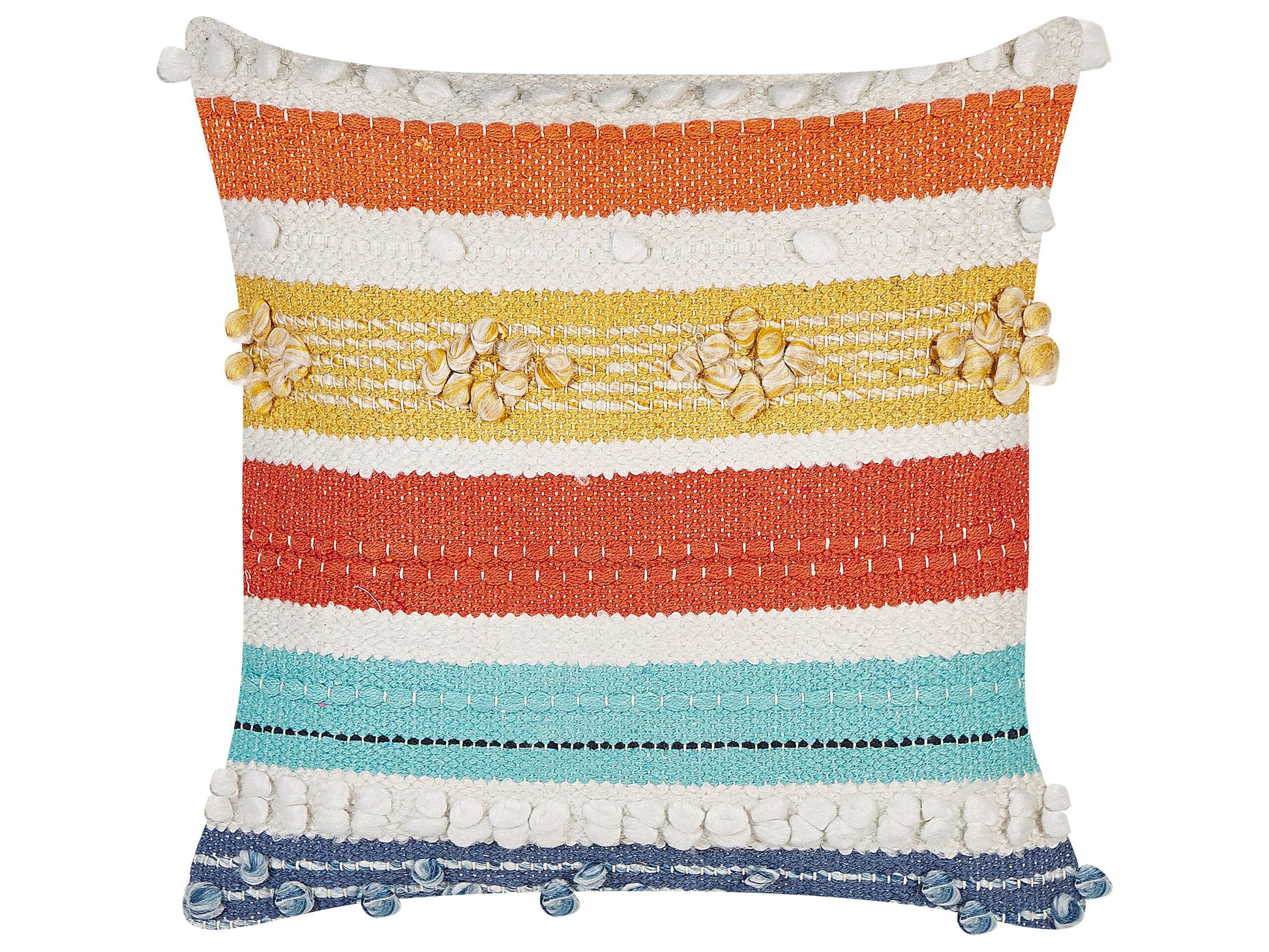 Description: Bringen Sie frischen Wind in Ihr Zuhause mit diesem farbenfrohen, sommerlichen Kissen. Kein Kissen gleicht dem anderen, denn die gesamte Kollektion ist handgefertigt. Die Vorderseite weist einen Farbmix auf, der von leuchtendem Orange bis zu tiefem Dunkelblau reicht. Das Kissen ist ein echter Hingucker und passt zu vielen Einrichtungsstilen. Dank des Reissverschlusses auf der Rückseite des Bezugs lässt sich das Kissen ausserdem leicht reinigen. Material: Baumwolle. Zusätzliches Material: Polyester. Material Zusammensetzung: 80% Baumwolle, 20% Polyester Montage: Benötigt keine Montage Das Angebot beinhaltet: 1 x Zierkissen Höhe: 10 zusätzliche Information: Das Kissen ist vakuumverpackt. Nehmen Sie Ihr Kissen aus der Verpackung heraus und lassen Sie es 24 Stunden lang liegen, bis es seine volle Dichte erreicht., Da jedes Produkt handgefertigt wird, kann es zu kleineren Abweichungen in der Farbe und der äusseren Struktur kommen. Diese Abweichungen stellen keinen Qualitätsmangel dar, sondern sind eine warentypische Eigenschaft. Gestalten: Quadratisch Breite: 45 Tiefe: 45 Art: Dekokissen Stil: Boho Allgemeine Farbe: Orange Schatten: Dunkelblau Muster: Streifen Hauptmaterial: Baumwolle Füllmaterial: Polyester