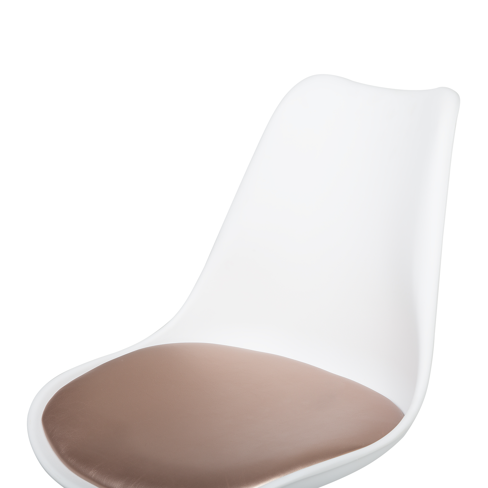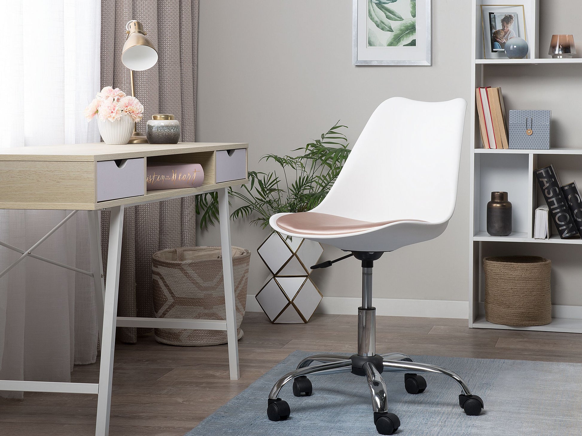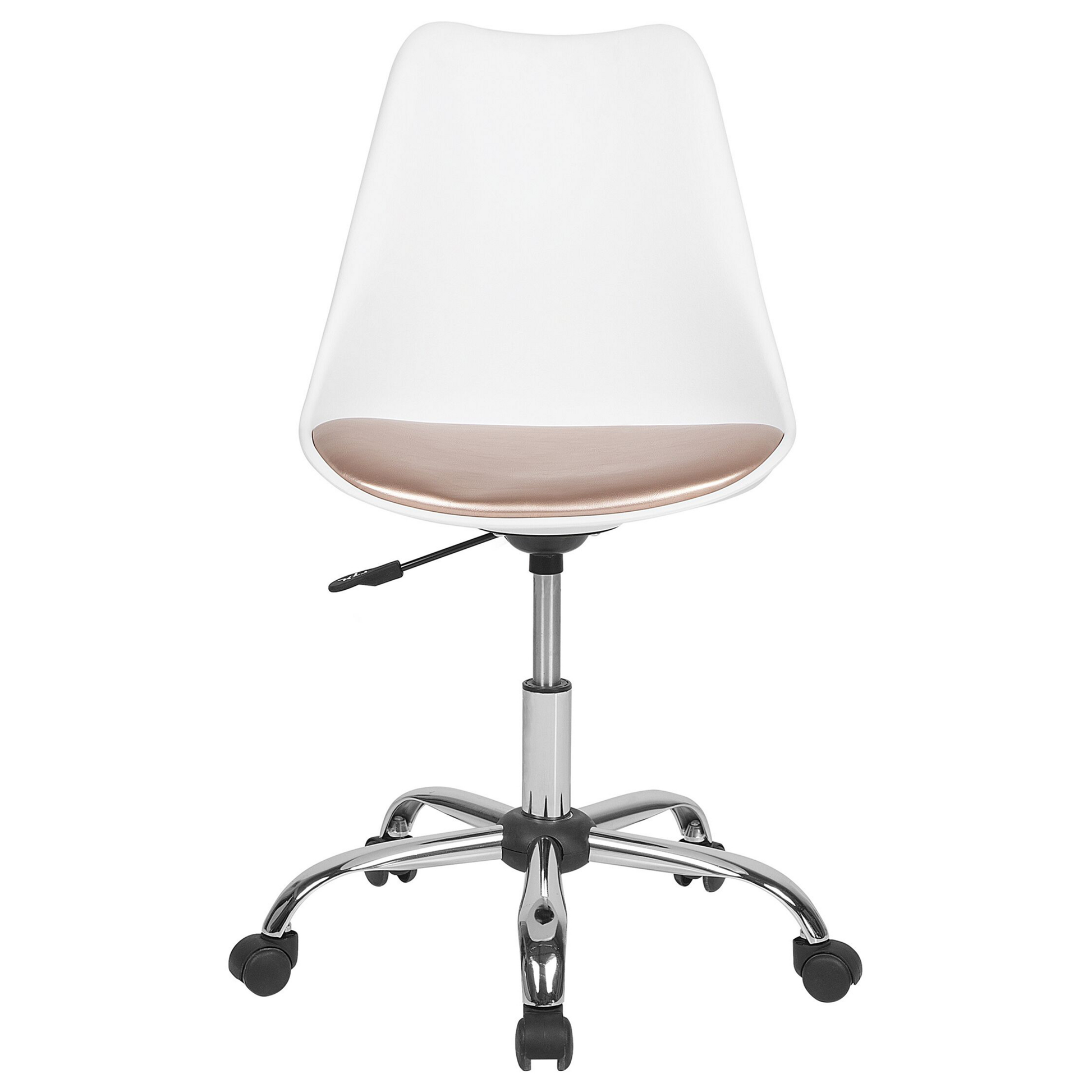 Ein unverzichtbares Element jedes Arbeitsbereichs! Nutzen Sie die Gasdruckfeder, um den Stuhl schnell in die gewünschte Höhe zu bringen und einen angenehmen Sitzplatz zu schaffen. Die besondere Sitzfläche aus Kunstleder in Gold-Rosa trägt nicht nur zum Komfort aber auch zum Flair des Zimmers bei. Die praktischen Laufrollen mit denen man den Sessel auch in sitzender Position an jeden Ort verschieben kann, machen ihn zum funktionalen Begleiter bei der Arbeit. Bei richtiger Pflege überdauert das Modell viele Jahre.   Material: Kunstleder. Zusätzliches Material: Kunstleder, Schaumstoff, Nylon, Polypropylen.  Material Zusammensetzung: 100% Kunstleder Gewicht: 5 Montage: Nicht montiert Gewichtskapazität: 100 Sitzhöhe: 45-55 Das Angebot beinhaltet: 1 x Bürostuhl Sitzfläche: 44x41 Höhe: 79-89 zusätzliche Information: Um sicherzustellen, dass die Konstruktion stabil und die Nutzungssicherheit gewährleistet ist, sollte man 2 Wochen nach dem Zusammenbau überprüfen, ob die Ware auch korrekt montiert wurde. Ausserdem ist alle 3 Monate zu prüfen, ob die Schrauben richtig festgezogen sind. Breite: 60 Tiefe: 60 Art: Bürostuhl Stil: Modern Allgemeine Farbe: Weiss Hauptmaterial: Kunstleder