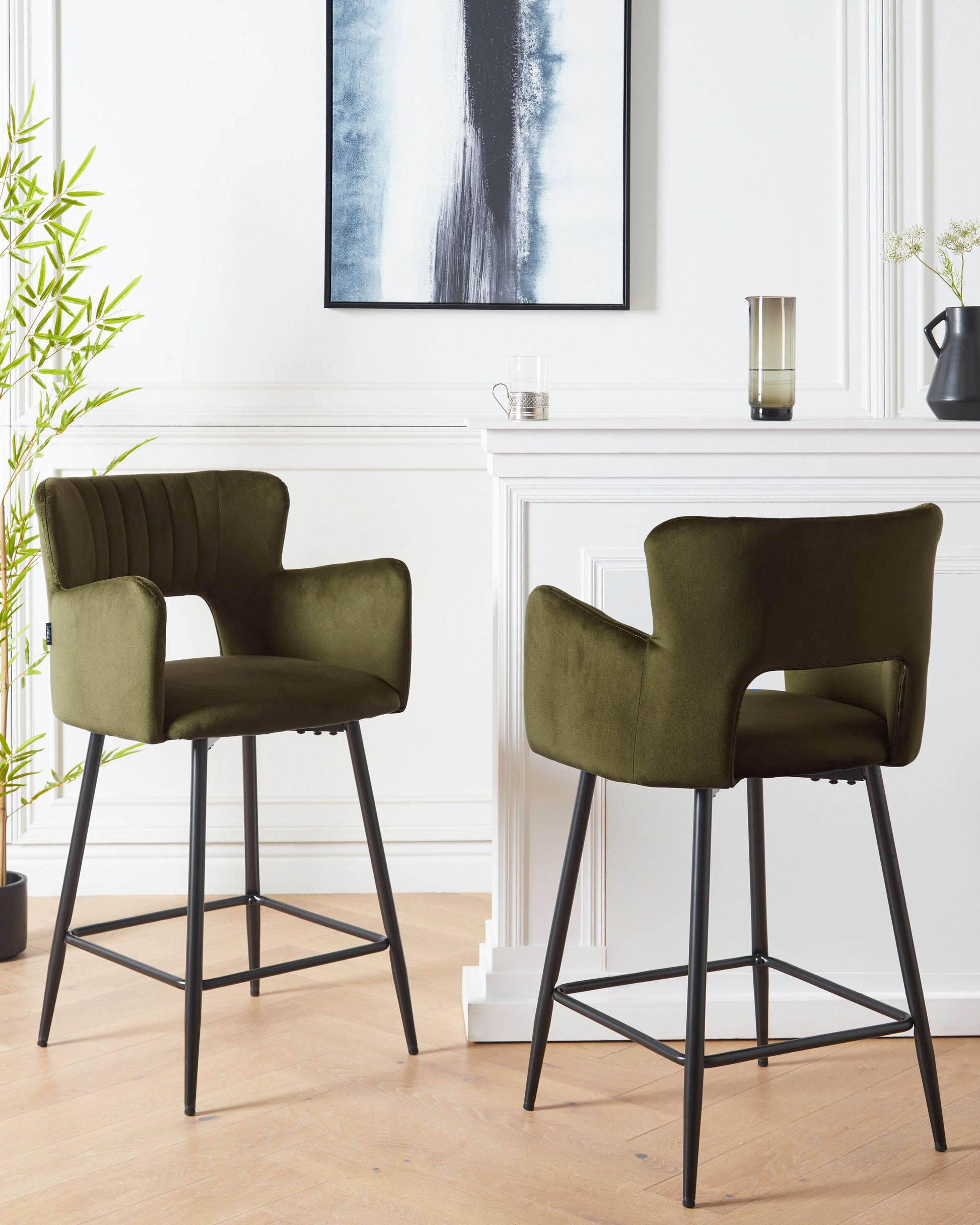 Retro-Barstühle in moderner Ausführung – ihre formschönen Lehnen und die geschmeidigen, weichen Samtbezüge schaffen ein harmonisches Ganzes und machen die Stühle zu universellen Begleitern an Ihrer Ess- oder Küchenbar. Die Schaumstoff-Polsterung, zusätzlichen Fussstützen und schmalen Armlehnen heben den Sitzkomfort der Polsterstühle, während die gesteppte Innenseite der Rückenlehne Eleganz versprüht. Dank des praktischen Loches in der Mitte der Lehnen lassen sich die Thekenstühle einfach greifen und verschieben. Die Metallbeine versprechen nicht nur Stabilität, sie sind auch mit Schutzkappen ausgestattet. Material: Samtstoff. Zusätzliches Material: Eisen. Material Zusammensetzung: 100% Polyester Gewicht: 7 Montage: Beine / Füsse nicht montiert Gewichtskapazität: 120 Polsterstärke: 5 Sitzhöhe: 55 Das Angebot beinhaltet: 2 x Barstuhl Sitzfläche: 44x44 Höhe: 91 zusätzliche Information: Bitte beachten Sie, dass Samtstoff unter verschiedenen Lichtverhältnissen eine andere Optik haben kann – das Material schimmert bei Tageslicht stärker und wirkt bei künstlicher Beleuchtung in Innenräumen eher gedämpft. Aufgrund der glatten, hochdichten Struktur des Gewebes kann sein Farbton auch variieren, wenn man mit der Hand in verschiedene Richtungen und Winkel über den Stoff fährt. Um den Farbton auszugleichen und Druckstellen zu vermeiden, sollte der Webstoff sanft mit einer offenen Handfläche in eine Richtung gestrichen, mit einem feuchten Tuch abgewischt oder einem Dampfbügeleisen gebügelt werden. Breite: 51 Tiefe: 44 Art: Set mit 2 Barstühlen Stil: Modern Allgemeine Farbe: Grün Schatten: Olivgrün Hauptmaterial: Samtstoff