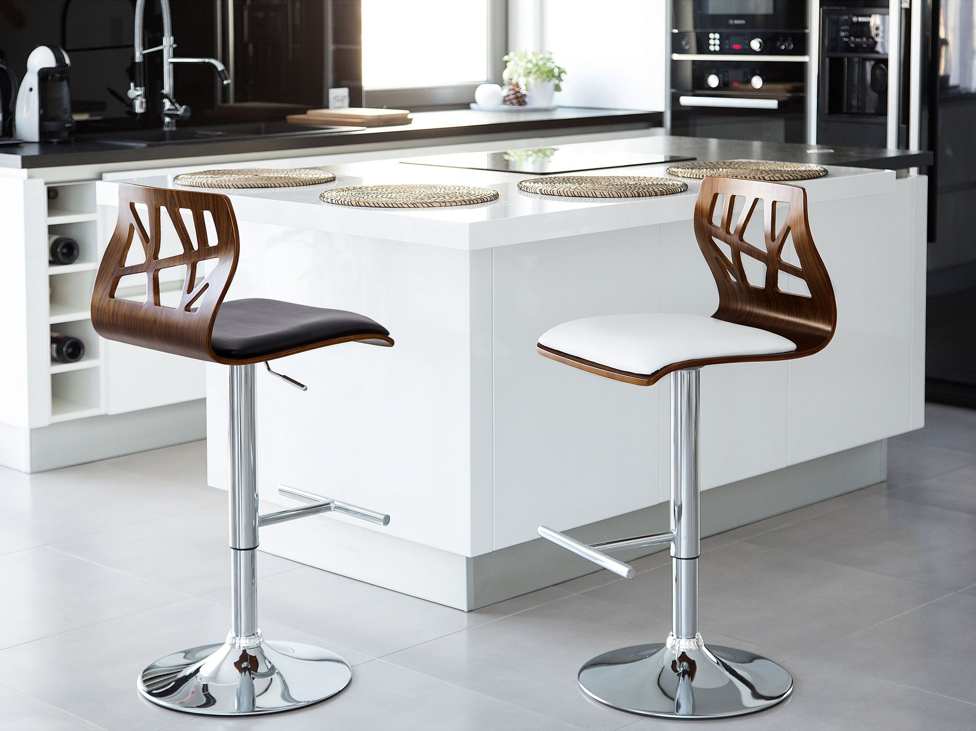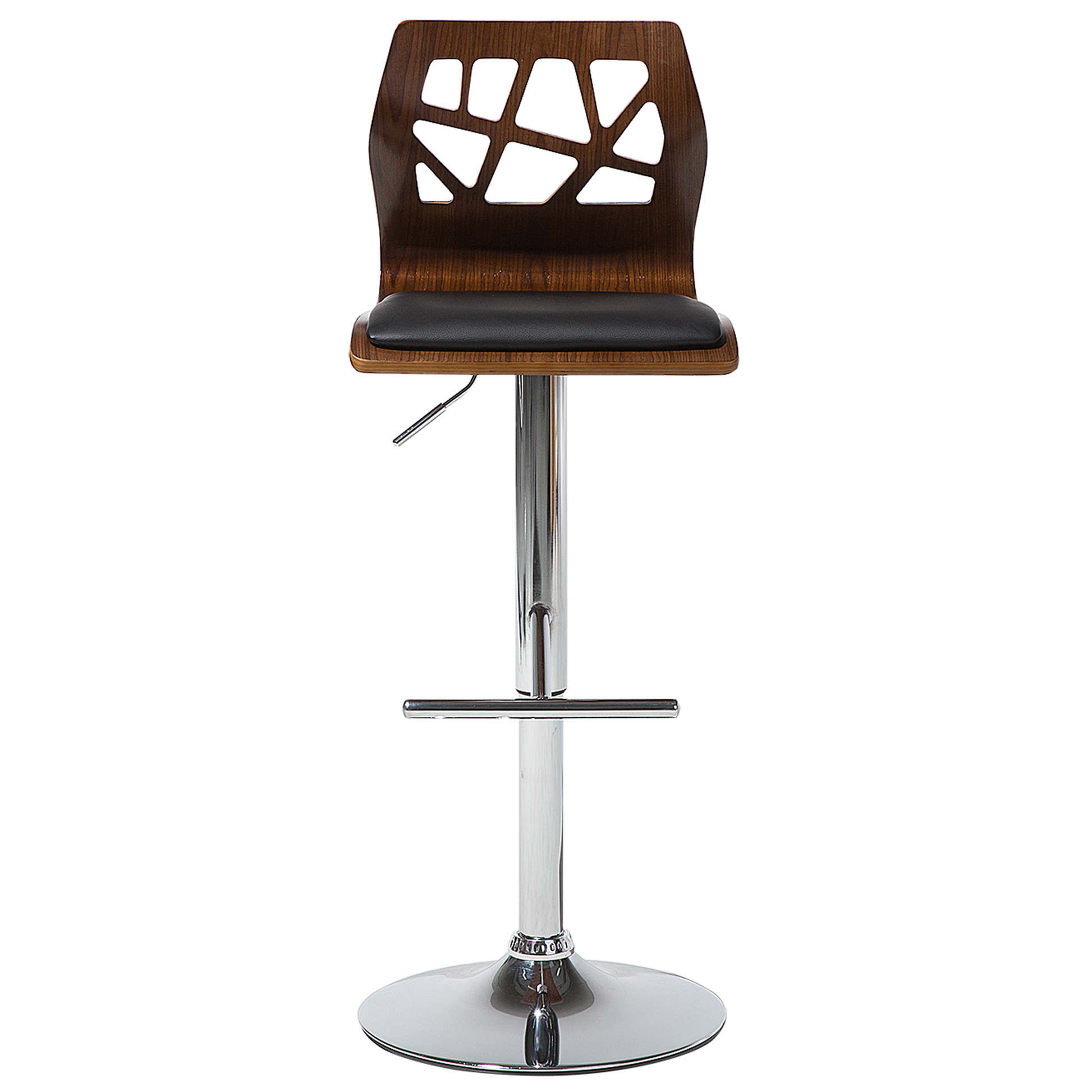 Dieser Barhocker ist nicht nur optisch ein Highlight, sondern er erfüllt auch alle Ansprüche an Stabilität, hochwertiges Material, solide Verarbeitung und besten Sitzkomfort. Sein ausgefallenes Design verdankt er seiner Rückenlehne, welche in einem abstrakten Muster durchbrochen ist. Die Sitzhöhe ist mit einer Gasdruckfeder beliebig einstellbar. Der Barhocker verfügt über ein stabiles Gestell aus glänzendem Metall in Silber. Die wunderschön geschwungene Sitzschale ist aus lackiertem Sperrholz in einem walnussfarbenem Farbton gefertigt, und die Sitzfläche ist angenehm mit schwarzem Kunstleder gepolstert.  Material: Kunstleder. Zusätzliches Material: Stahl.  Material Zusammensetzung: 100% Kunstleder Gewicht: 7 Montage: Beine / Füsse nicht montiert Gewichtskapazität: 140 Sitzhöhe: 62/82 Das Angebot beinhaltet: 1 x Barstuhl Sitzfläche: 36x41 Höhe: 112 zusätzliche Information: Um sicherzustellen, dass die Konstruktion stabil und die Nutzungssicherheit gewährleistet ist, sollte man 2 Wochen nach dem Zusammenbau überprüfen, ob die Ware auch korrekt montiert wurde. Ausserdem ist alle 3 Monate zu prüfen, ob die Schrauben richtig festgezogen sind. Breite: 42 Tiefe: 42 Art: Barhocker Stil: Retro Allgemeine Farbe: Dunkler Holzfarbton Hauptmaterial: Kunstleder