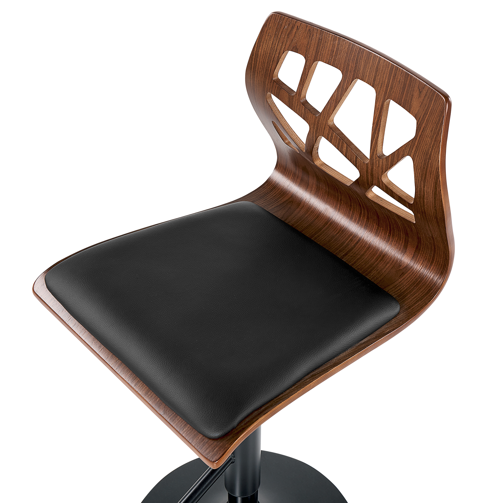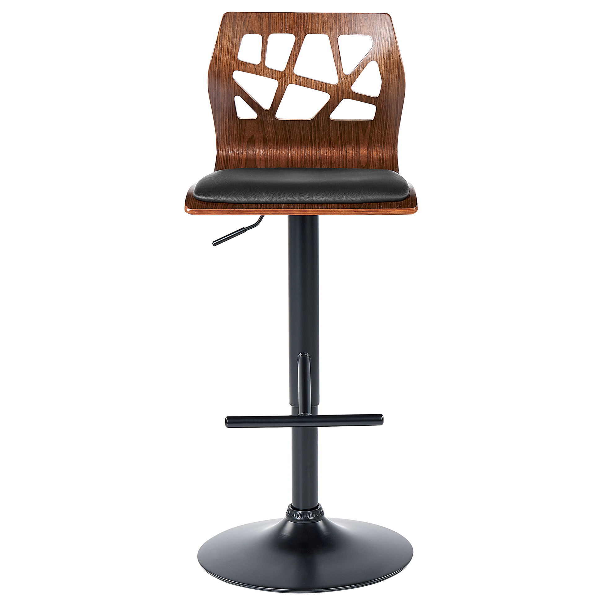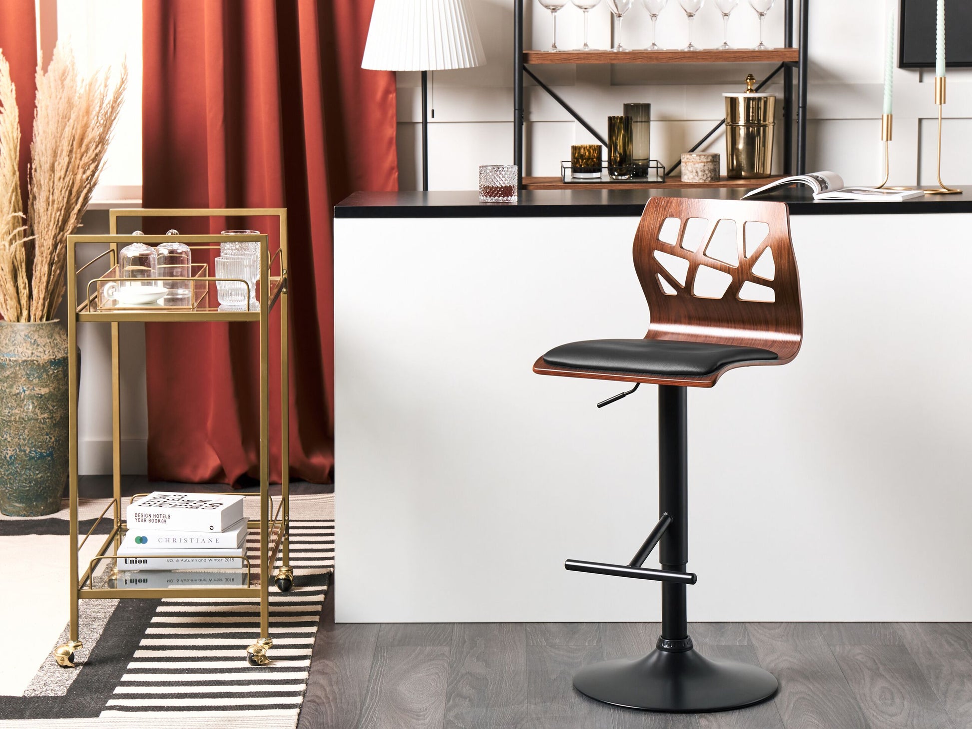 Dieser Barhocker ist nicht nur optisch ein Highlight, sondern er erfüllt auch alle Ansprüche an Stabilität, hochwertiges Material, solide Verarbeitung und besten Sitzkomfort. Sein ausgefallenes Design verdankt er seiner Rückenlehne, welche in einem abstrakten Muster durchbrochen ist. Die Sitzhöhe ist mit einer Gasdruckfeder beliebig einstellbar. Der Barhocker verfügt über ein stabiles Gestell aus Metall in Schwarz. Die wunderschön geschwungene Sitzschale ist aus lackiertem Sperrholz in einem walnussfarbenem Farbton gefertigt, und die Sitzfläche ist angenehm mit schwarzem Kunstleder gepolstert.  Material: Kunstleder. Zusätzliches Material: Stahl.  Material Zusammensetzung: 100% Kunstleder Gewicht: 7 Montage: Teilweise montiert Gewichtskapazität: 140 Sitzhöhe: 62/82 Das Angebot beinhaltet: 1 x Barstuhl Sitzfläche: 36x41 Höhe: 96-112 zusätzliche Information: Um sicherzustellen, dass die Konstruktion stabil und die Nutzungssicherheit gewährleistet ist, sollte man 2 Wochen nach dem Zusammenbau überprüfen, ob die Ware auch korrekt montiert wurde. Ausserdem ist alle 3 Monate zu prüfen, ob die Schrauben richtig festgezogen sind. Breite: 41 Tiefe: 36 Art: Barhocker Stil: Modern Allgemeine Farbe: Dunkler Holzfarbton Hauptmaterial: Kunstleder