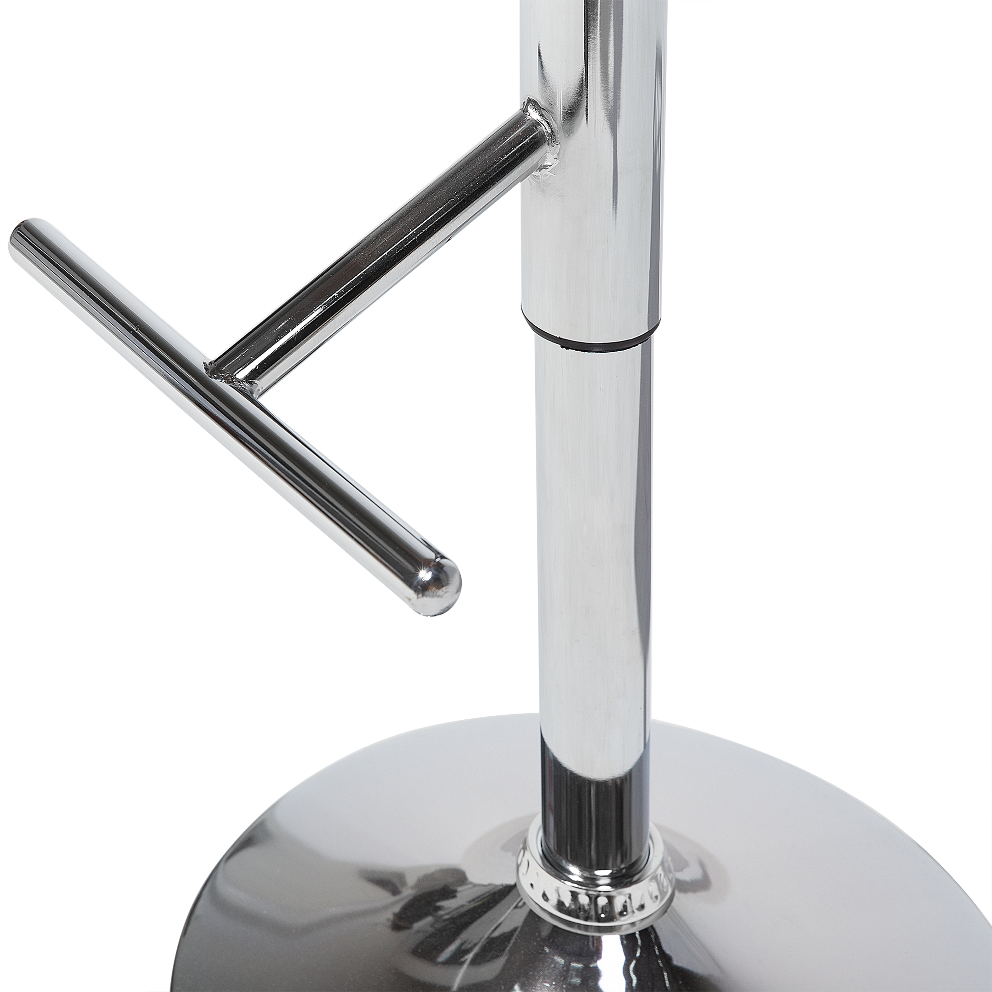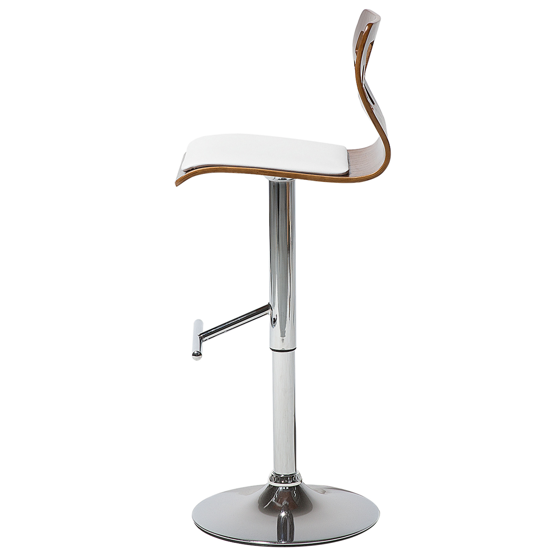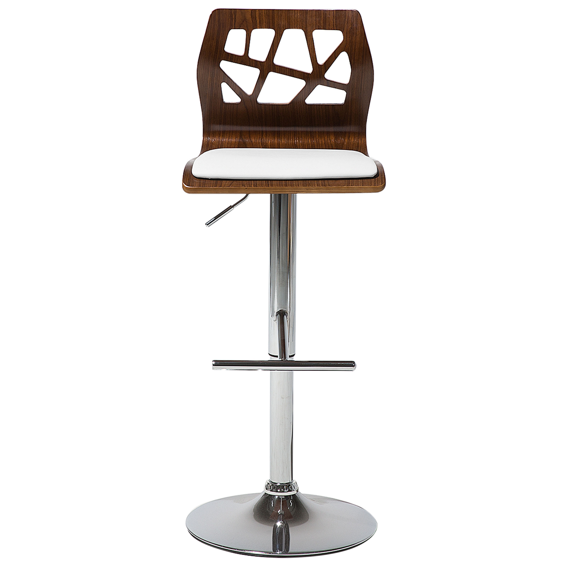 Dieser Barhocker ist nicht nur optisch ein Highlight, sondern er erfüllt auch alle Ansprüche an Stabilität, hochwertiges Material, solide Verarbeitung und besten Sitzkomfort. Sein ausgefallenes Design verdankt er seiner Rückenlehne, welche in einem abstrakten Muster durchbrochen ist.  Der um 360° frei drehbare Barstuhl hat eine breite Fussstütze für zusätzlichen Komfort. Die Sitzhöhe ist mit einer Gasdruckfeder beliebig einstellbar. Der Barhocker verfügt über ein stabiles Gestell aus glänzendem Metall in Silber. Die wunderschön geschwungene Sitzschale ist aus lackiertem Sperrholz in einem walnussfarbenem Farbton gefertigt, und die Sitzfläche ist angenehm mit weissem Kunstleder gepolstert.  Material: Kunstleder. Zusätzliches Material: Stahl.  Material Zusammensetzung: 100% Kunstleder Gewicht: 7 Montage: Beine / Füsse nicht montiert Holzursprung: China Gewichtskapazität: 140 Sitzhöhe: 62/82 Das Angebot beinhaltet: 1 x Barstuhl Sitzfläche: 36x41 Höhe: 112 Breite: 42 Tiefe: 42 Art: Barhocker Stil: Klassisch Allgemeine Farbe: Dunkler Holzfarbton Hauptmaterial: Kunstleder