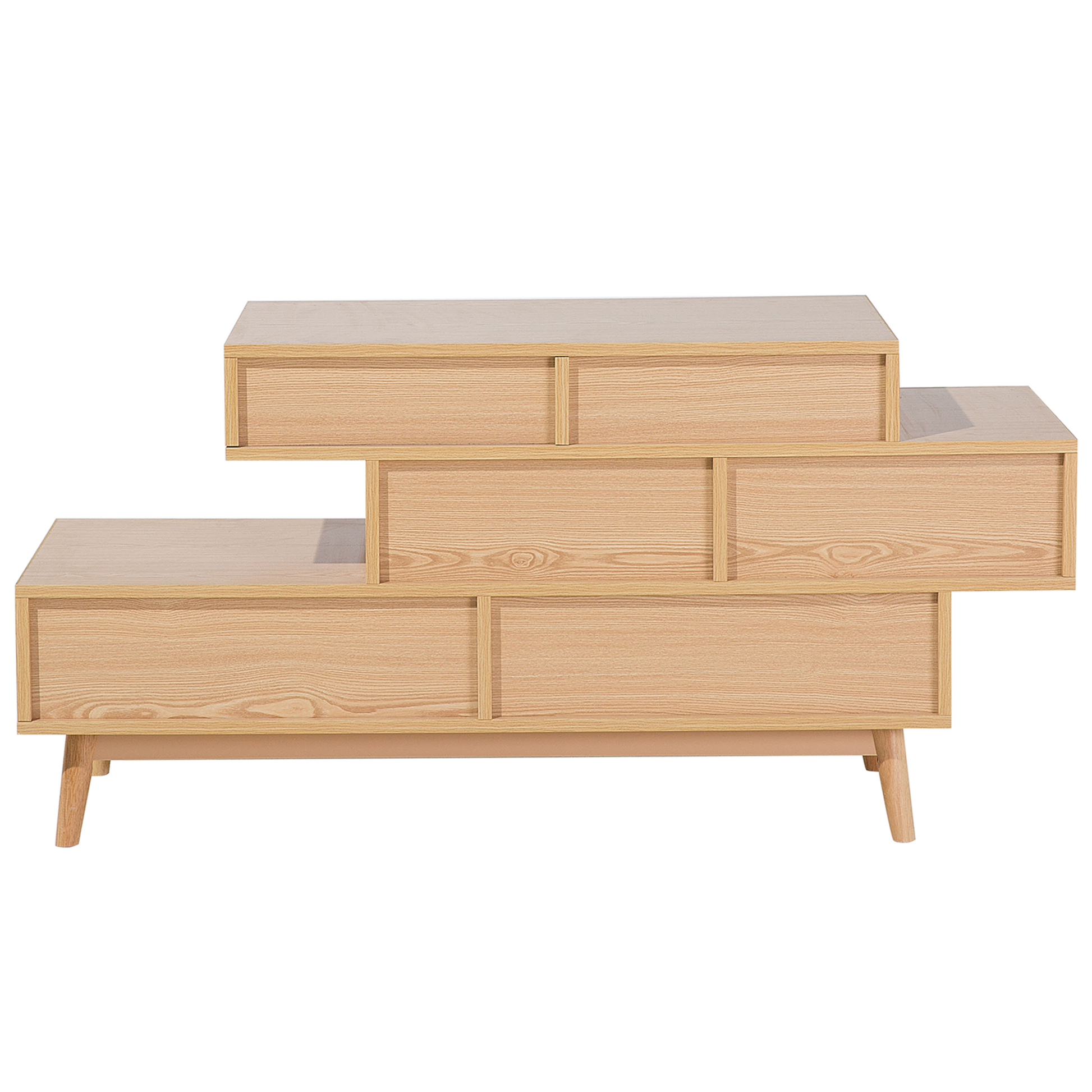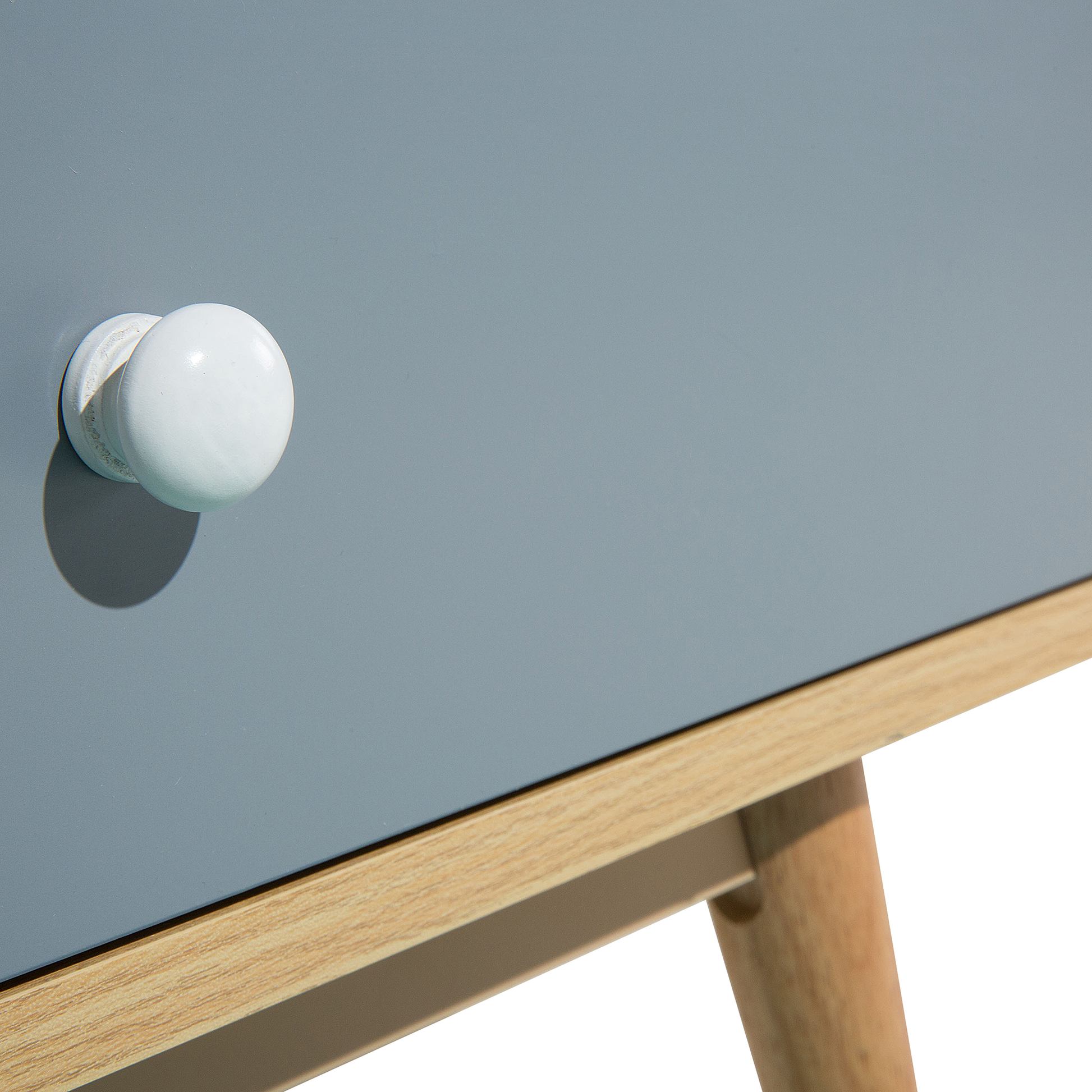 Stauraum braucht nicht nur praktisch zu sein, sondern kann auch richtig schön aussehen. Mit dekorativem Design und praktischer Funktionalität kann dieses Möbelstück in allen Wohn- und Arbeitsbereichen als Kommode oder Sideboard zum Einsatz kommen und fügt sich perfekt in moderne, skandinavische oder natürliche Wohnstile ein. Die versetzte Anordnung der Schubladen und Fächer verleihen dem Sideboard individuellen Charme und eine trendy Ausstrahlung. Der spannende Farbkontrast aus mattem Grau, mattem Weiss und einem warmen, natürlichen Holzfarbton unterstreichen das moderne Design. Zwei schmale und zwei breitere Schubladen sowie zwei offene Fächer bieten viel Stauraum. Der Korpus verfügt über eine pflegeleichte, unempfindliche Melaminbeschichtung, die robusten Beine sind aus solidem Gummibaumholz gefertigt und runde Griffe aus Kiefernholz schmücken die Schubladenfronten aus MDF.  Material: Spanplatte. Zusätzliches Material: Gummibaumholz, MDF-Platte.  Gewicht: 33 Montage: Nicht montiert Holzart: Hevea brasiliensis Holzursprung: China Beine Höhe: 11 Das Angebot beinhaltet: 1 x Kommode Höhe: 59 zusätzliche Information: Um die Haltbarkeit und die Ästhetik der Arbeitsplatte zu erhalten, sollte man Platzsets und Untersetzer verwenden und feuchte Stellen schnellstmöglich trocken wischen, um Produktschäden zu vermeiden. Breite: 120 Tiefe: 40 Art: Kommode mit 4 Schubladen Stil: Retro Allgemeine Farbe: Heller Holzfarbton Hauptmaterial: Spanplatte