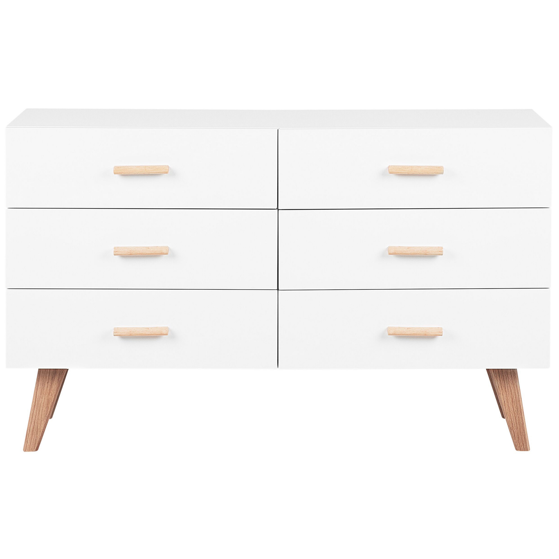 Ordnung dank viel Stauraum und zugleich dekoratives und modernes Design - die funktionale Kommode macht es möglich. Die zeitlose Formgebung in schlichtem Weiss ist harmonisch abgestimmt mit den schlanken, leicht schräg stehenden Beinen aus hellem Eichenholz. Die hellen, frischen Farben vermitteln eine freundliche Ausstrahlung. Sechs praktische und geräumige Schubladen mit den Innenmassen bieten viel Platz zur Aufbewahrung.  Material: MDF-Platte. Zusätzliches Material: Eichenholz.  Gewicht: 55 Montage: Nicht montiert Holzart: Quercus variabilis Holzursprung: China Beine Höhe: 20 Das Angebot beinhaltet: 1 x Kommode Höhe: 75 Breite: 120 Tiefe: 42 Art: Kommode mit 6 Schubladen Stil: Retro Allgemeine Farbe: Weiss Hauptmaterial: MDF-Platte