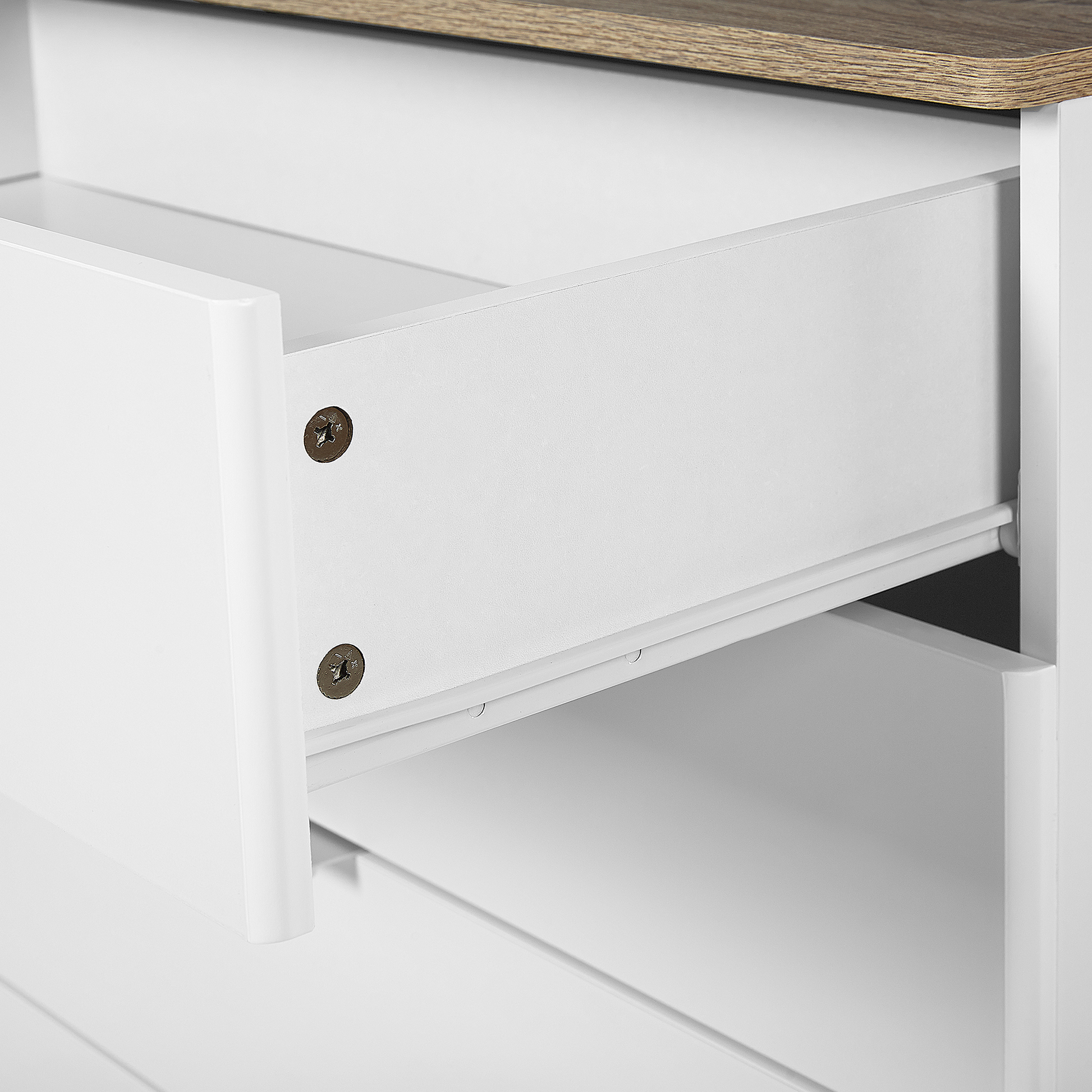 Description: Dieses elegante Sideboard vereint skandinavisches und modernes Design mit natürlichen Elementen, die jedem Wohnraum eine warme und gemütliche Note verleihen. Es ist äusserst funktional und praktisch und kann sowohl im Schlaf-, als auch Wohnzimmer untergebracht werden. Auf dem naturbelassenen Kommodenblatt kommen ausgezeichnet Fotorahmen, Dekoaccessoires und frische Blumen zur Geltung. Die vier weissen Schubladen mit dezenten Metallgriffen bieten viel Stauraum für Kleidungsstücke, Tischdecken, Handtücher und nützliche Utensilien. Die Beine aus qualitativem Kiefernholz garantieren eine grosse Standsicherheit und runden den Look der Anrichte optisch ab. Material: MDF-Platte. Zusätzliches Material: Stahl, Kiefernholz. Gewicht: 31 Montage: Nicht montiert Holzart: Pinus massoniana Holzursprung: China Beine Höhe: 22 Das Angebot beinhaltet: 1 x Kommode Höhe: 93 zusätzliche Information: Um die Haltbarkeit und die Ästhetik der Arbeitsplatte zu erhalten, sollte man Platzsets und Untersetzer verwenden und feuchte Stellen schnellstmöglich trocken wischen, um Produktschäden zu vermeiden. Breite: 79 Tiefe: 40 Art: Kommode mit 4 Schubladen Stil: Modern Allgemeine Farbe: Weiss Hauptmaterial: MDF-Platte