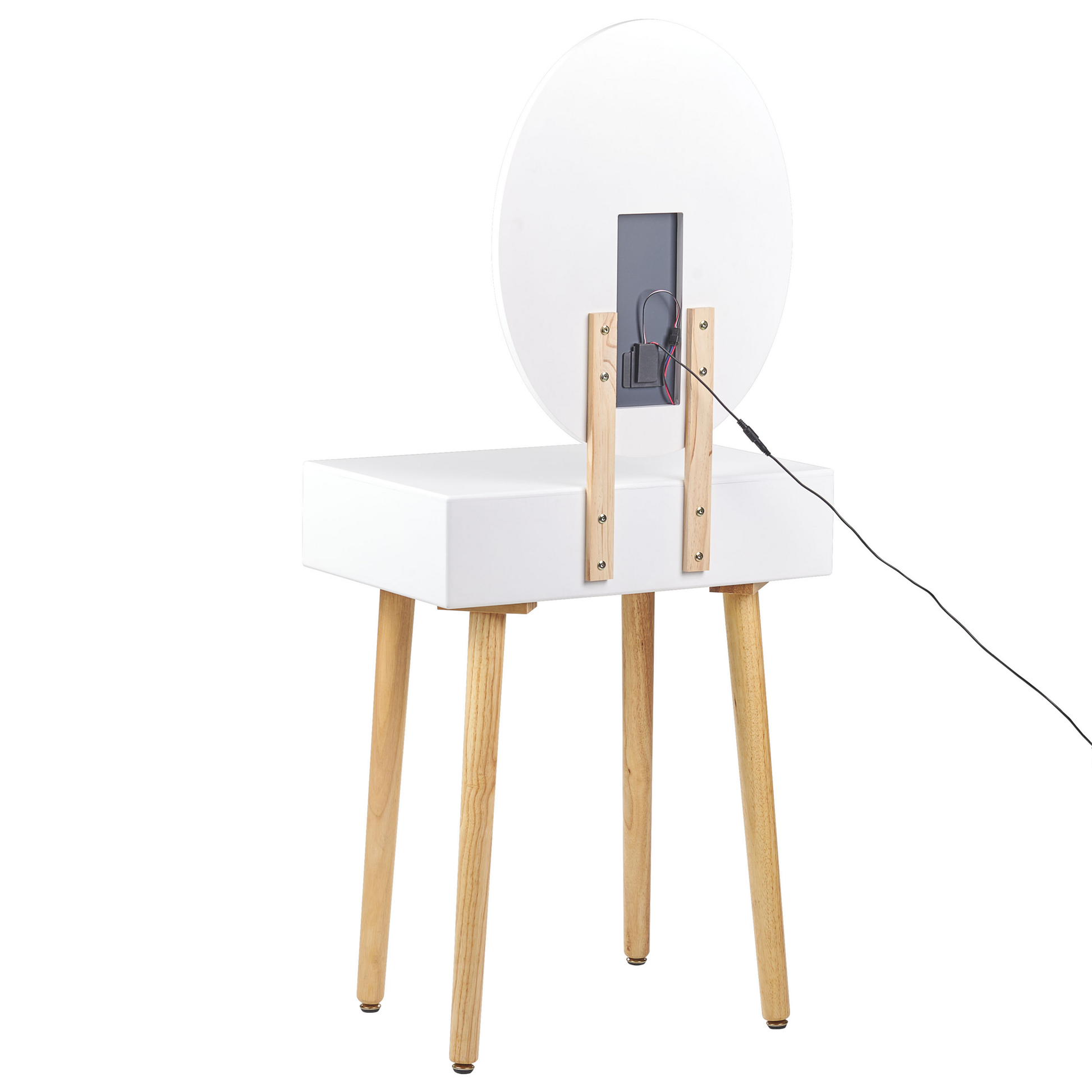 Mit diesem Schminktisch-Set können Sie sich Ihre eigene Schönheitsecke einrichten, selbst wenn Sie nur wenig Platz haben. Trotz seiner kompakten Grösse ist dieser Tisch äusserst praktisch und verfügt über eine Schublade mit Trennfächern und einen Lichtspiegel. Der Rahmen ist mit einem LED-Panel ausgestattet, das natürliches, warmes oder kühles Licht ausstrahlt, so dass Sie die Lichtfarbe Ihren Bedürfnissen anpassen können. Der gepolsterte Hocker mit den passenden Beinen aus leichtem Gummibaumholz bietet einen bequemen Sitzplatz.  Material: Faserplatte. Zusätzliches Material: Gummibaumholz, Glas, Kunstleder.  Gewicht: 17 Montage: Nicht montiert Holzart: Havea brasiliensis Gesamtabmessungen: 60x40x137 Osmanische Dimensionen: 38x25x43 Das Angebot beinhaltet: 1 x Hocker, 1 x Schminktisch Höhe: 137 Breite: 60 Tiefe: 40 Art: Schminktisch Stil: Modern Allgemeine Farbe: Weiss Hauptmaterial: Faserplatte LED Type: SMD 2835