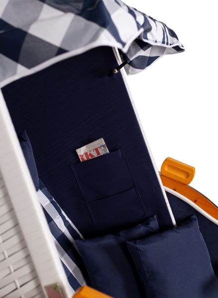 Massivholzgestell / wetterfestes Kunstrattan (weiss) Masse: H:160cm B:120cm T:80cm Gepolsterte Sitzfläche und Rückenlehne aus imprägniertem Markisenstoff 2 klappbare Tische, 2 Nackenkissen, 2 Kuschelkissen, 2 Zeitungstaschen und herausziebare Fussstützen Maximale Belastbarkeit 100 kg pro einzelnen Sitzplatz, Sitzhöhe bei den Strandkörben 50 cm Lieferung erfolgt mit Aufbauanleitung Materialen: Chinesische Tanne Holz und PE Wicker Stoff 100% Polyester