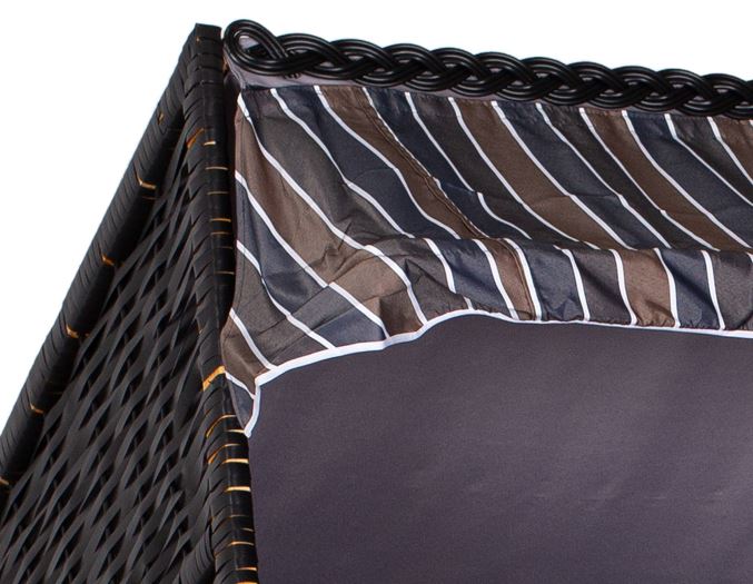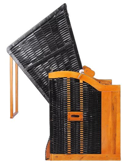 Massivholzgestell / wetterfestes Kunstrattan (schwarz) Masse: H:160cm B:160cm T:80cm Gepolsterte Sitzfläche und Rückenlehne aus imprägniertem Markisenstoff 2 klappbare Tische, 3 Nackenkissen, 3 Kuschelkissen, 2 Zeitungstaschen und 2 herausziebare Fussstützen Maximale Belastbarkeit 100 kg pro einzelnen Sitzplatz, Sitzhöhe bei den Strandkörben 50 cm Lieferung erfolgt mit Aufbauanleitung Materialen: Chinesische Tanne Holz und PE Wicker Stoff 100% Polyester