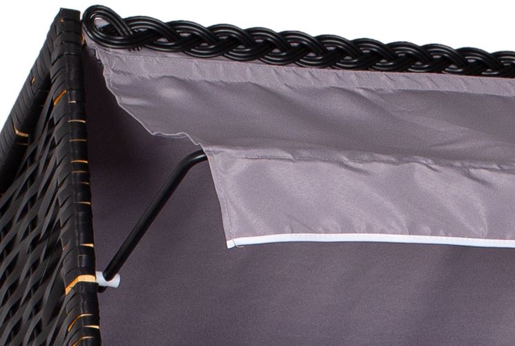 Masse: H:160cm B:160cm T:80cm Gepolsterte Sitzfläche und Rückenlehne aus imprägniertem Markisenstoff 2 klappbare Tische, 3 Nackenkissen, 3 Kuschelkissen, 2 Zeitungstaschen und 2 herausziebare Fussstützen Maximale Belastbarkeit 100 kg pro einzelnen Sitzplatz, Sitzhöhe bei den Strandkörben 50 cm Lieferung erfolgt mit Aufbauanleitung Materialen: Chinesische Tanne Holz und PE Wicker Stoff 100% Polyester