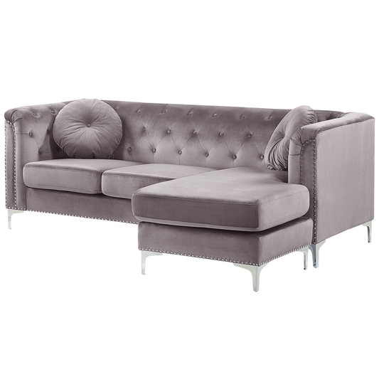 Ecksofa Samtstoff rechtsseitig grau Chesterfield-Design 3-Sitzer FLEN