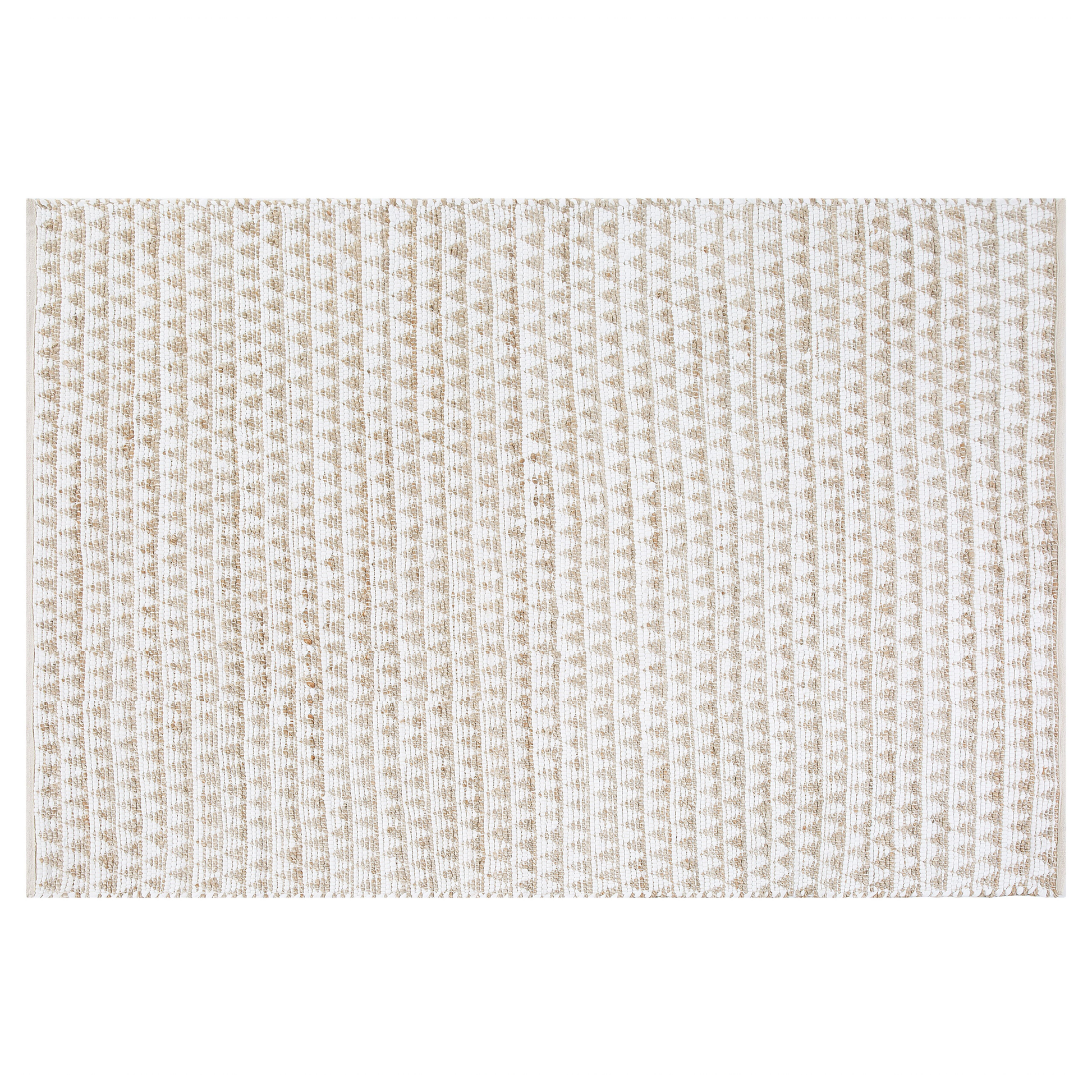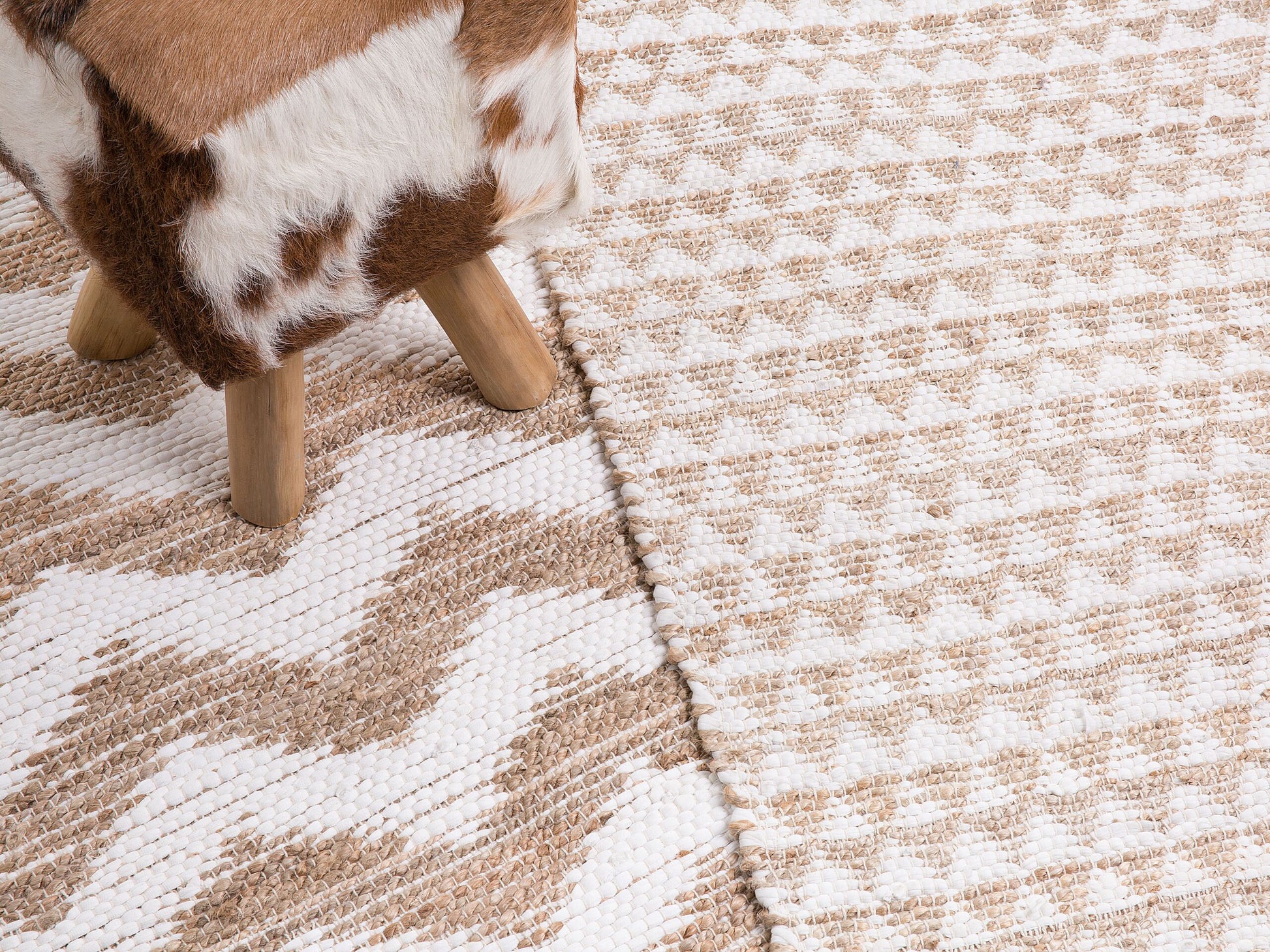 Gemütlichkeit pur mit dem herrlich weichen, handgewebten Vorleger in natürlichen, hellen sowie dunklen Beigetönen in einem klassischen Dreiecksmuster. Der grob gewebte Läufer ist aus Jute und Baumwolle gefertigt. Er verfügt über eine warme, kuschelige Ausstrahlung und überzeugt mit hochwertiger Qualität, pflegeleichtem, strapazierfähigem Material als auch vielseitigen Nutzungsmöglichkeiten.  Material: Baumwolle. Zusätzliches Material: Jute.  Gewicht: 6.5 Montage: Benötigt keine Montage Das Angebot beinhaltet: 1 x Teppich zusätzliche Information: Der Artikel könnte Haare verlieren. Dies ist ein normaler Vorgang und stellt keinen Qualitätsmangel des Produkts dar., Da der Teppich handgewebt ist, können kleine Farb-, Muster-, bzw. Grössendifferenzen auftreten. Diese Unterschiede stellen jedoch keinen Produktfehler dar. Gestalten: Rechteckig Breite: 160 Länge: 230 Art: Teppich Stil: Boho Allgemeine Farbe: Beige Schatten: Hellbeige Muster: Geometrisches Muster Hauptmaterial: Baumwolle Dichte: 2400