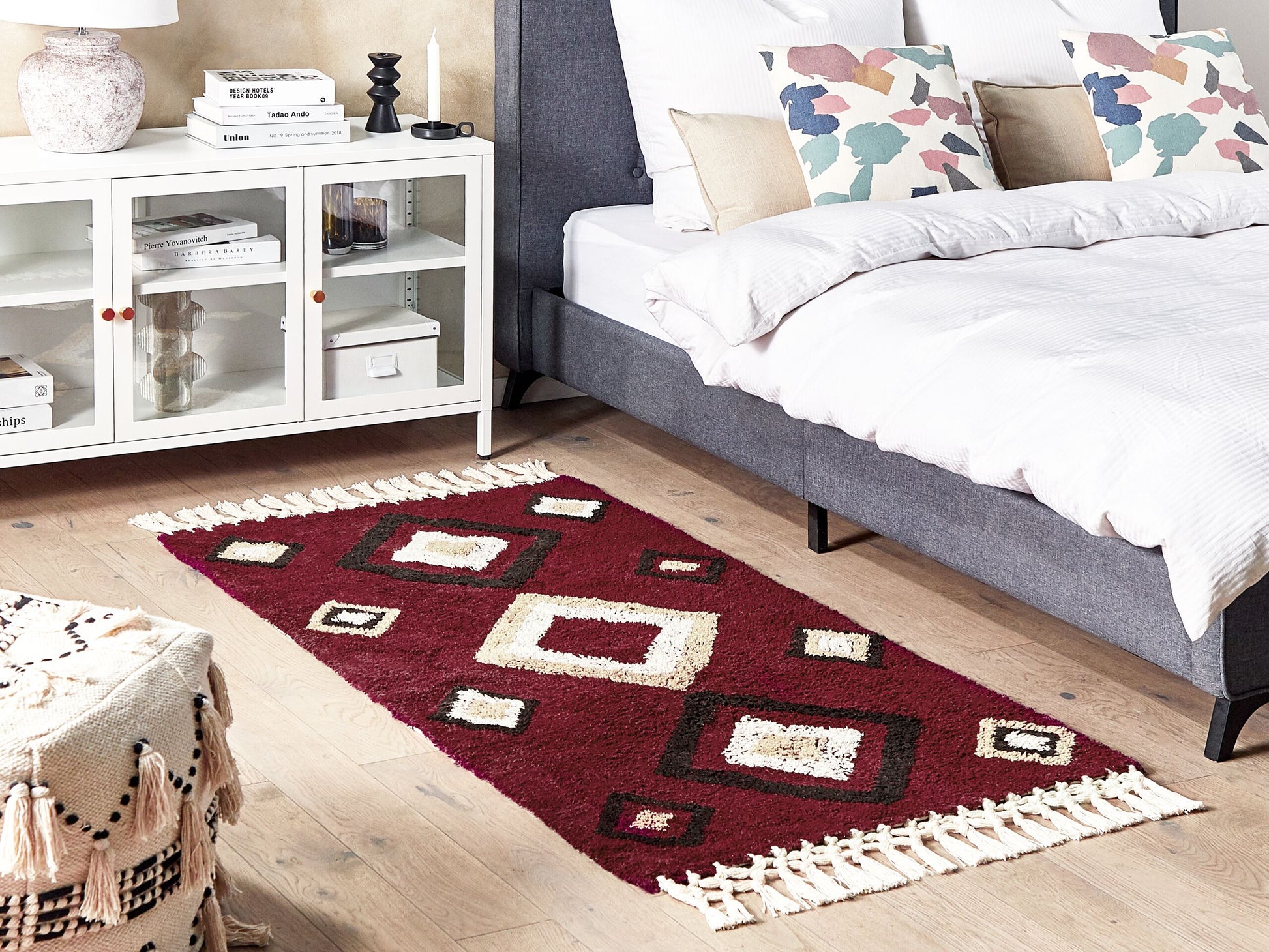 Wenn Sie Ihrem Zuhause einen orientalischen Boho-Touch verleihen möchten, ist dieser Teppich ein absolutes Must-have. Er ist aus strapazierfähiger Baumwolle gefertigt, ist pflegeleicht und hat ein auffälliges Muster. Die Farbkombination aus hellen und dunklen Tönen wird in jedem Wohnraum zum Eyecatcher. Da jeder Teppich handgetuftet ist, ist jedes Exemplar ein Unikat. Material: Baumwolle. Material Zusammensetzung: 100% Baumwolle Gewicht: 2 Montage: Benötigt keine Montage Das Angebot beinhaltet: 1 x Teppich zusätzliche Information: Der Artikel könnte Haare verlieren. Dies ist ein normaler Vorgang und stellt keinen Qualitätsmangel des Produkts dar., Der Artikel benötigt einige Zeit, bis er seinen ursprünglichen Zustand erreicht hat – daher sollte er so schnell wie möglich ausgerollt werden und innerhalb von 72 Stunden seine vollständige Grösse wieder erreichen. Für einen optimalen Effekt sollte man die Teppichkanten mit schweren Gegenständen fixieren., Jeder Artikel ist ein handgefertigtes Unikat; Farbschattierung und Muster können daher vom Foto abweichen., Herstellungstechnik: Beim Handtuftverfahren wird das Garn mit einer speziellen Nadel in das Trägermaterial des Teppichs eingestochen. Dabei wird das Garn nicht so fest in das Trägermaterial eingearbeitet wie bei anderen Methoden (z.B. Webteppiche). Daher können sich manchmal einzelne Fäden lösen. Gestalten: Rechteckig Breite: 80 Länge: 150 Art: Teppich Stil: Boho Allgemeine Farbe: Rot Muster: Geometrisches Muster Hauptmaterial: Baumwolle Dichte: 1650