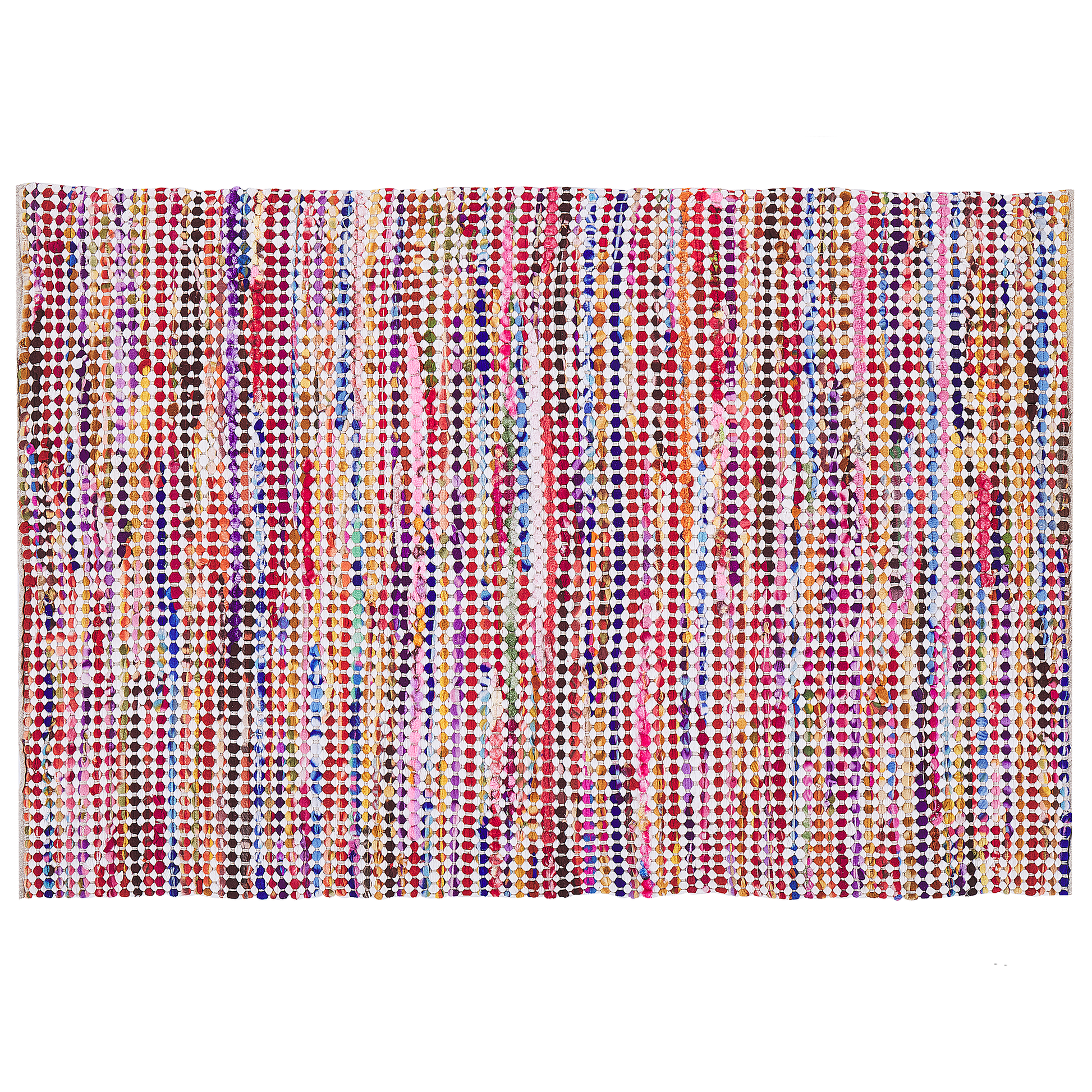 Description: Dieser traumhaft schöne Stoffteppich bezaubert mit seinem abstrakten Muster, das einen fröhlichen und verspielten Look in Ihre Wohnräume zaubert. Er besteht aus hochwertigen Baumwoll- und Polyestergarnen, die sich sehr angenehm unter den Füssen anfühlen und für die Strapazierfähigkeit des Teppichs sorgen. Seine warmen Farbtöne und sein fliessender Farbverlauf mit einem Muster aus kleinen Kreisen, die in geraden Reihen nebeneinander angeordnet sind, machen dieses Farbwunder zu einem richtigen Blickfang. Dank des reichen Farbspiels lässt er sich ausgezeichnet in jeden Einrichtungsstil integrieren und bietet somit besonders vielseitige Nutzungsmöglichkeiten. Zudem ist er mit Liebe zum Detail von Hand gefertigt worden und auch Fussbodenheizung geeignet. Material: Polyester. Zusätzliches Material: Baumwolle. Gewicht: 6 Montage: Benötigt keine Montage Das Angebot beinhaltet: 1 x Teppich zusätzliche Information: Der Artikel könnte Haare verlieren. Dies ist ein normaler Vorgang und stellt keinen Qualitätsmangel des Produkts dar., Da der Teppich handgewebt ist, können kleine Farb-, Muster-, bzw. Grössendifferenzen auftreten. Diese Unterschiede stellen jedoch keinen Produktfehler dar., Der Artikel benötigt einige Zeit, bis er seinen ursprünglichen Zustand erreicht hat – daher sollte er so schnell wie möglich ausgerollt werden und innerhalb von 72 Stunden seine vollständige Grösse wieder erreichen. Für einen optimalen Effekt sollte man die Teppichkanten mit schweren Gegenständen fixieren. Gestalten: Rechteckig Breite: 160 Länge: 230 Art: Teppich Stil: Boho Allgemeine Farbe: Bunt Muster: Abstraktes Muster Hauptmaterial: Polyester