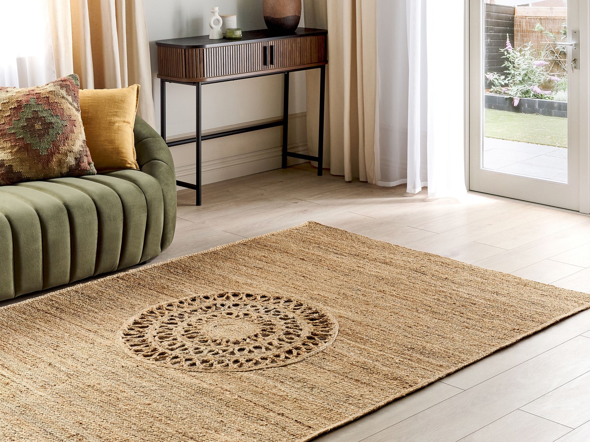 Dieser handgefertigte Juteteppich ist eine dezente, aber dekorative Ergänzung für jeden Fussboden. Mit seinem runden, ausgeschnittenen Muster in der Mitte zieht er garantiert alle Blicke auf sich. Mit seinem natürlichen Jute-Material passt er perfekt in Räume im Boho-Stil oder rustikalen Look. Material: Jute. Material Zusammensetzung: 100% Jute Gewicht: 7 Montage: Benötigt keine Montage Das Angebot beinhaltet: 1 x Teppich zusätzliche Information: Da der Teppich handgewebt ist, können kleine Farb-, Muster-, bzw. Grössendifferenzen auftreten. Diese Unterschiede stellen jedoch keinen Produktfehler dar. Gestalten: Rechteckig Breite: 160 Länge: 230 Art: Teppich Stil: Boho Allgemeine Farbe: Beige Muster: Geometrisches Muster Hauptmaterial: Jute Dichte: 1850/1900