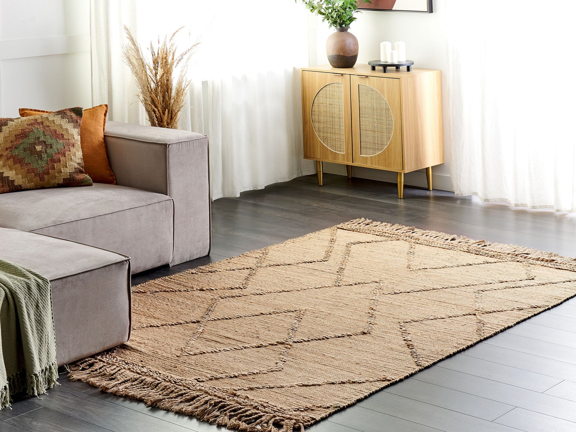 Dieser Fransenteppich ist strapazierfähig, dennoch angenehm weich und verwandelt jeden Wohnbereich in ein gemütliches Boho-Paradies. Er verbindet die Vorteile von langlebigen, natürlichen Jute- und Baumwollfasern bestens miteinander. Dank der Naturfasern kann er in allen stark frequentierten Wohnbereichen eingesetzt werden. Seine langen, hellen Fransen und sein geometrisches Muster lassen sofort Gemütlichkeit in Ihren Räumen aufkommen. Material: Jute. Zusätzliches Material: Baumwolle. Material Zusammensetzung: 80% Jute, 20% Baumwolle Gewicht: 7 Montage: Benötigt keine Montage Das Angebot beinhaltet: 1 x Teppich zusätzliche Information: Da der Teppich handgewebt ist, können kleine Farb-, Muster-, bzw. Grössendifferenzen auftreten. Diese Unterschiede stellen jedoch keinen Produktfehler dar., Der Artikel benötigt einige Zeit, bis er seinen ursprünglichen Zustand erreicht hat – daher sollte er so schnell wie möglich ausgerollt werden und innerhalb von 72 Stunden seine vollständige Grösse wieder erreichen. Für einen optimalen Effekt sollte man die Teppichkanten mit schweren Gegenständen fixieren. Gestalten: Rechteckig Breite: 160 Länge: 230 Art: Teppich Stil: Boho Allgemeine Farbe: Beige Muster: Geometrisches Muster Hauptmaterial: Jute Dichte: 1800-1900