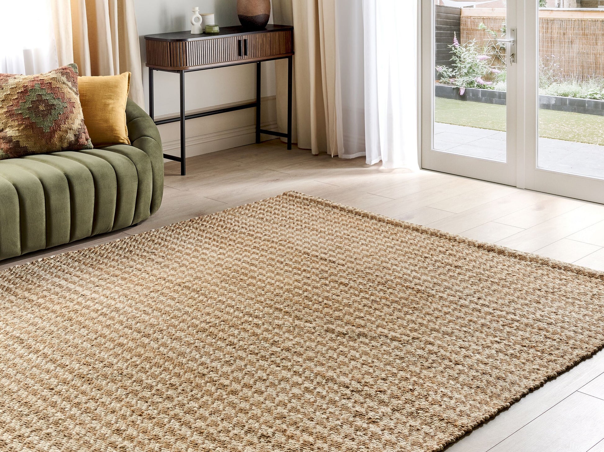 Dieser Wohnzimmerteppich ist die perfekte Verbindung von einem modernen Design und dem zeitlosen Boho-Stil. Der gesamte Teppich besteht aus hochwertigen Jutefasern, die sich nicht nur angenehm weich unter den Füssen anfühlen, sondern auch sehr langlebig und strapazierfähig sind. Dank dieser vorteilhaften Eigenschaften ist er sowohl für leicht als auch stark frequentierte Wohnbereiche geeignet. Dabei ist er in klassischen, hellen Jute-Farbtönen gehalten und mit einem trendigen Hahnentrittmuster versehen, das jeden Blick auf den Teppich lenkt. Dank seiner Grösse kann er in vielen Räumen verwendet werden, vom Wohnzimmer bis zum Schlafzimmer oder Home-Office, und bringt einen frischen, gemütlichen Look mit sich.  Material: Jute. Material Zusammensetzung: 100% Jute Gewicht: 11 Montage: Benötigt keine Montage Das Angebot beinhaltet: 1 x Teppich zusätzliche Information: Da der Teppich handgewebt ist, können kleine Farb-, Muster-, bzw. Grössendifferenzen auftreten. Diese Unterschiede stellen jedoch keinen Produktfehler dar., Der Artikel benötigt einige Zeit, bis er seinen ursprünglichen Zustand erreicht hat – daher sollte er so schnell wie möglich ausgerollt werden und innerhalb von 72 Stunden seine vollständige Grösse wieder erreichen. Für einen optimalen Effekt sollte man die Teppichkanten mit schweren Gegenständen fixieren. Gestalten: Rechteckig Breite: 200 Länge: 300 Art: Teppich Stil: Boho Allgemeine Farbe: Beige Muster: Kariertes Muster Hauptmaterial: Jute Dichte: 3500-3600