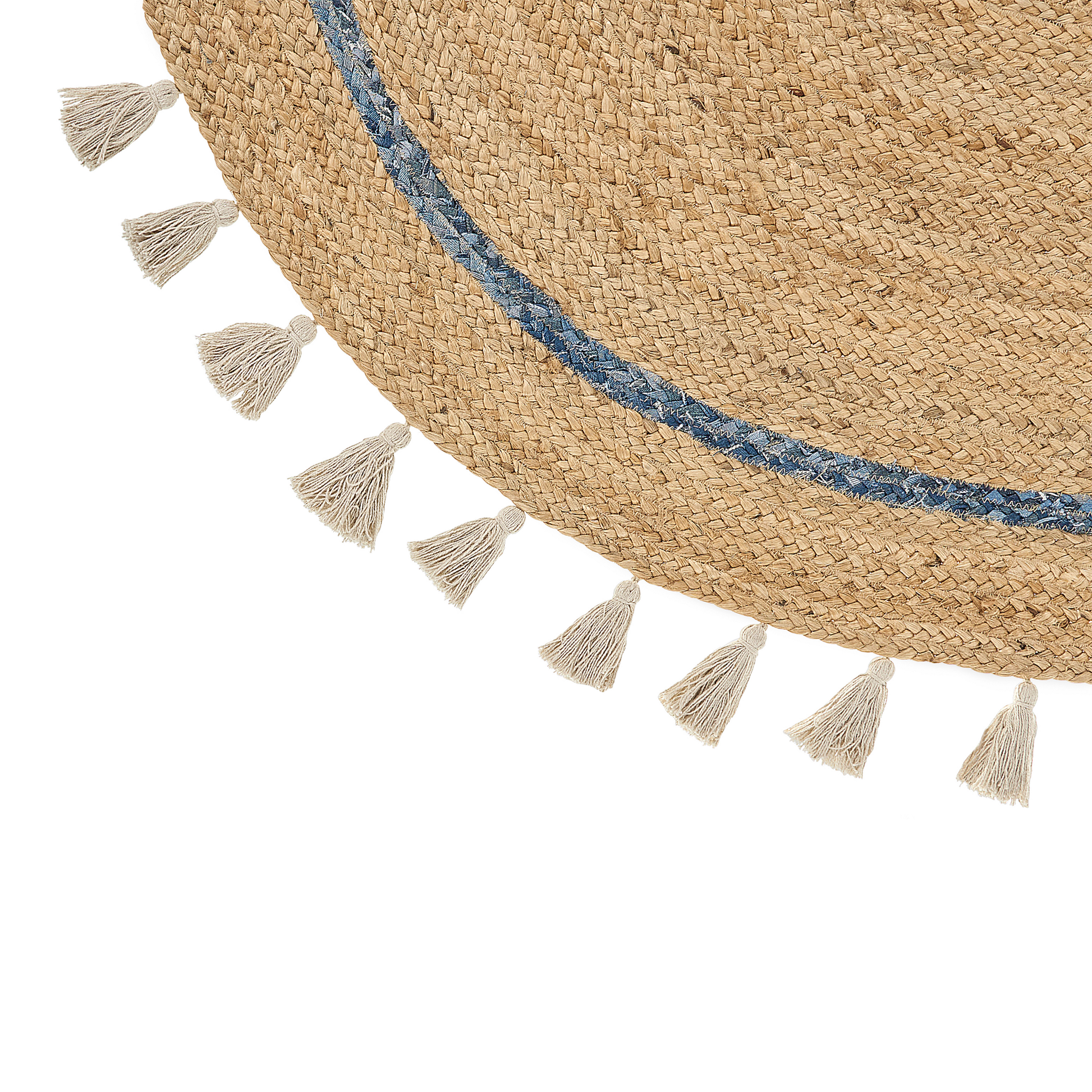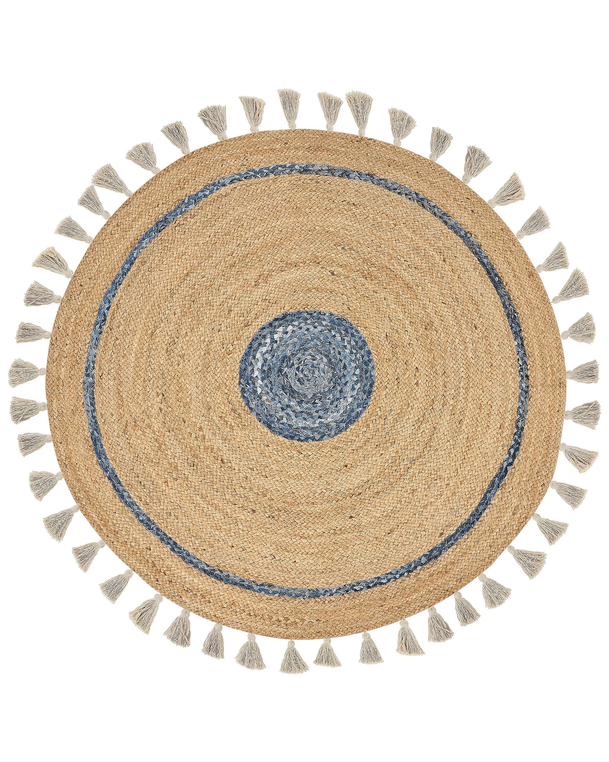Teppich Jute beige / blau ø 140 cm mit Quasten Kurzflor OBAKOY