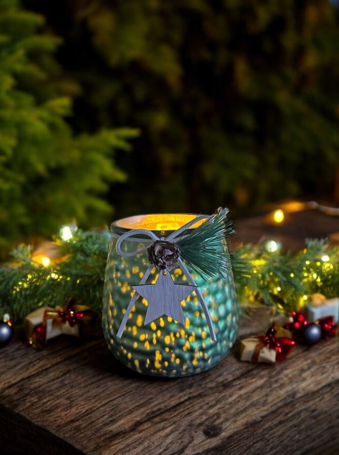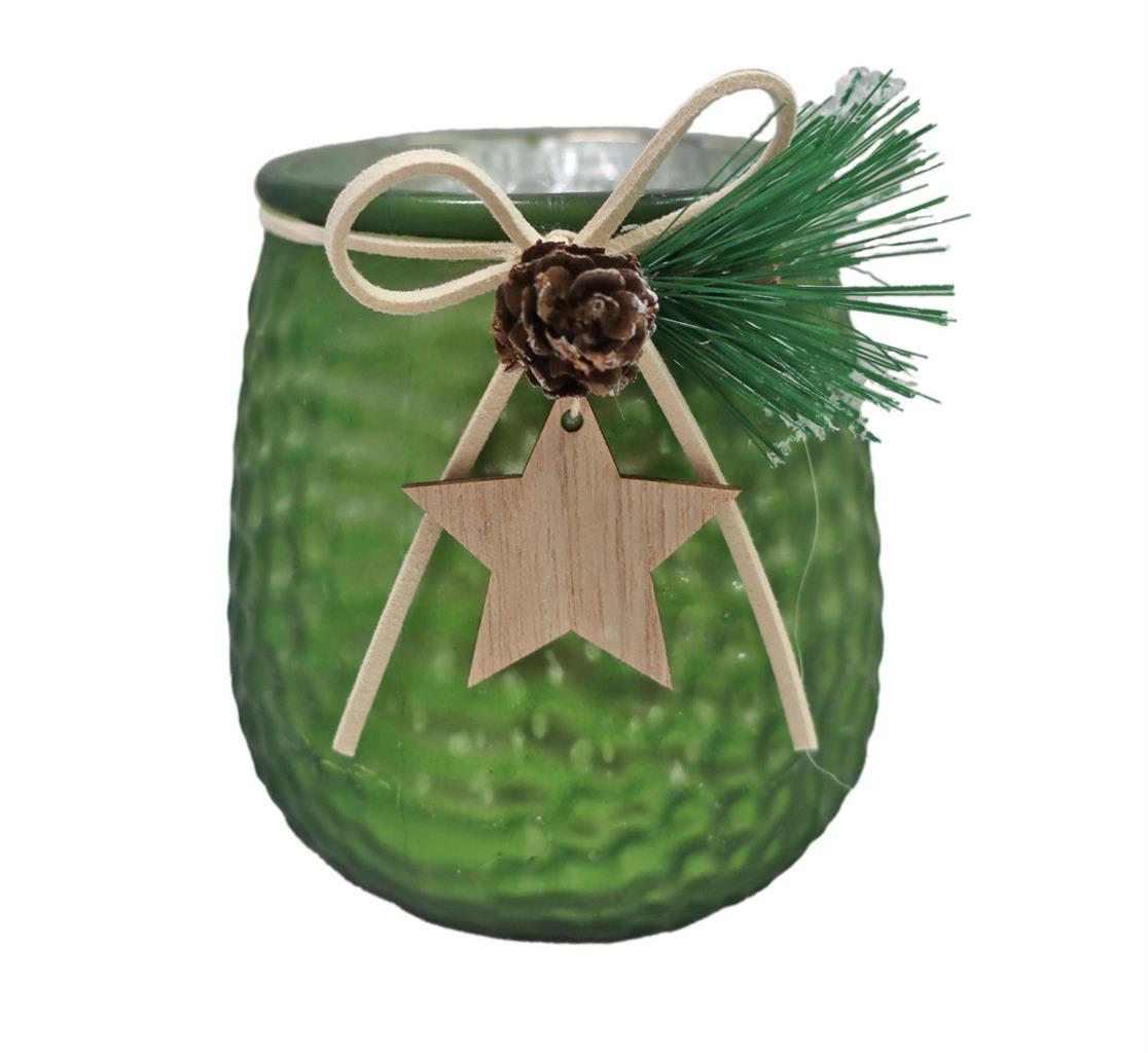 Windlicht Glas grün dekoriert mit Herz Anhänger und Tannzapfen